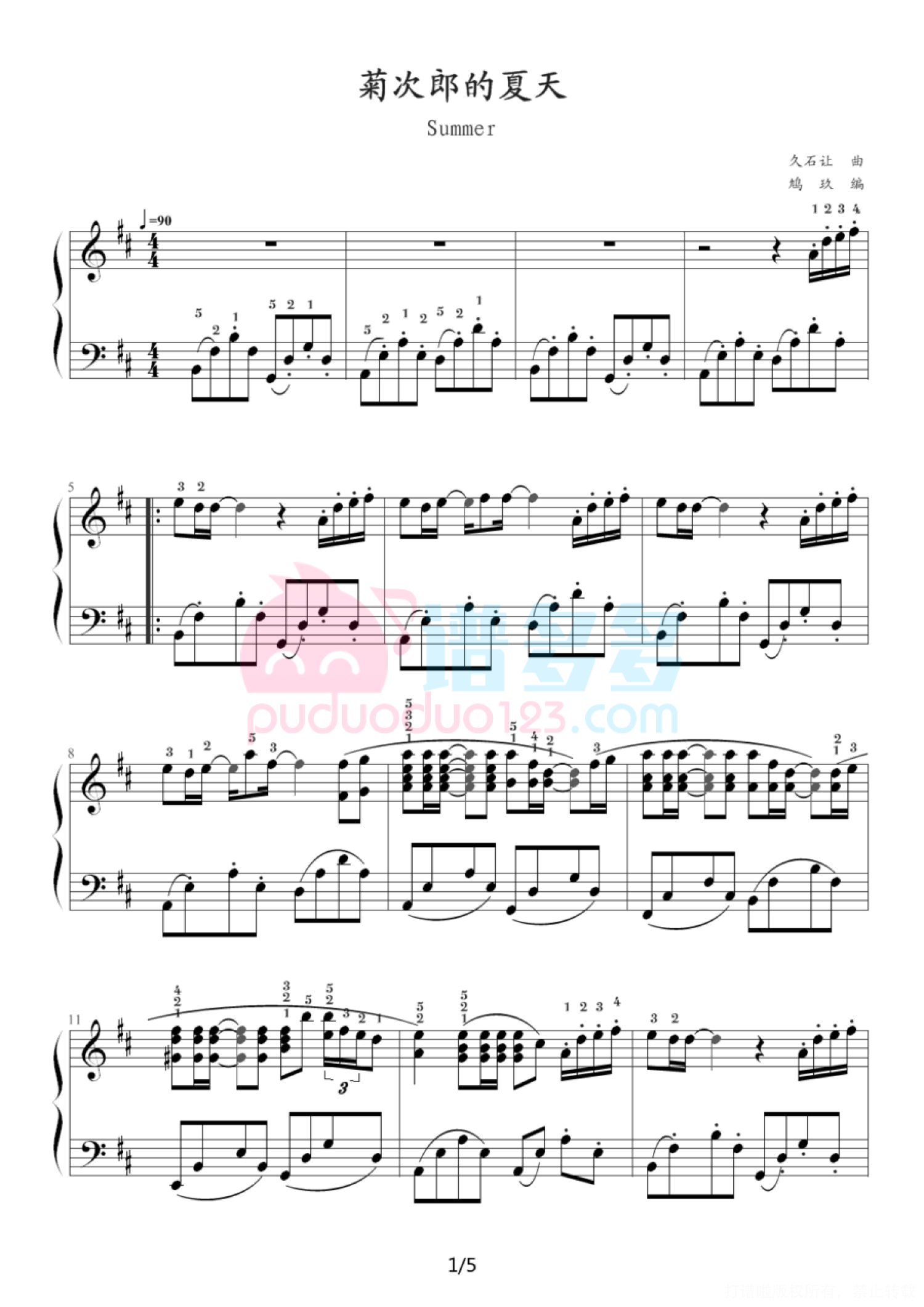 曲谱介绍: summer (电影《菊次郎的夏天》中歌曲)由久石让编曲、谱曲,歌曲时长3分55秒。《菊次郎的夏天》是一部由北野武自编自导自演的清新温情的杰作。主题音乐summer穿插于整个故事中为让人感受到温情的各段情节中,让观众随着音乐感受故事中的惬意,也随着音乐感受剧情发展微微的起伏。