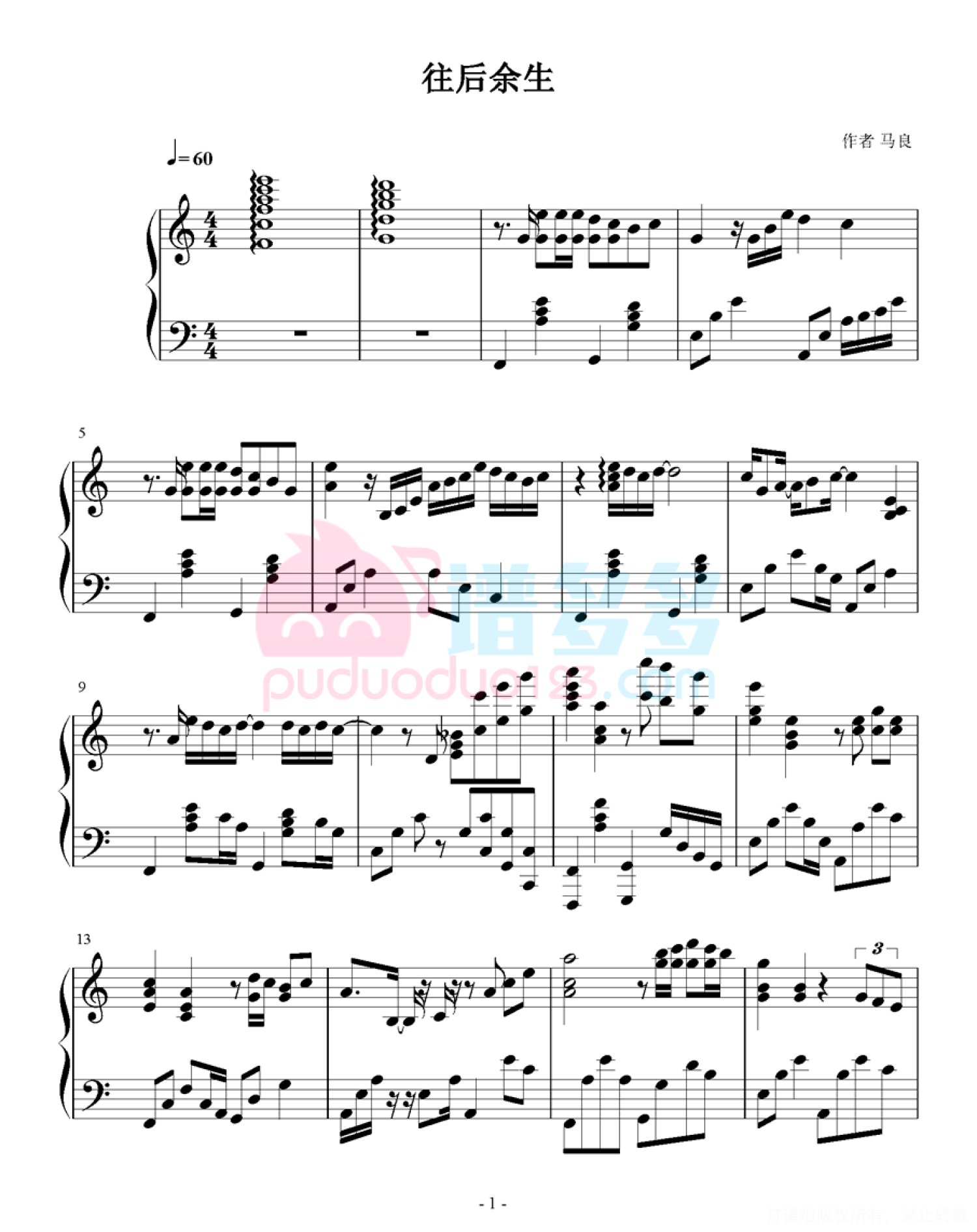 曲谱介绍: 《往后余生》是马良演唱的歌曲,由马良填词、谱曲,郭扬、周成编曲。该曲就像喧嚣繁华过后的一地落寞,让无数听众在庸常的生活里为这首歌里属于自己的故事哭泣,并产生共鸣。
