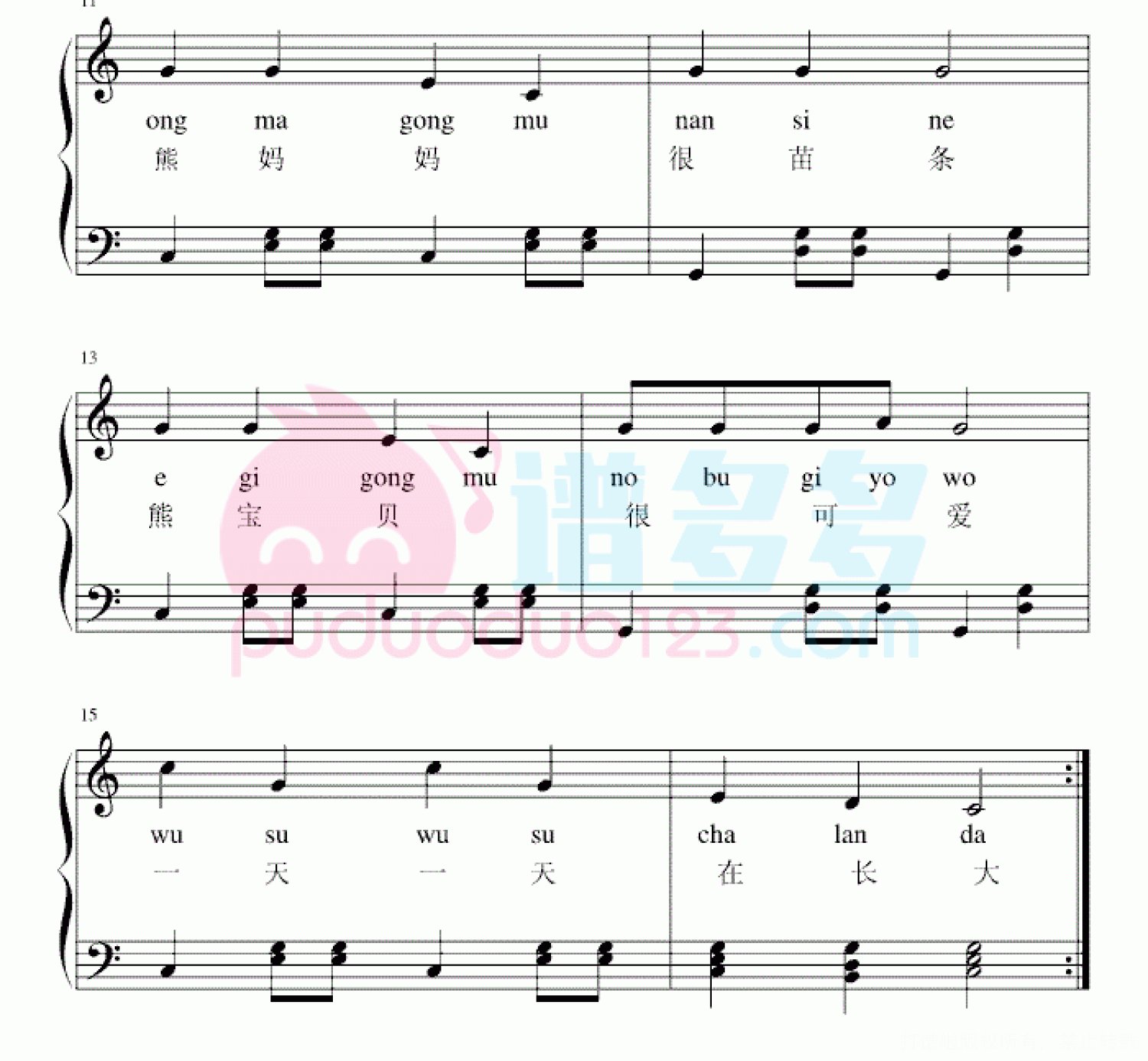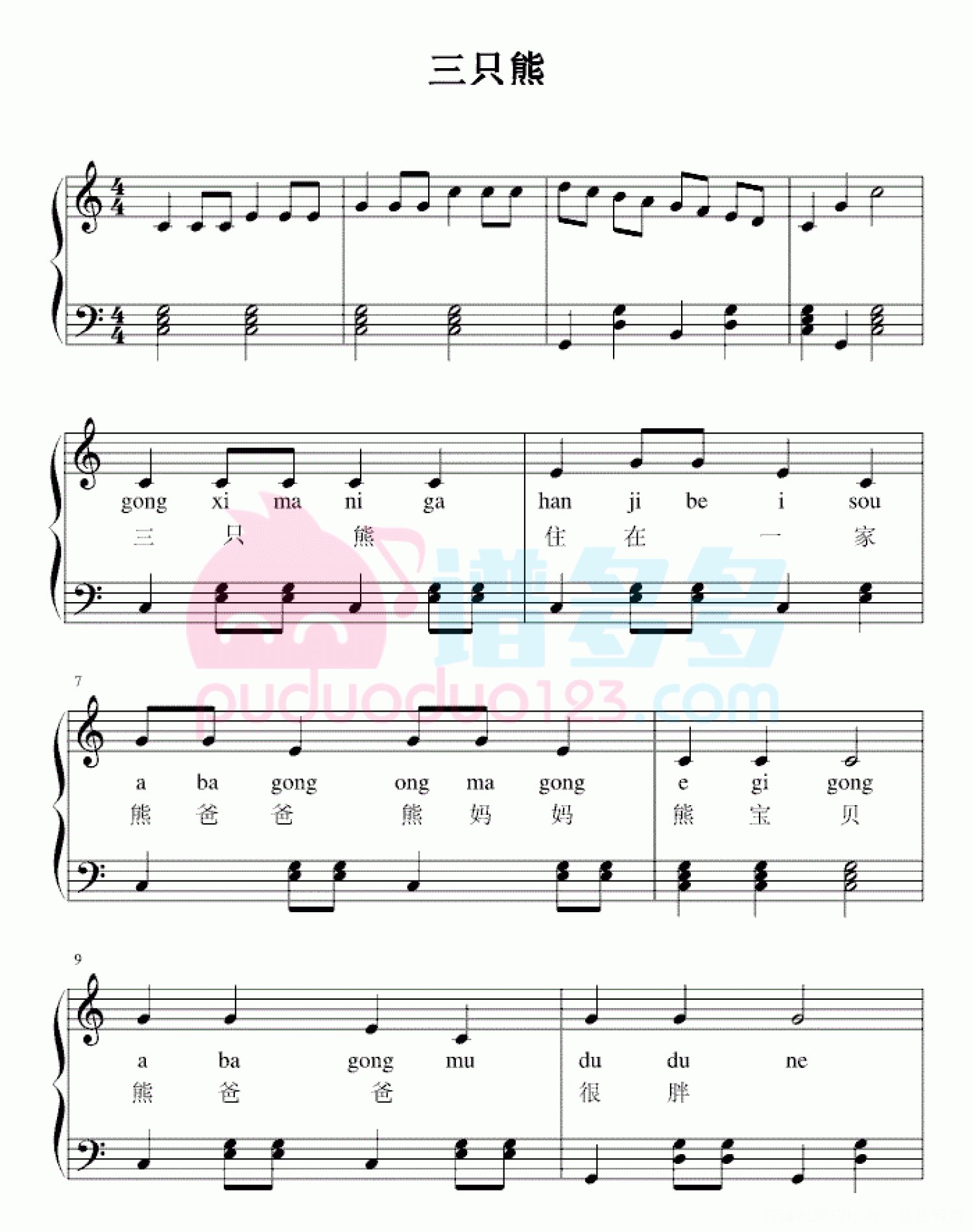 曲谱介绍: 《三只熊》是一首韩国儿歌,来源自电视剧《浪漫满屋》的插曲,由宋慧乔、郑智薰(Rain)、韩恩廷、金圣洙等演出。随着《浪漫满屋》的播出,《三只小熊》也被观众们所熟知。