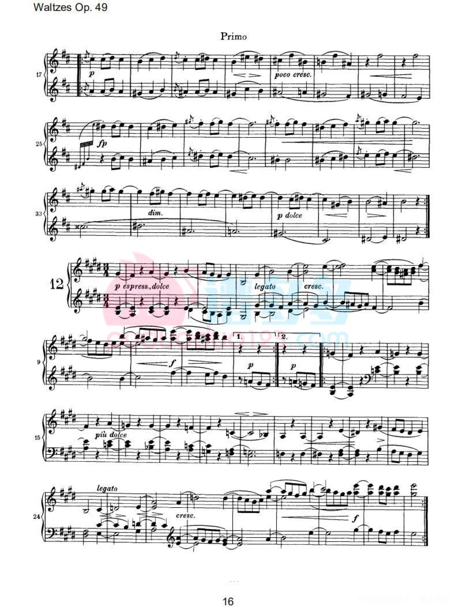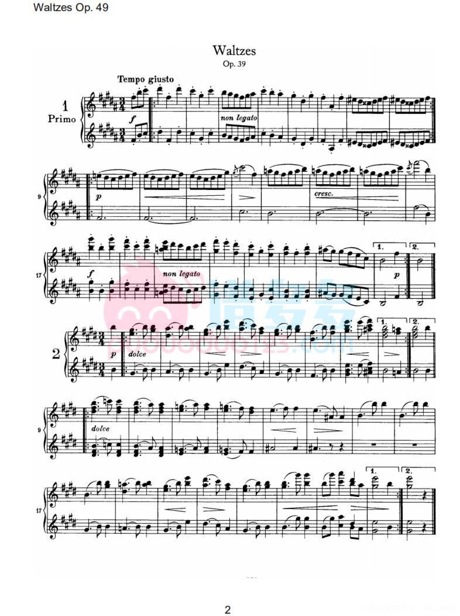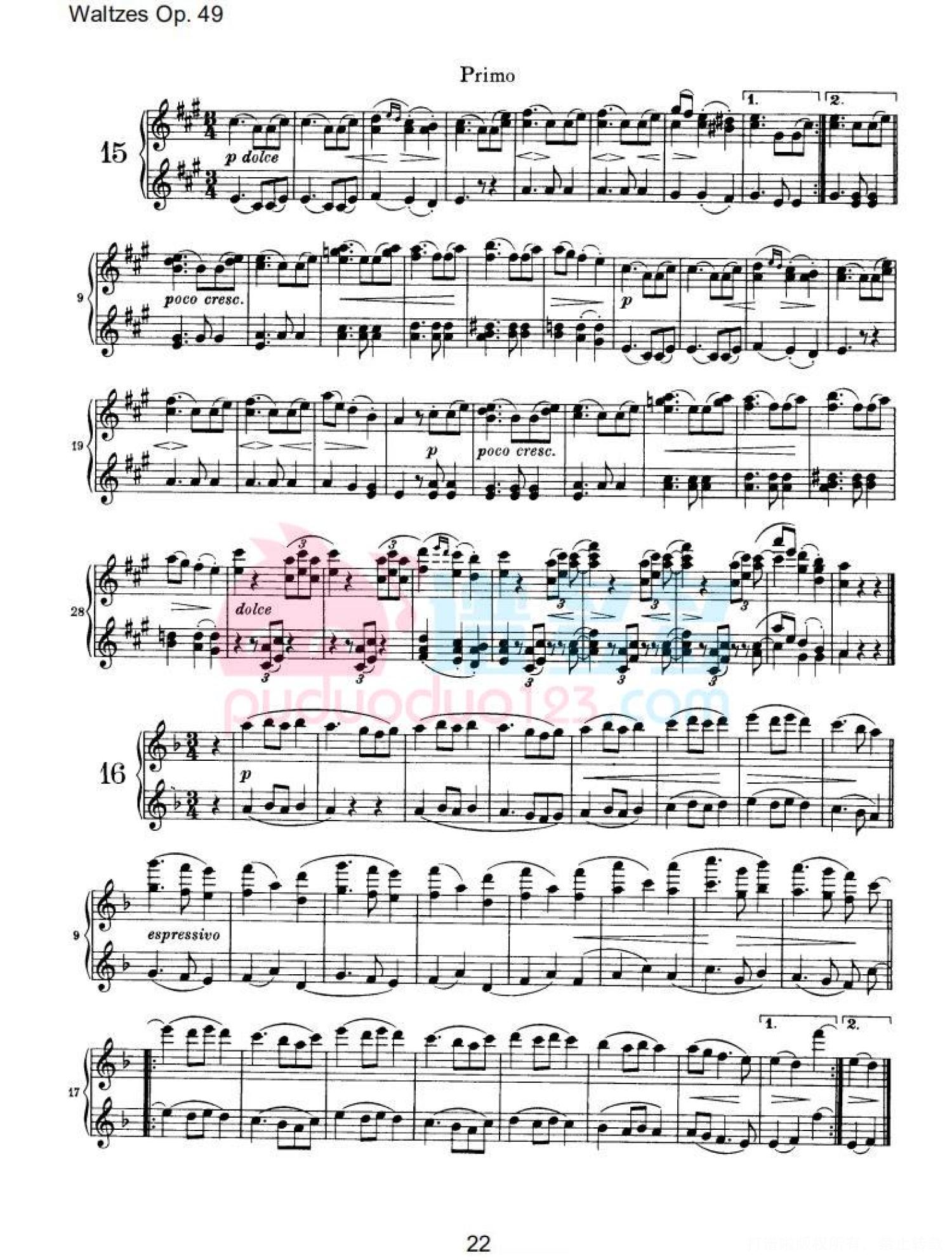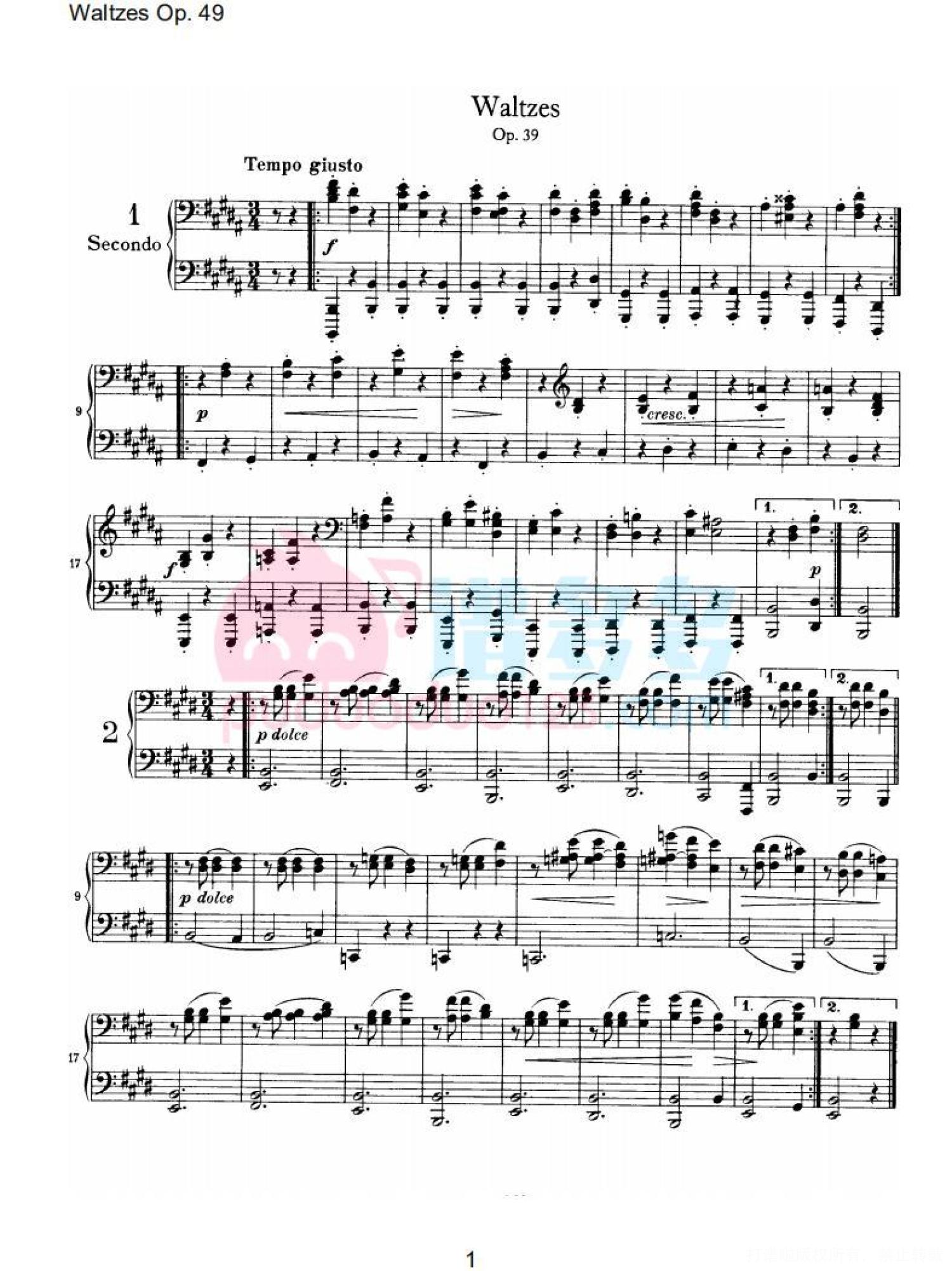 曲谱介绍: 十六首华尔兹作品中Op. 39是一组由约翰内斯·勃拉姆斯(Johannes Brahms)创作的华尔兹钢琴四手曲。专门献给爱德华·汉斯里克(Eduard Hanslick)。 作曲家还为钢琴独奏安排了这些华尔兹舞曲,分为两种版本:困难和简化。与作曲家的预期相反,这三个版本在同一时间出版并卖得很好。在独奏版本中,某些键与原始的二重奏版本有所不同(后四个部分在困难版本中下移了半步,而在简易版本中则移到了第六个)。