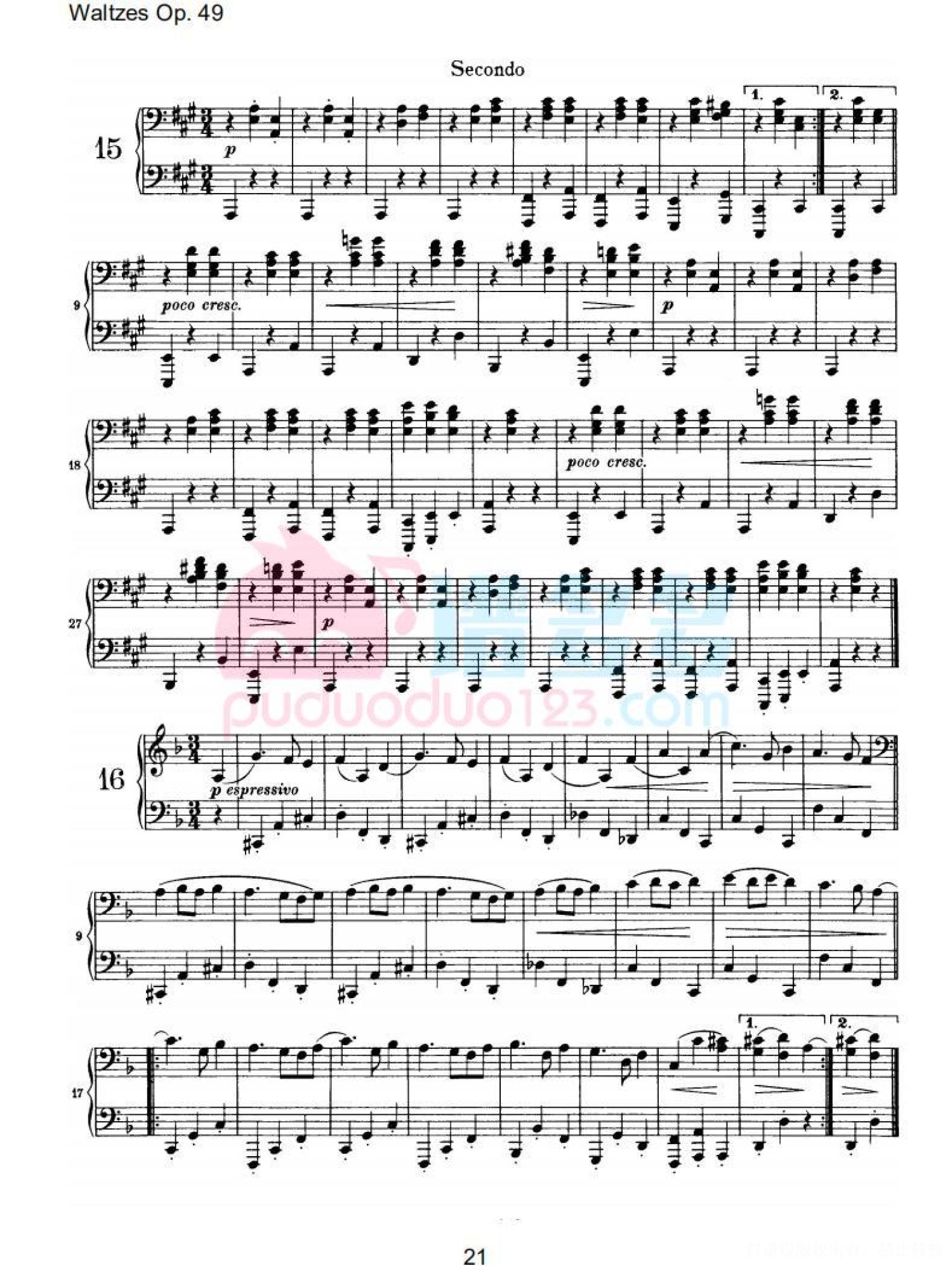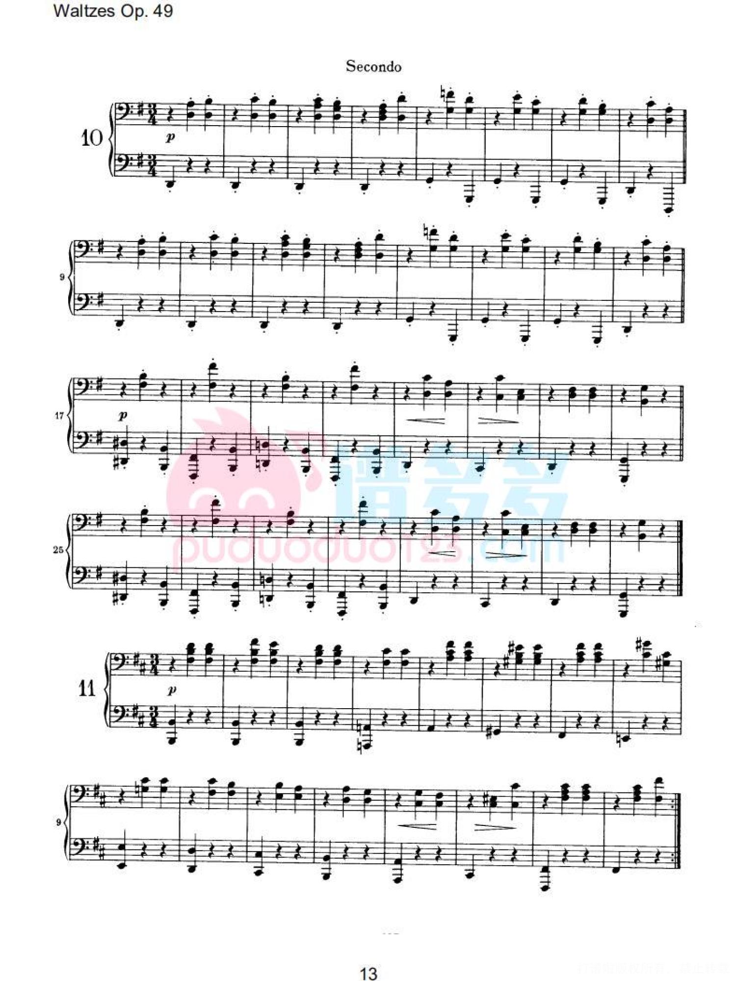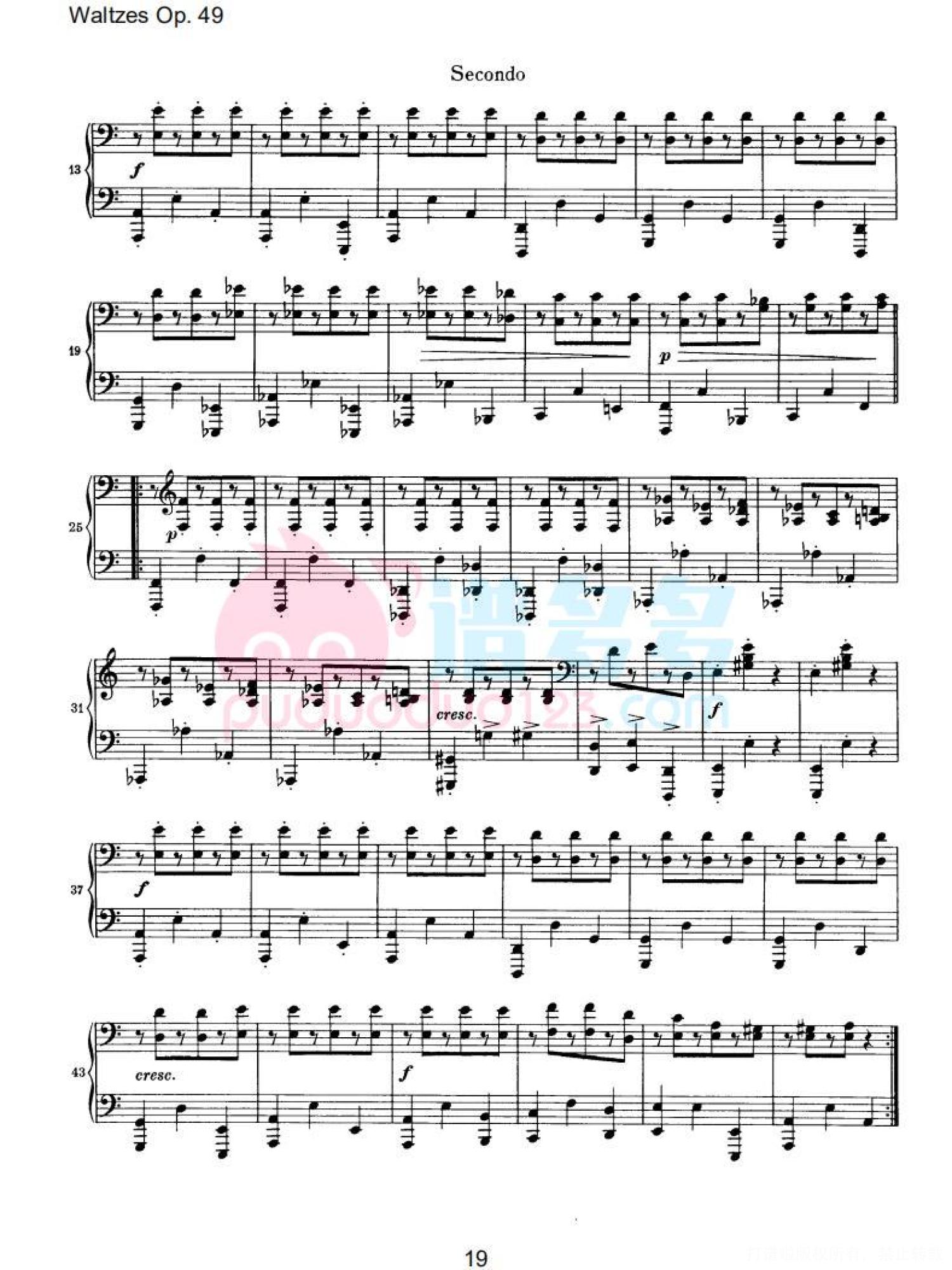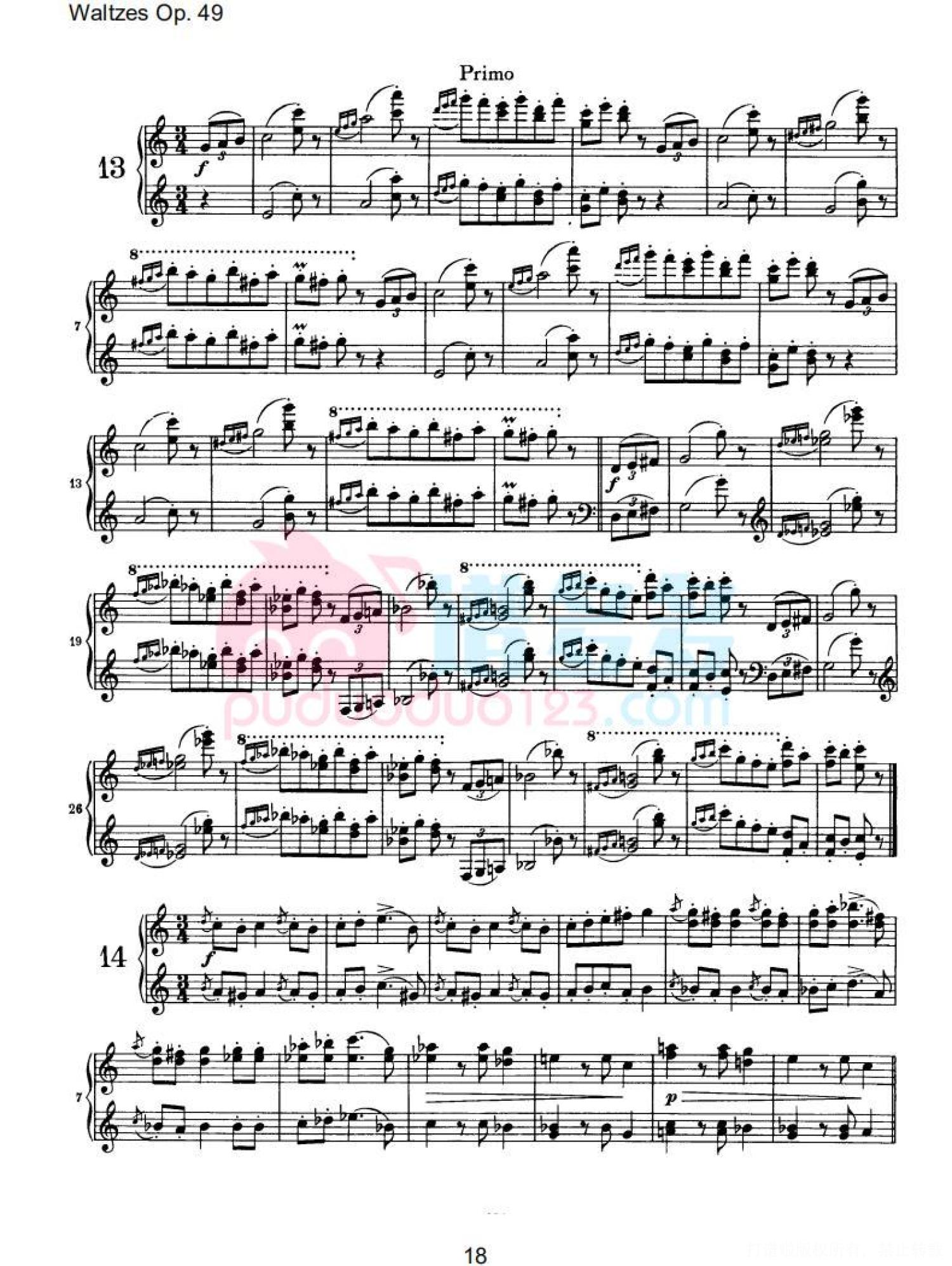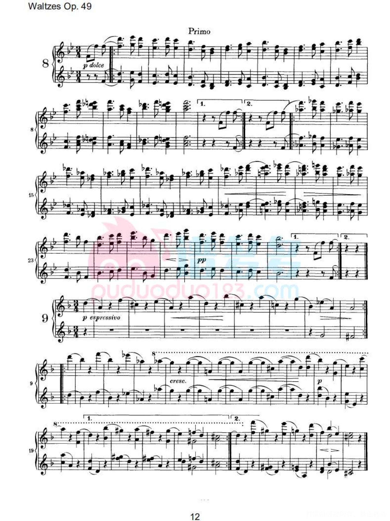 曲谱介绍: 十六首华尔兹作品中Op. 39是一组由约翰内斯·勃拉姆斯(Johannes Brahms)创作的华尔兹钢琴四手曲。专门献给爱德华·汉斯里克(Eduard Hanslick)。 作曲家还为钢琴独奏安排了这些华尔兹舞曲,分为两种版本:困难和简化。与作曲家的预期相反,这三个版本在同一时间出版并卖得很好。在独奏版本中,某些键与原始的二重奏版本有所不同(后四个部分在困难版本中下移了半步,而在简易版本中则移到了第六个)。