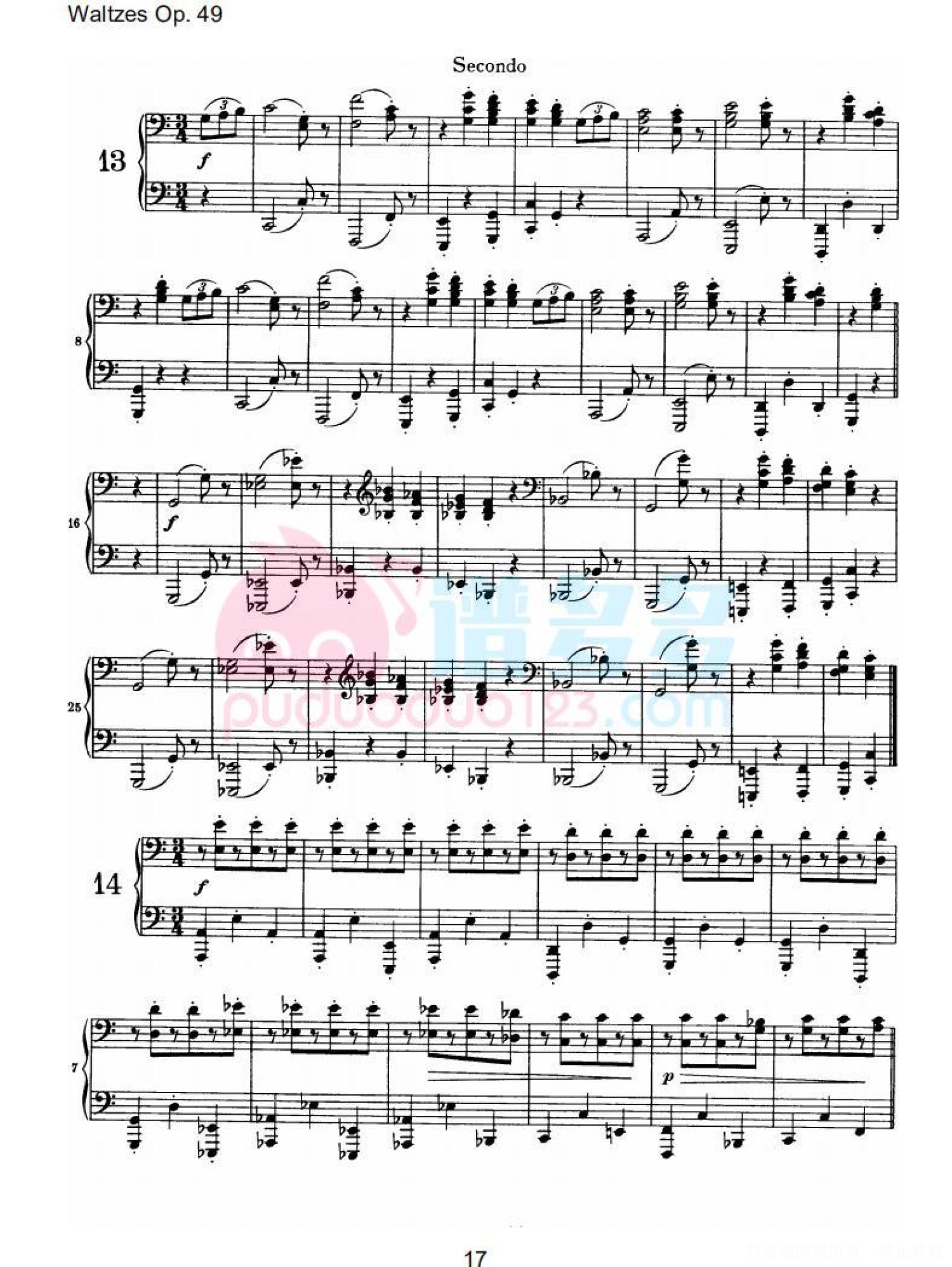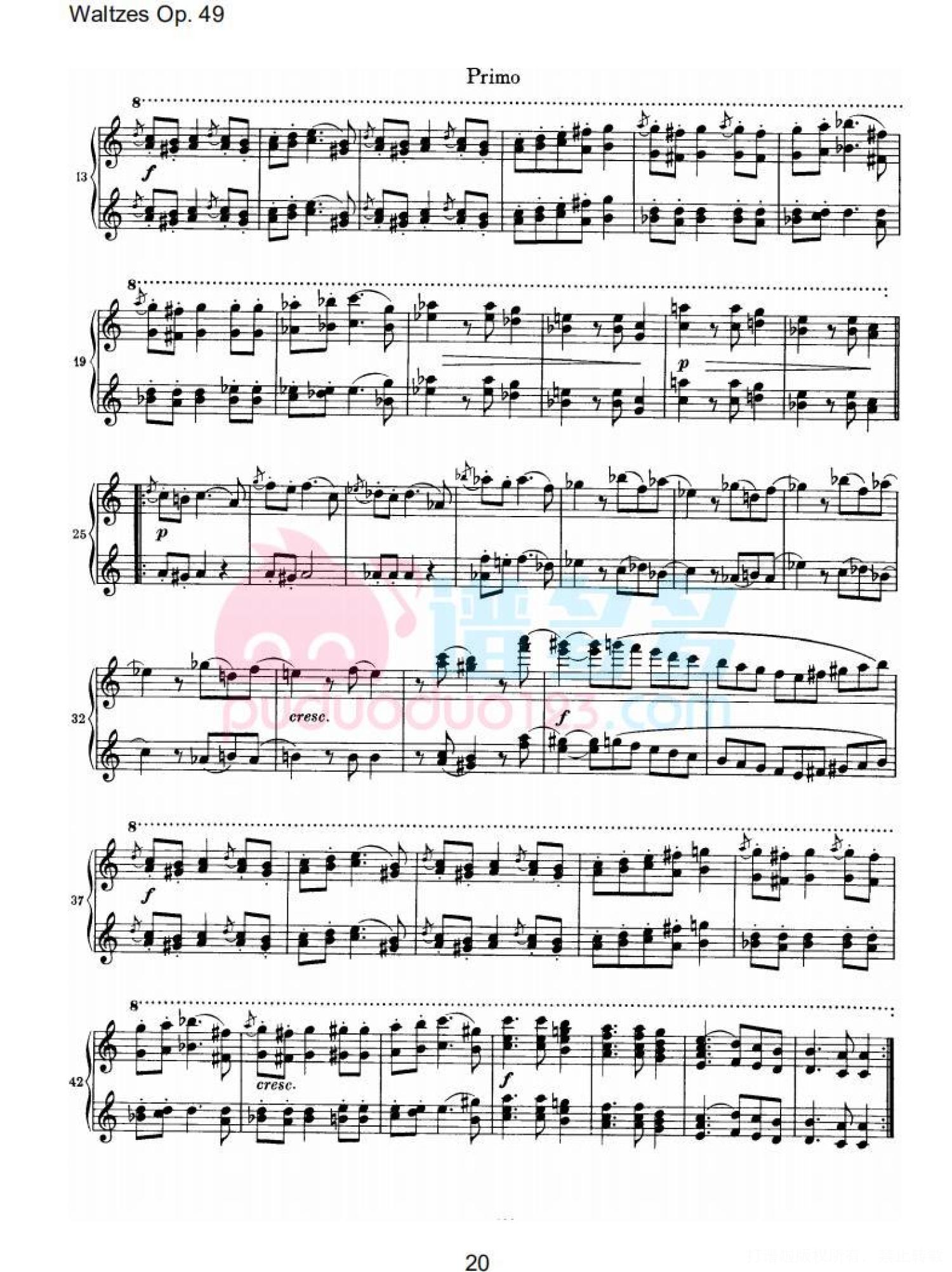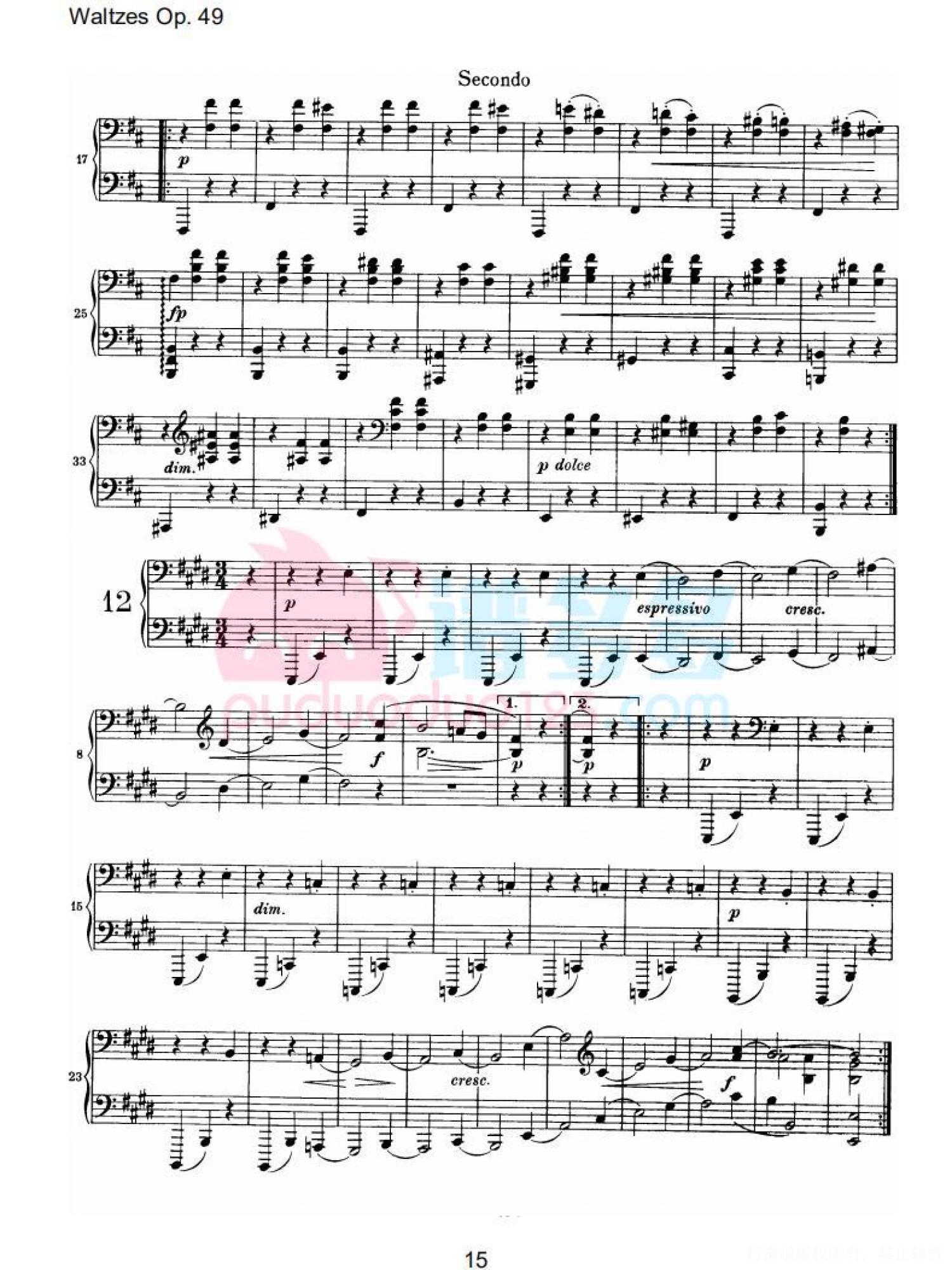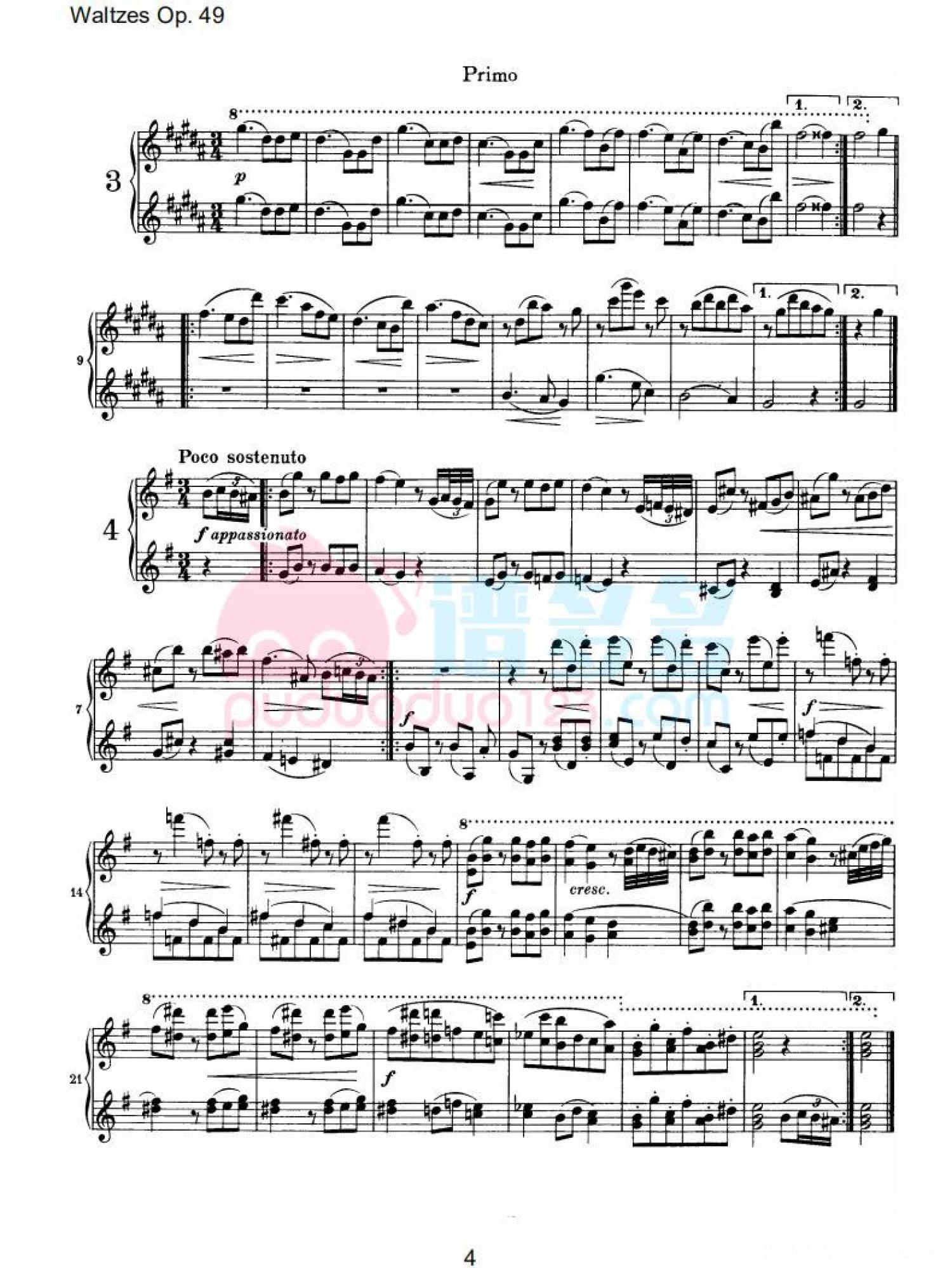 曲谱介绍: 十六首华尔兹作品中Op. 39是一组由约翰内斯·勃拉姆斯(Johannes Brahms)创作的华尔兹钢琴四手曲。专门献给爱德华·汉斯里克(Eduard Hanslick)。 作曲家还为钢琴独奏安排了这些华尔兹舞曲,分为两种版本:困难和简化。与作曲家的预期相反,这三个版本在同一时间出版并卖得很好。在独奏版本中,某些键与原始的二重奏版本有所不同(后四个部分在困难版本中下移了半步,而在简易版本中则移到了第六个)。