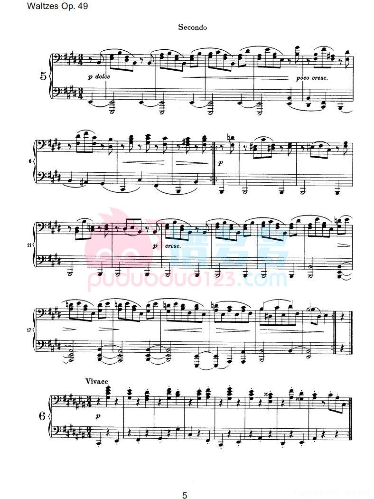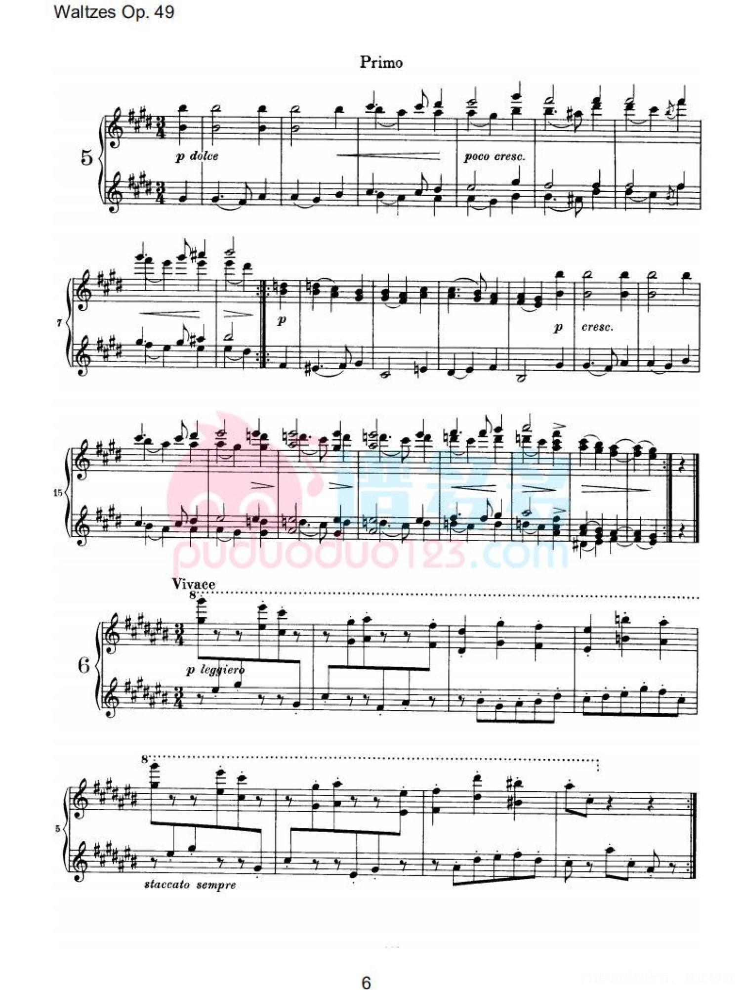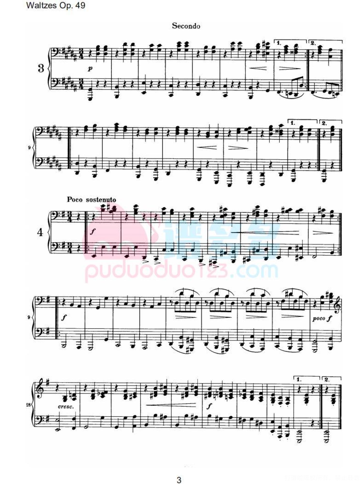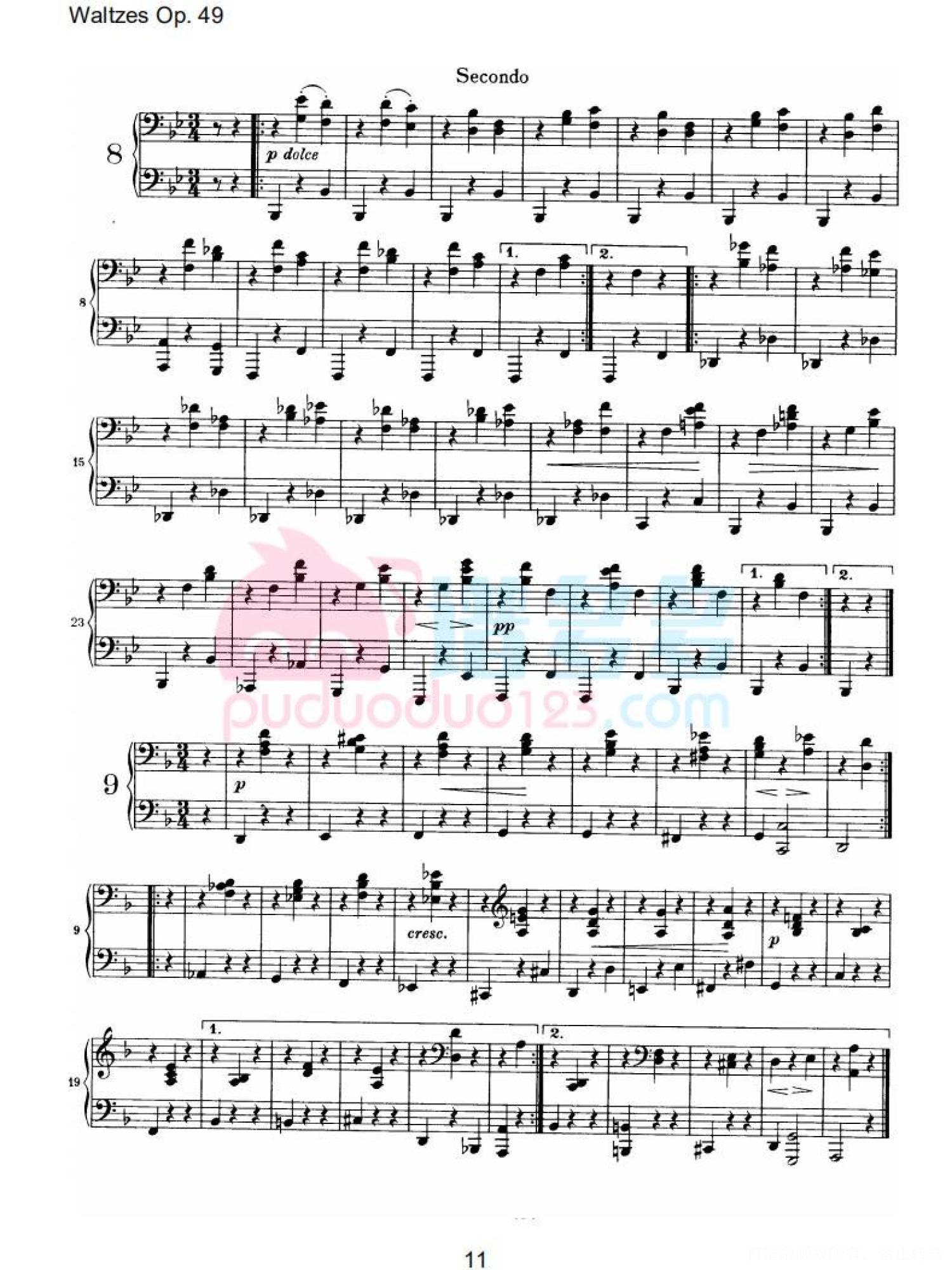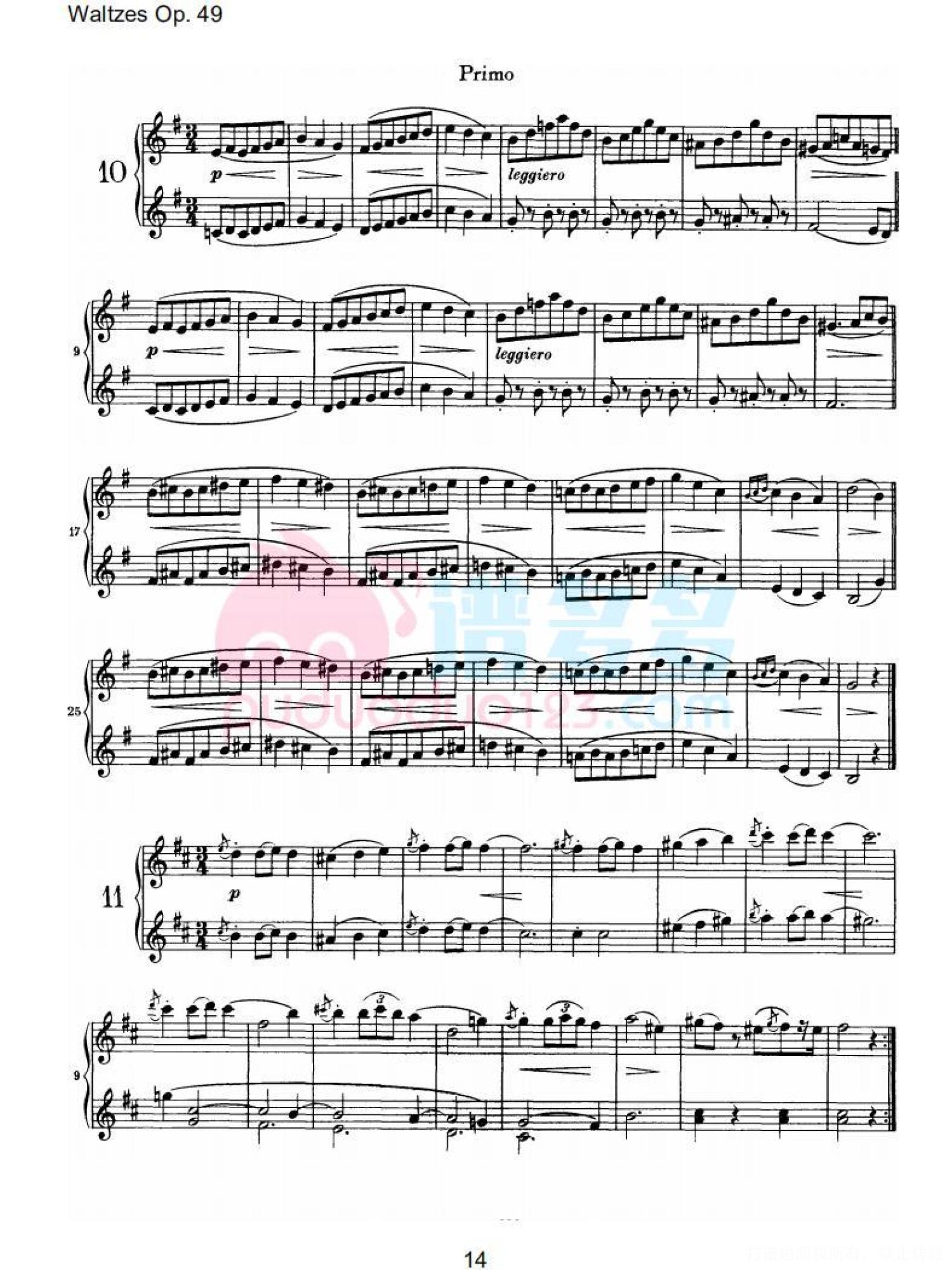 曲谱介绍: 十六首华尔兹作品中Op. 39是一组由约翰内斯·勃拉姆斯(Johannes Brahms)创作的华尔兹钢琴四手曲。专门献给爱德华·汉斯里克(Eduard Hanslick)。 作曲家还为钢琴独奏安排了这些华尔兹舞曲,分为两种版本:困难和简化。与作曲家的预期相反,这三个版本在同一时间出版并卖得很好。在独奏版本中,某些键与原始的二重奏版本有所不同(后四个部分在困难版本中下移了半步,而在简易版本中则移到了第六个)。