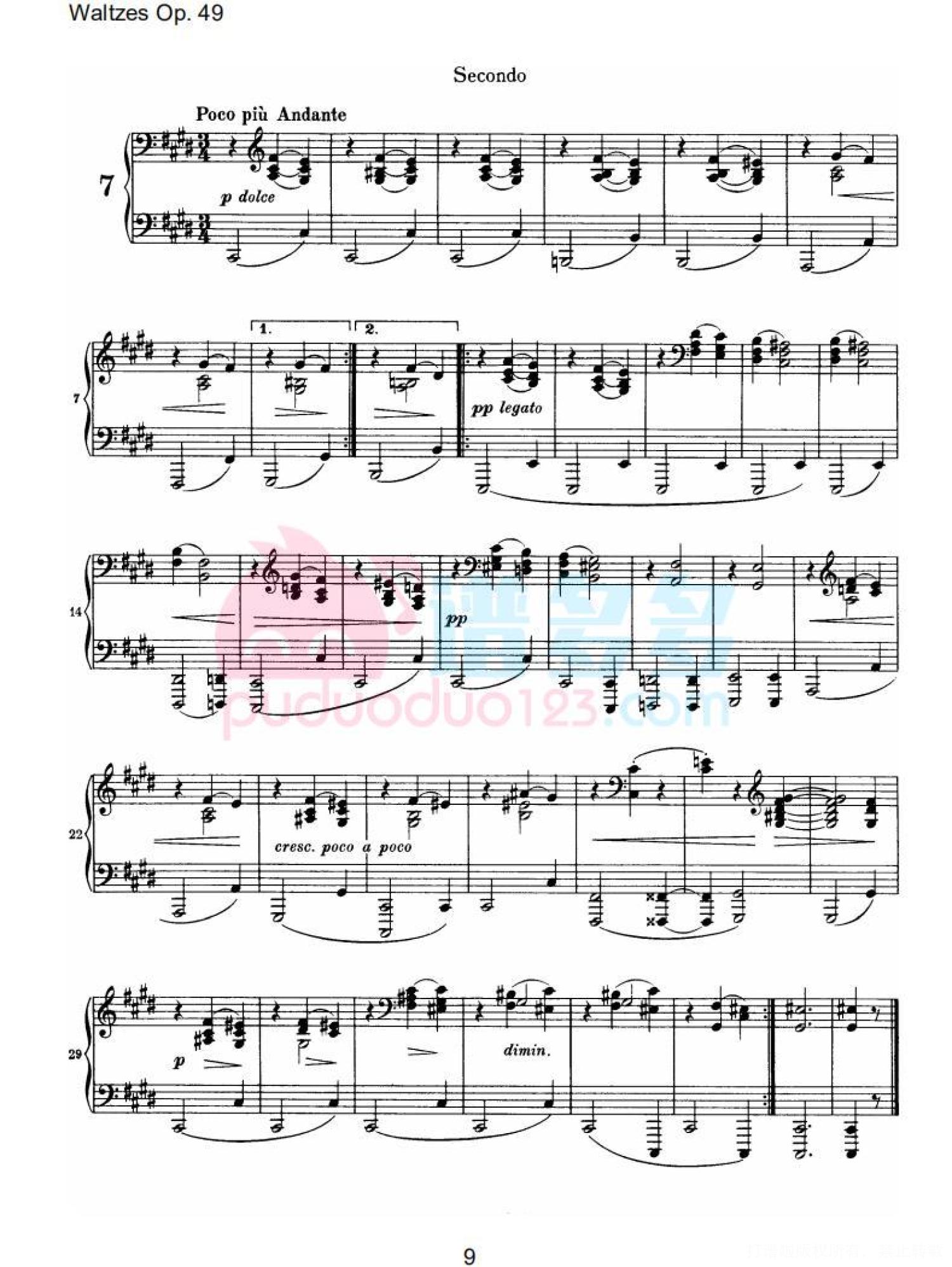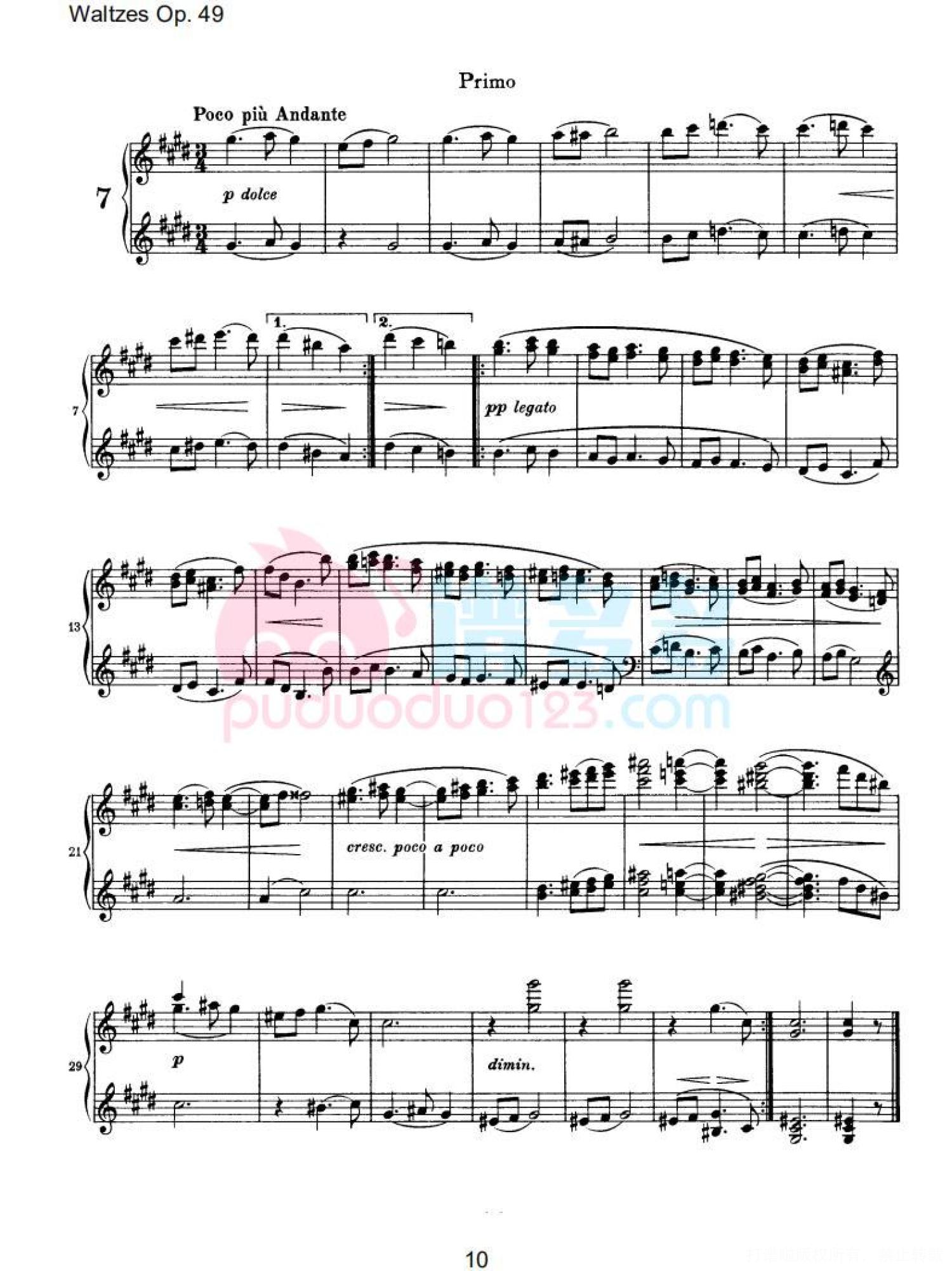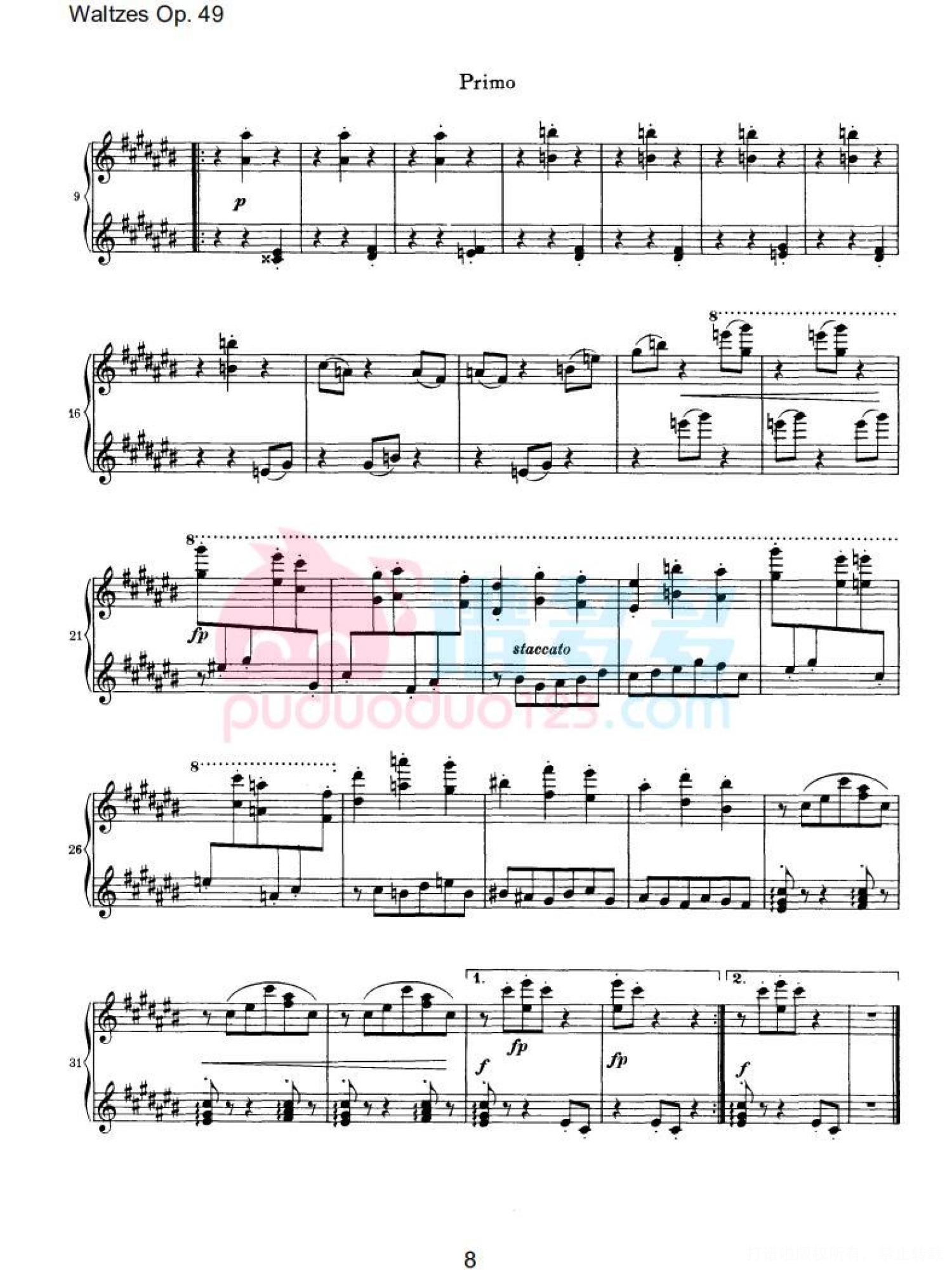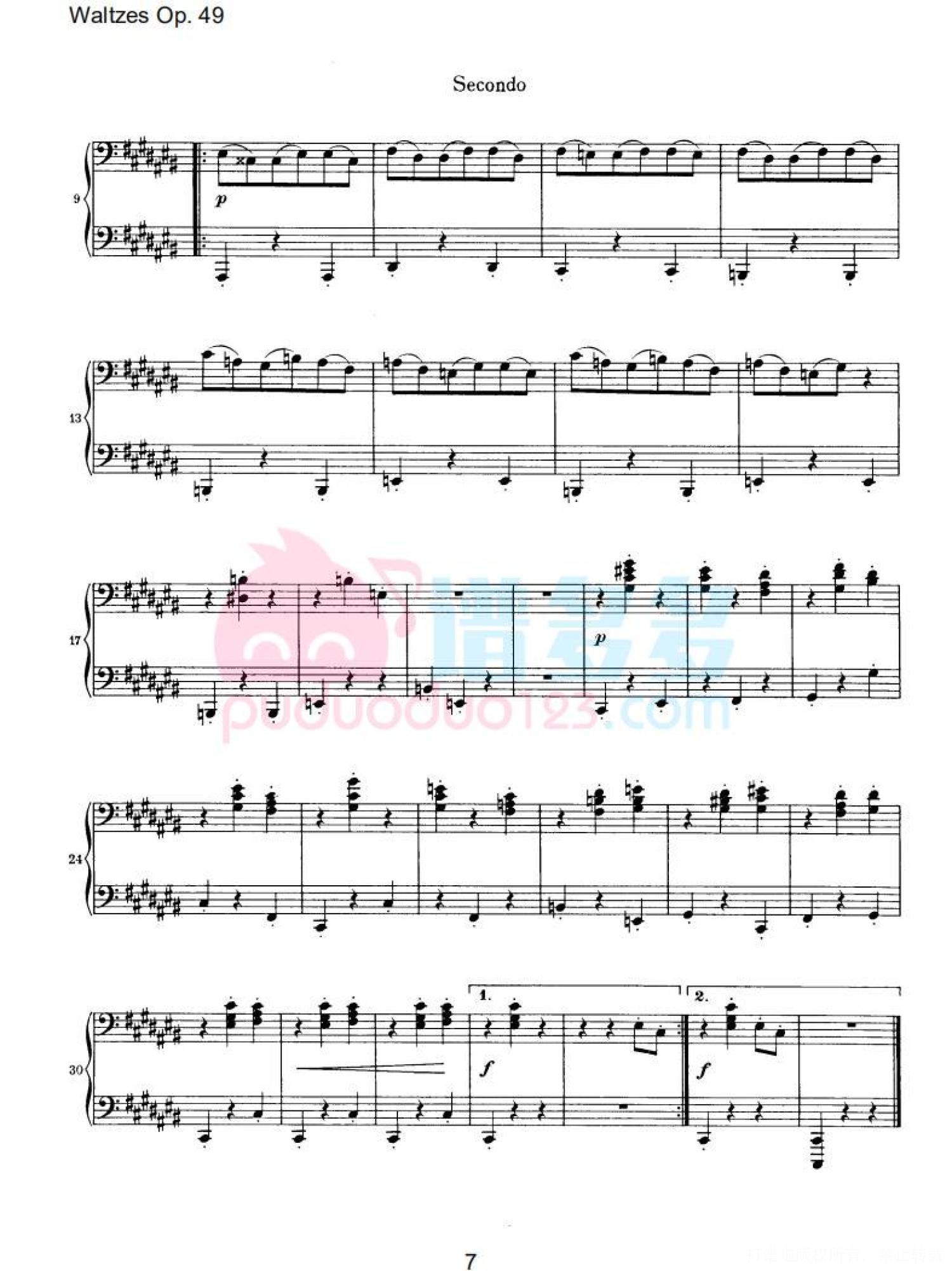 曲谱介绍: 十六首华尔兹作品中Op. 39是一组由约翰内斯·勃拉姆斯(Johannes Brahms)创作的华尔兹钢琴四手曲。专门献给爱德华·汉斯里克(Eduard Hanslick)。 作曲家还为钢琴独奏安排了这些华尔兹舞曲,分为两种版本:困难和简化。与作曲家的预期相反,这三个版本在同一时间出版并卖得很好。在独奏版本中,某些键与原始的二重奏版本有所不同(后四个部分在困难版本中下移了半步,而在简易版本中则移到了第六个)。