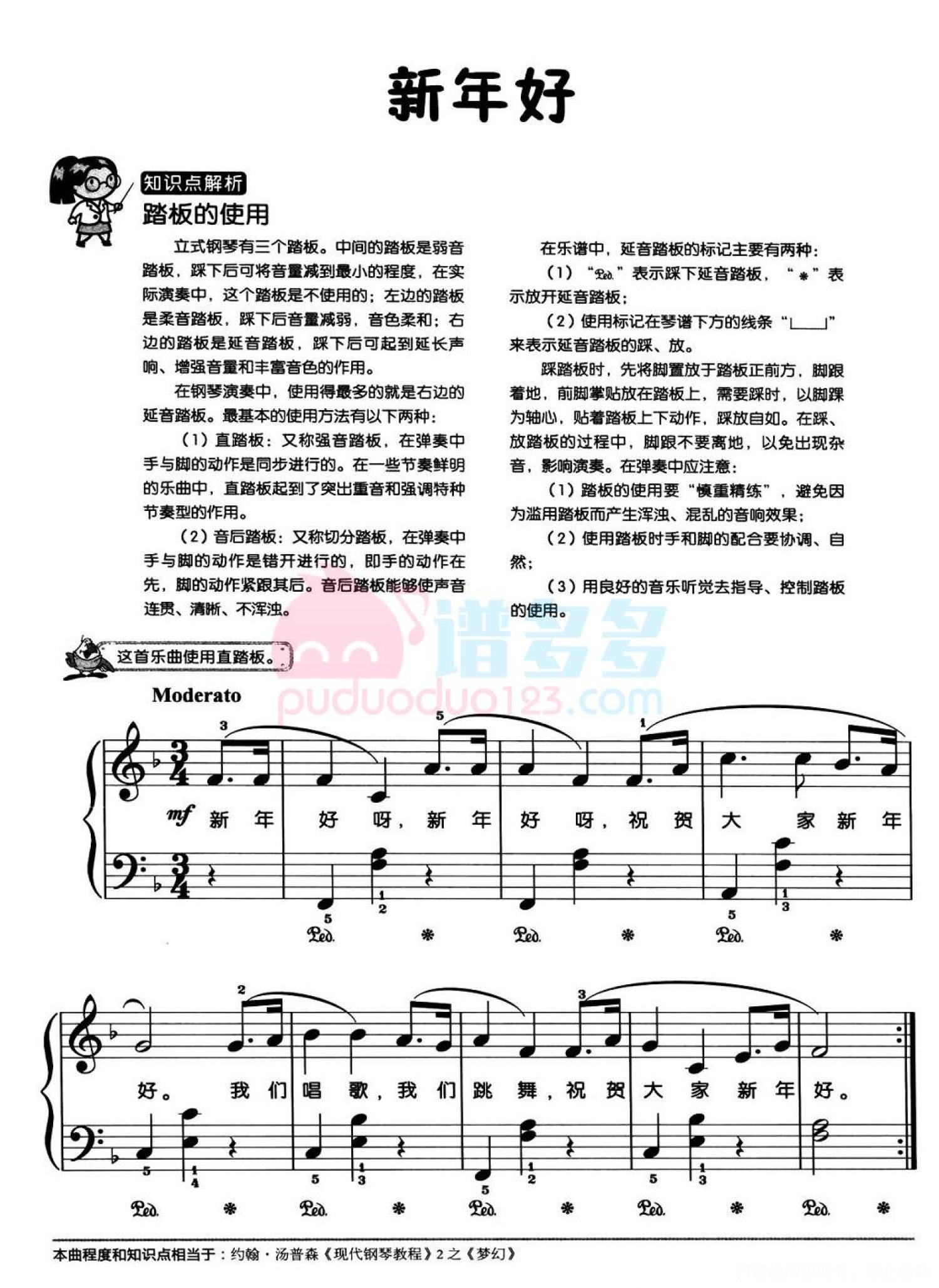 曲谱介绍: 《新年好》原曲是英国一首非常著名的曲子《Happy new year》,也有一个版本是改编自朝鲜电影《卖花姑娘》主题曲的儿歌。歌词简单,喜庆、吉祥。祝福大家2020新年好!鼠年吉祥、安康。 《新年好》钢琴谱 新年好呀新年好呀, 祝贺大家新年好。 我们唱歌我们跳舞, 祝贺大家新年好。