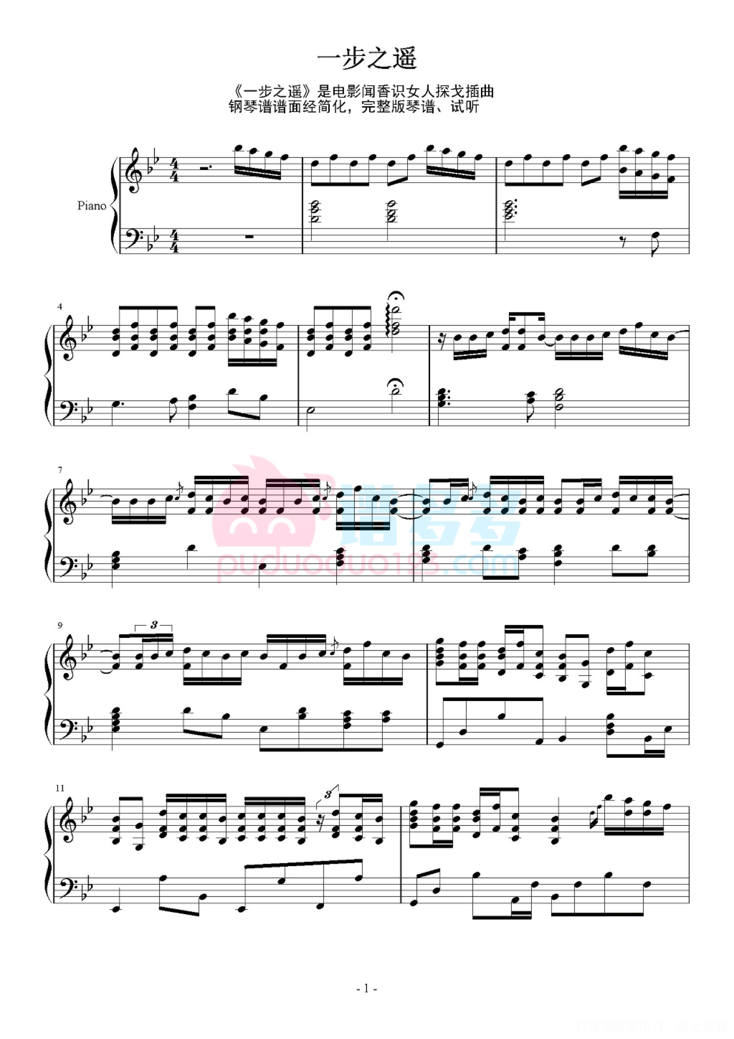 曲谱介绍: 《一步之遥》(西班牙语:Por una Cabeza)是一首著名的西班牙语探戈歌曲,由阿根廷歌手卡洛斯·葛戴尔作曲,亚法多·勒佩拉作词,是 电影《闻香识女人》的插曲,本曲谱为一步之遥简化版钢琴谱。 西班牙语中的“Por una Cabeza”本为赛马的术语,意为“差一个(马)头”的长度。在歌曲中用来表示对情人之间错综复杂难以割舍的惋惜 。 《一步之遥》这首华丽而高贵动人的探戈名曲,是阿根廷探戈舞曲的极致代表,也是全世界乐迷所最为熟知而深深爱上探戈旋律,《闻香识女 人》、《辛德勒名单》、《真实的谎言》等电影都采用过该探戈舞曲作为插曲。