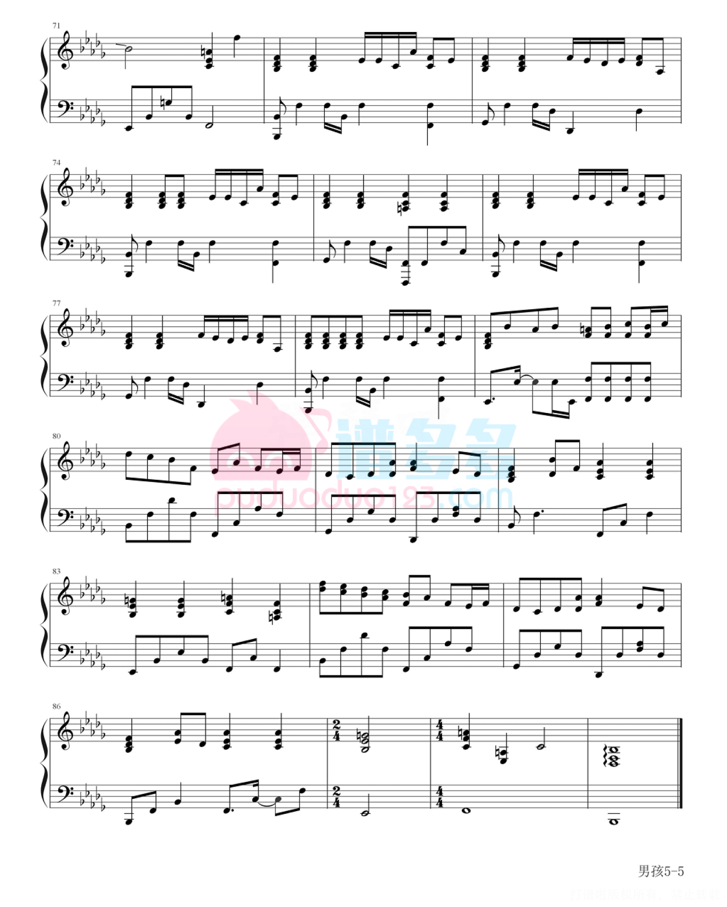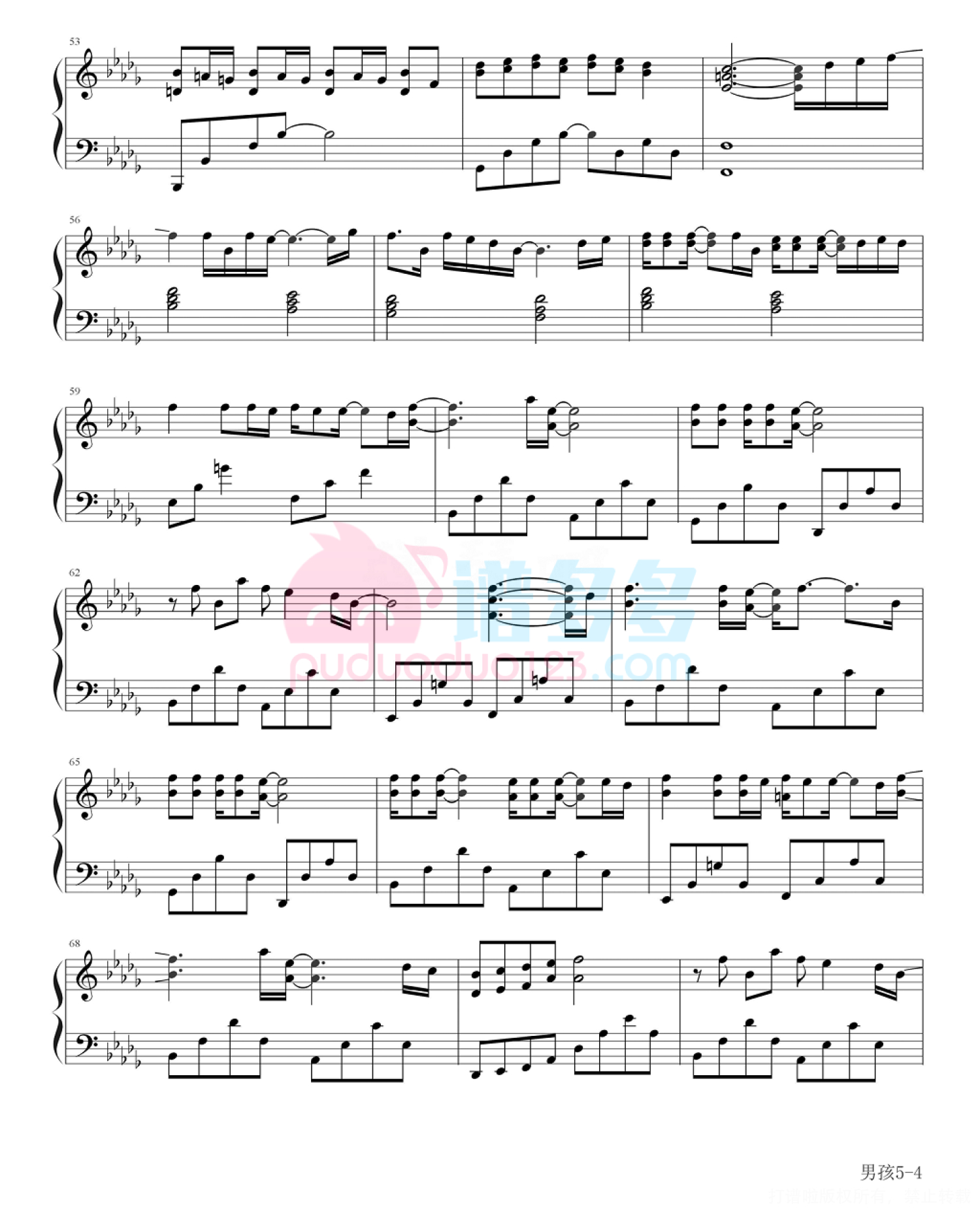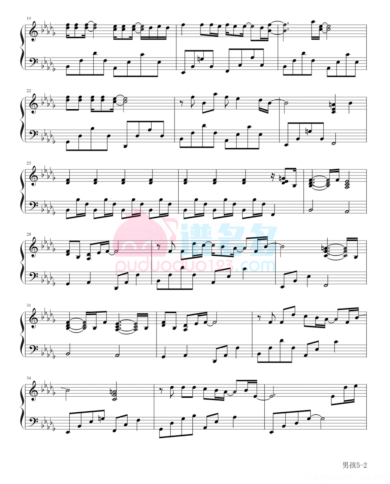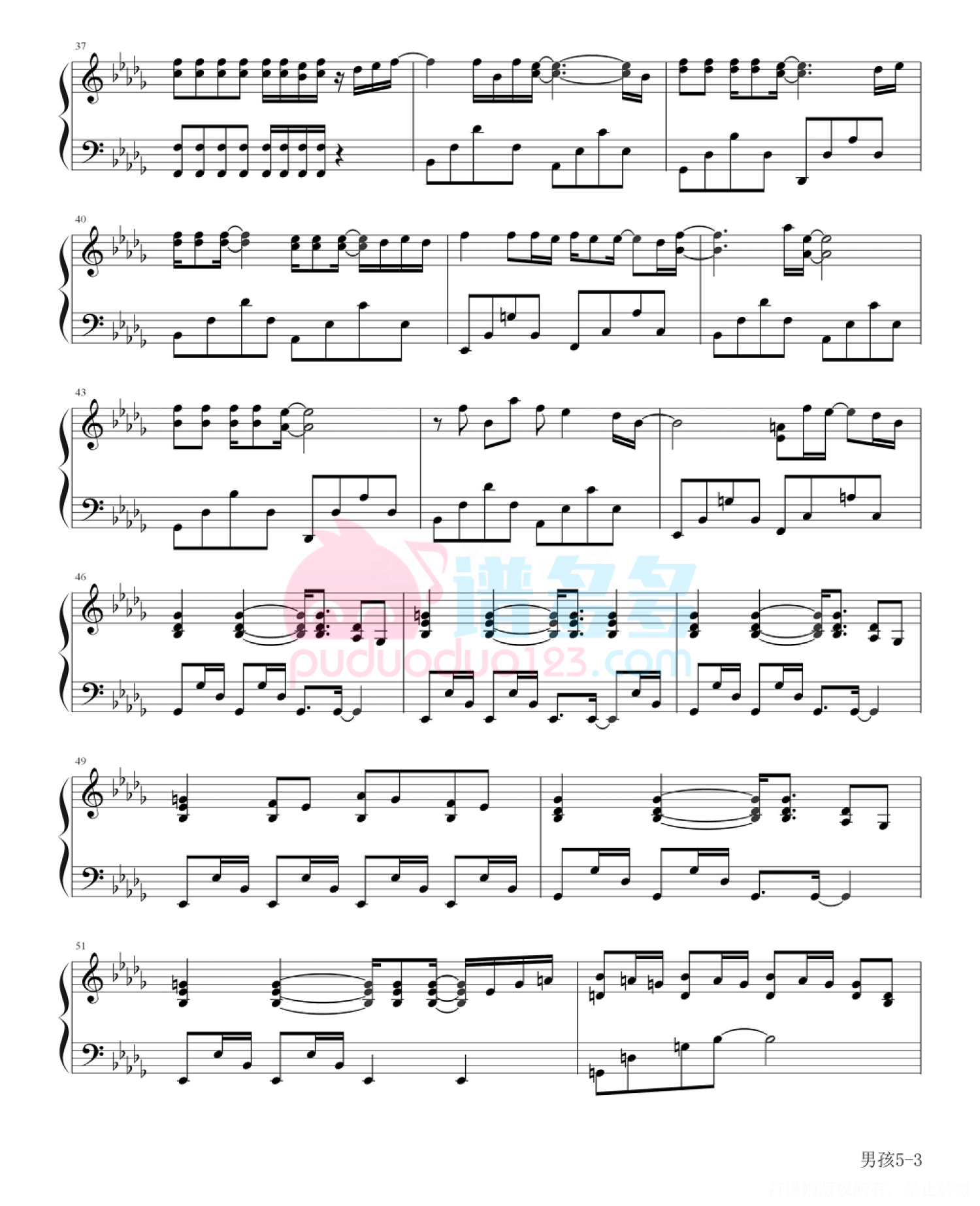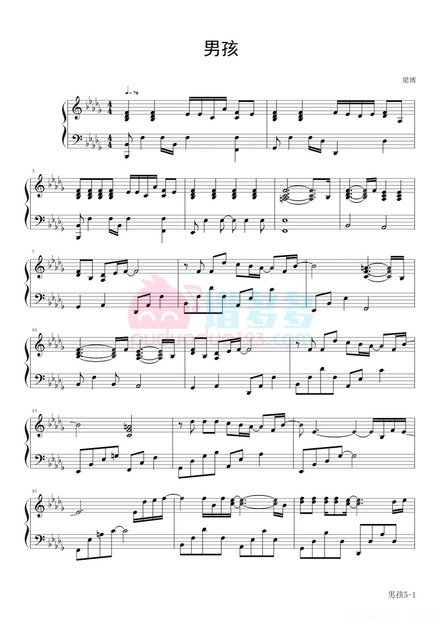 曲谱介绍: 《男孩》是由梁博作曲、作词、编曲、并演唱的歌曲,在湖南卫视《歌手2017》首演,歌曲时长5分11秒,音乐风格:流行。本曲谱为《男孩》钢琴谱,欢迎练习。 该曲从开始到结尾一气呵成,没有丝毫的拖泥带水,但是其中蕴含的情感又是那么的倔强和催泪,完全和《灵魂歌手》是两种概念,甚至有过之而无不及。