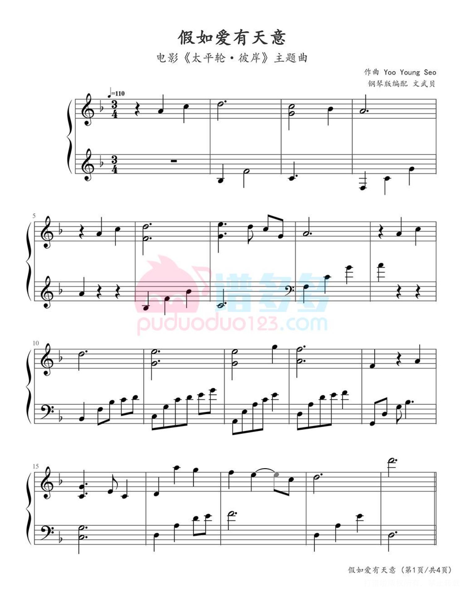 曲谱介绍: 《假如爱有天意》是由李健填词、Yoo Young Seok谱曲,李健翻唱韩国同名电影主题曲的一首歌曲,收录于李健专辑《李健》中。该曲助李健获得《我是歌手》第三季突围赛的冠军。 李健受邀为吴宇森执导的史诗爱情《太平轮·彼岸》演唱电影推广曲《假如爱有天意》,歌词与影片中人物情感命运的贴合度颇高,简直可视为该片“量身打造”,体现了李健这位音乐诗人对于爱情细腻的理解;温情优美的旋律伴着他柔情无限的演唱,于婉转低回之中驿动人心。