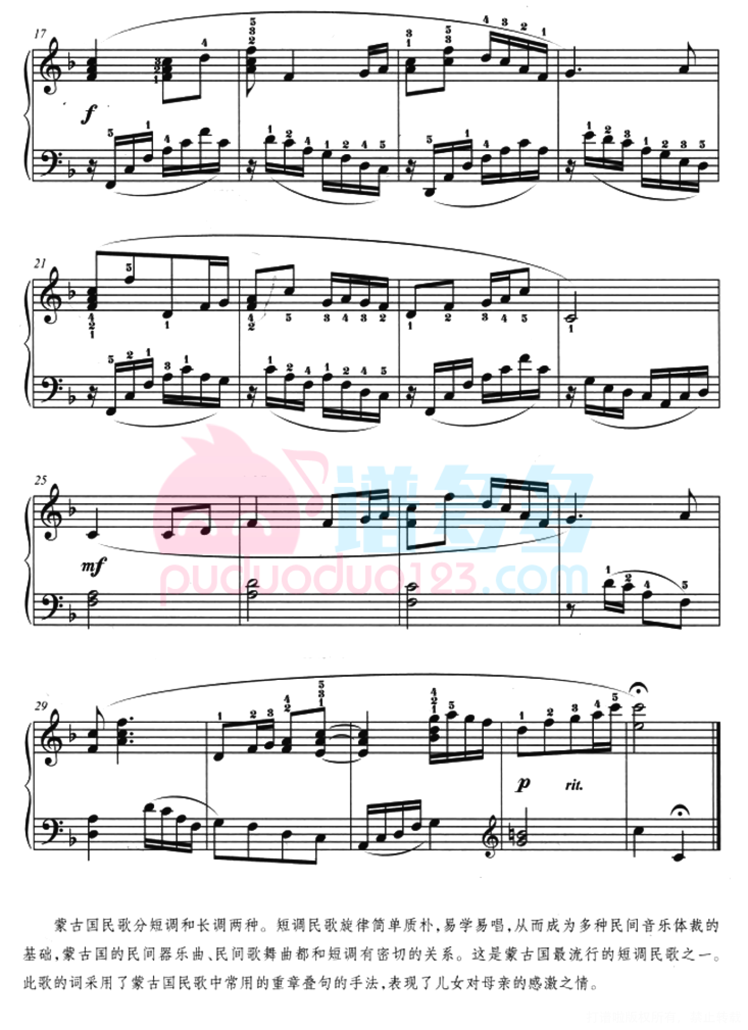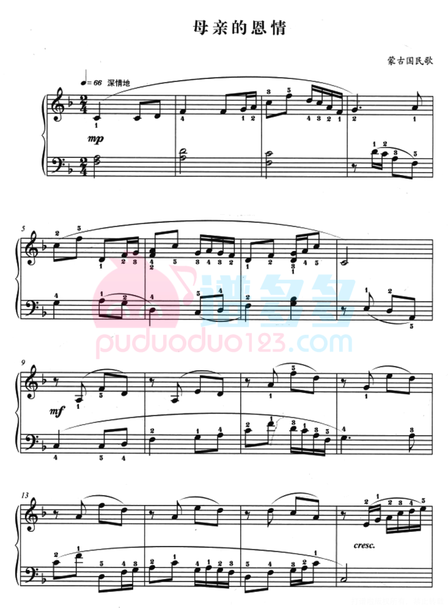 曲谱介绍: 《母亲的恩情》这是蒙古国最流行的短调民歌之一。此歌的词采用了蒙古国民歌中最常用的重章叠句的手法,表现了儿女对母亲的感激之情。