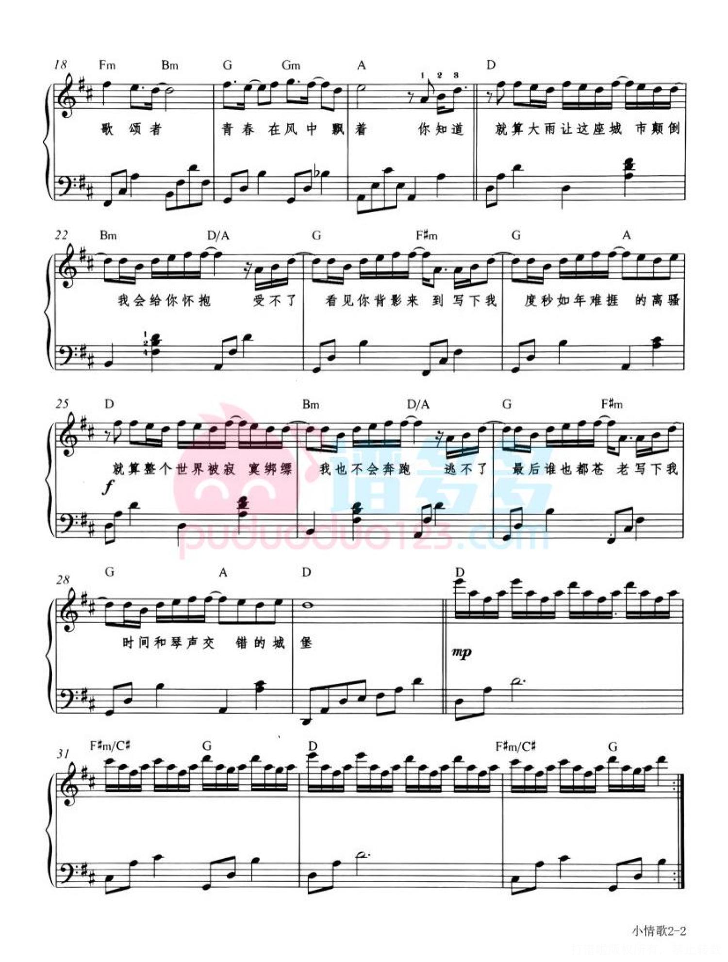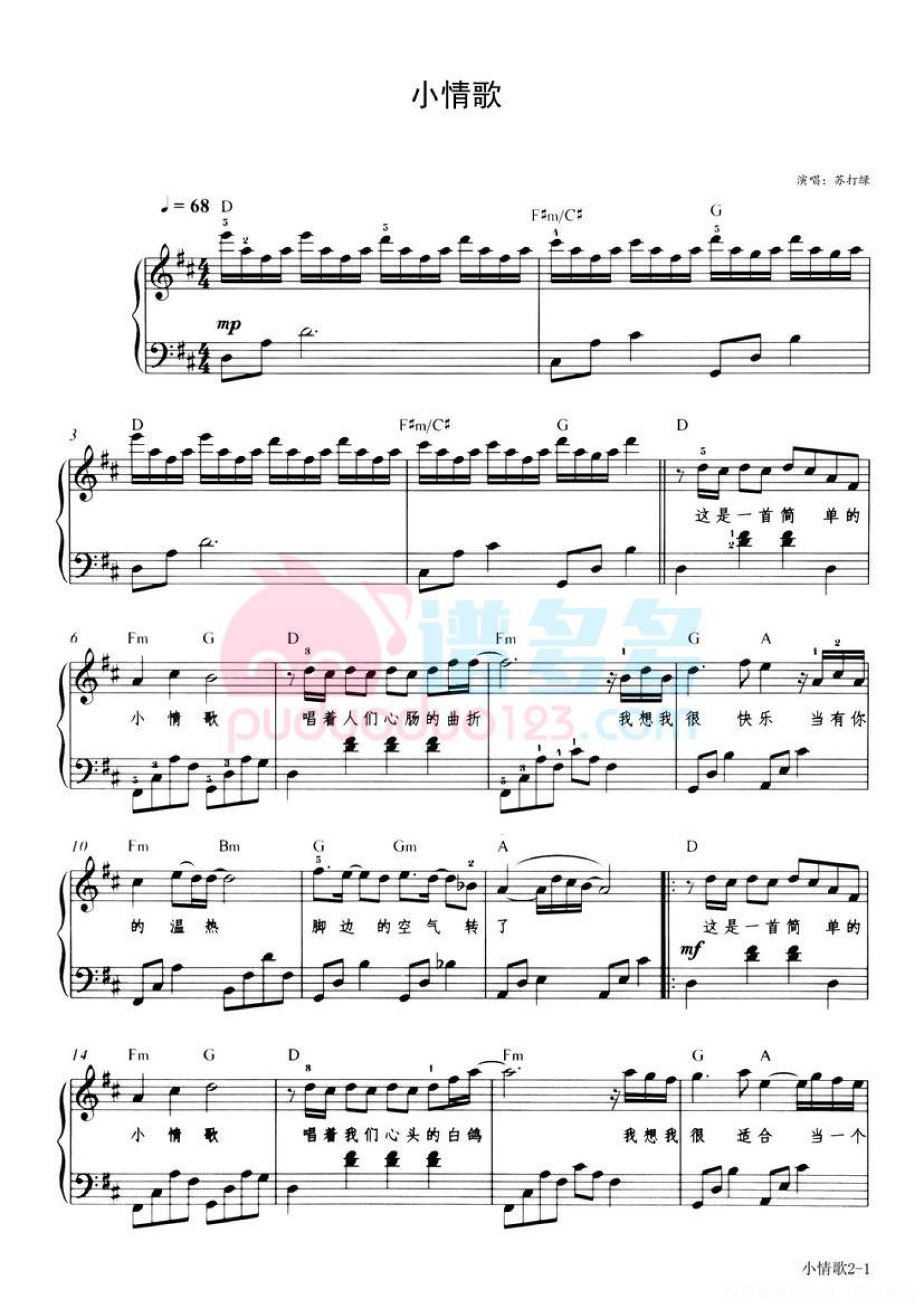 曲谱介绍: 《小情歌》是苏打绿主唱吴青峰在读大三时写的歌,作曲作词只花费了大约十分钟。当时吴青峰身边有一段令他感触良多的故事,所以他迅速地完成了歌曲创作,在录唱该曲时,吴青峰一度落泪。 《小情歌》的歌词“受不了看见你背影来到,写下我度秒如年难捱的离骚”初听令人奇怪,但“离骚”其实是一个亮点,类似于五四时期诗体创作的手法。 以前只是单纯的喜欢音乐、旋律和吴青峰的声音,对于歌词一点都不明白,特别是那句“大雨让整座城市颠倒”,后来才直到颠倒的城市是水中的倒影,歌曲描述的是简单的爱情,通过每天的日起日落、下雨晴天衬托生活中最简单最朴素最真实的爱情。