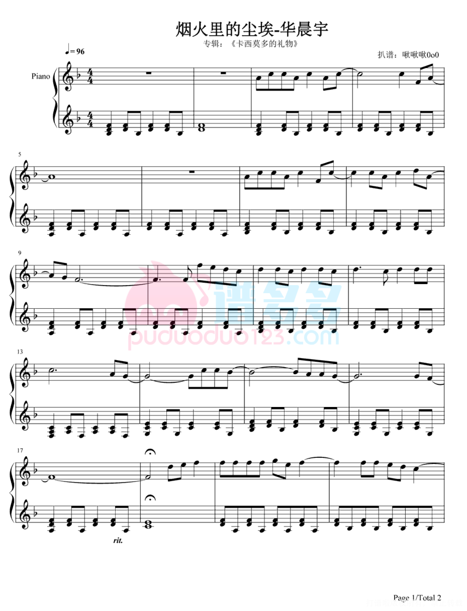 曲谱介绍: 《烟火里的尘埃》是由林夕作词、西楼谱曲、西楼和郑楠编曲、华晨宇演唱的歌曲,脱胎于华晨宇比赛中翻唱的《我》,传承烟火的续篇,收录在华晨宇的《卡西莫多的礼物》专辑中。 清炒苦瓜:《烟火里的尘埃》我已经不知道第几次分享这个音乐了,华晨宇一个从快男出道的歌手。但是却从来没让我们失望过。有自己的音乐梦,得到林夕的青睐。所以这首歌感觉就像是为华晨宇量身定做的!悠扬的假高音和超高的声场。在你们面对孤独时候。会一点一点的融入到你们心里。真的可以无限循环!