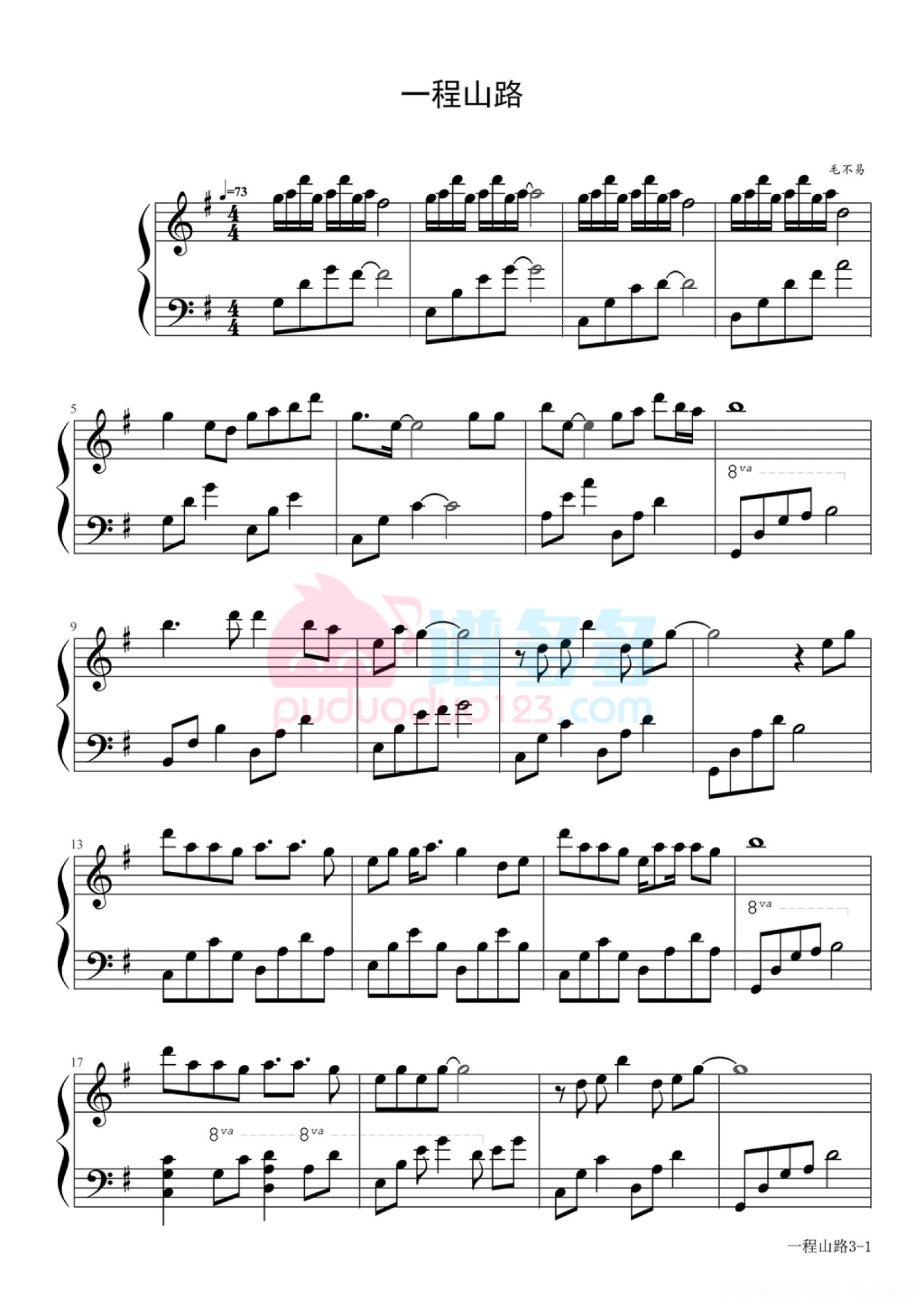 曲谱介绍: 《一程山路》是由毛不易作词、作曲并演唱的歌曲,该歌曲收录于毛不易的专辑《明日之子 第9期》中。本曲谱为网友改编的钢琴谱,欢迎练习。 听着这首歌入睡,仿佛自己也来到了那山中幽径,漫步在此,万籁俱静,天地间仿佛只剩下自己。毛不易这首《一程山路》,带着点儿古风, 行云流水,唱春花秋月、匆匆过客,不知道这首歌,是否也打动了你?
