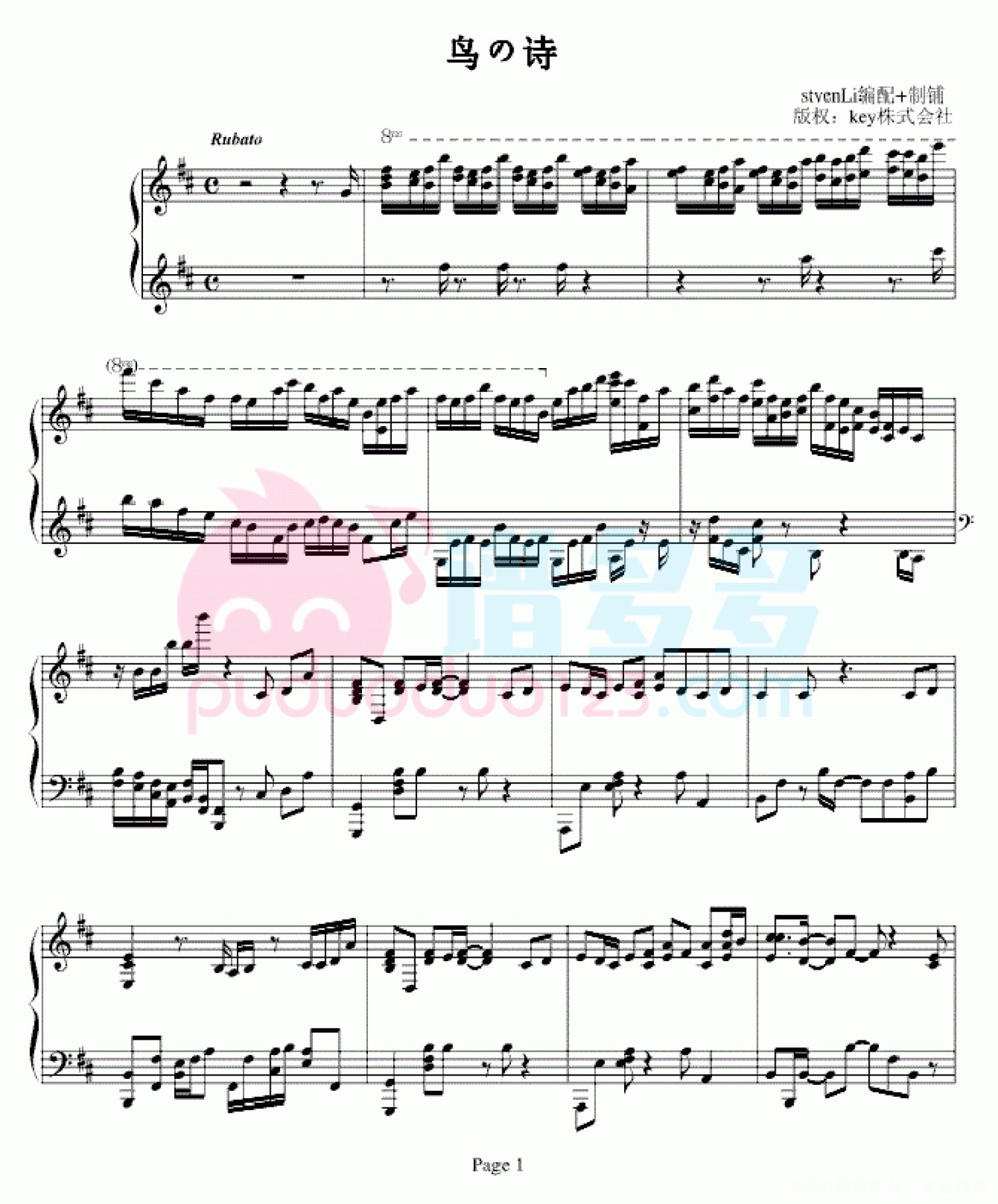 曲谱介绍: 《鸟之诗》是由Key推出的游戏《AIR》及京都动画制作的同名电视动画的主题曲,也是AIR的家用机移植版本和电视动画的主题曲。