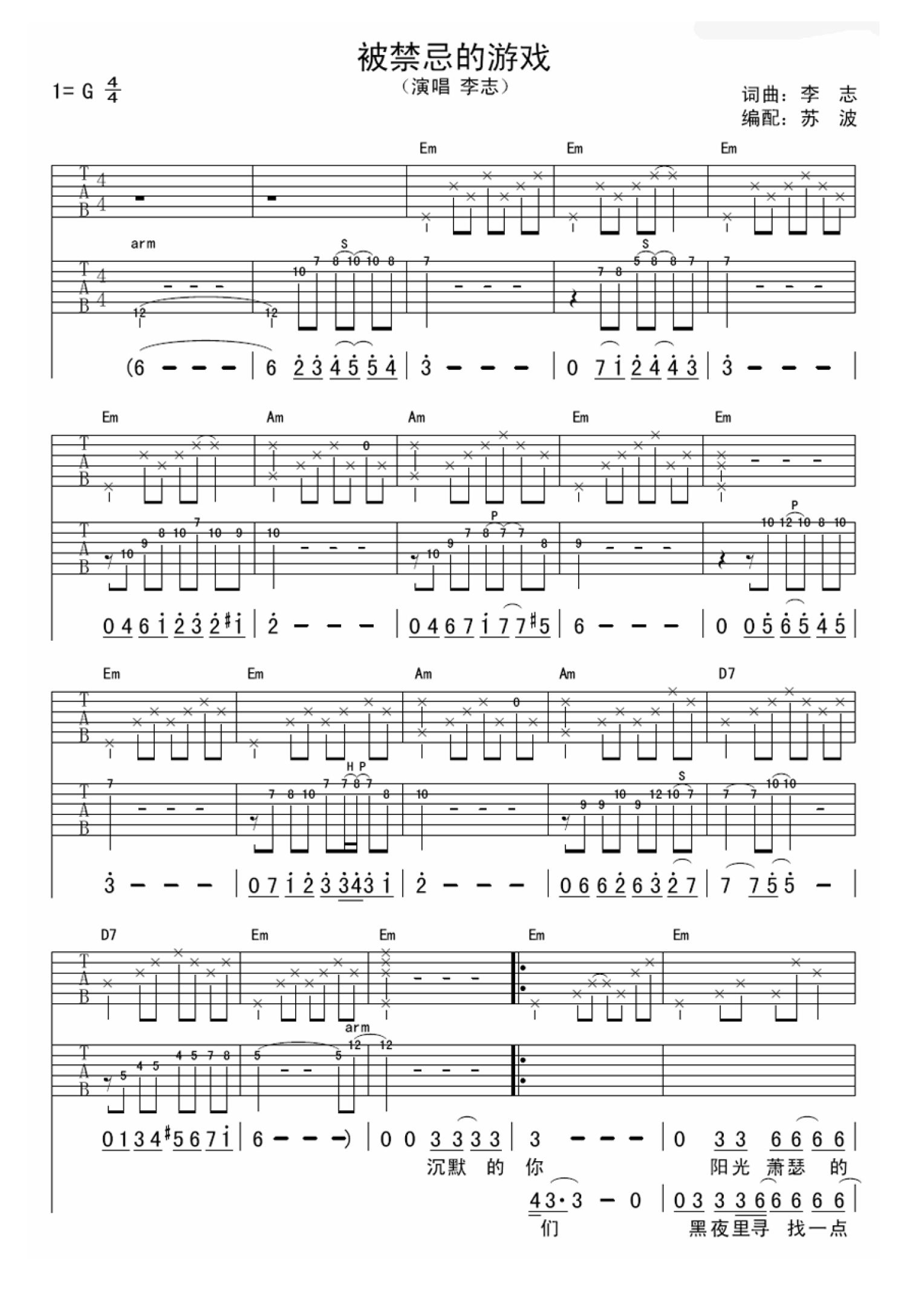 被禁忌的游戏吉他谱 - 李志 - G调吉他弹唱谱