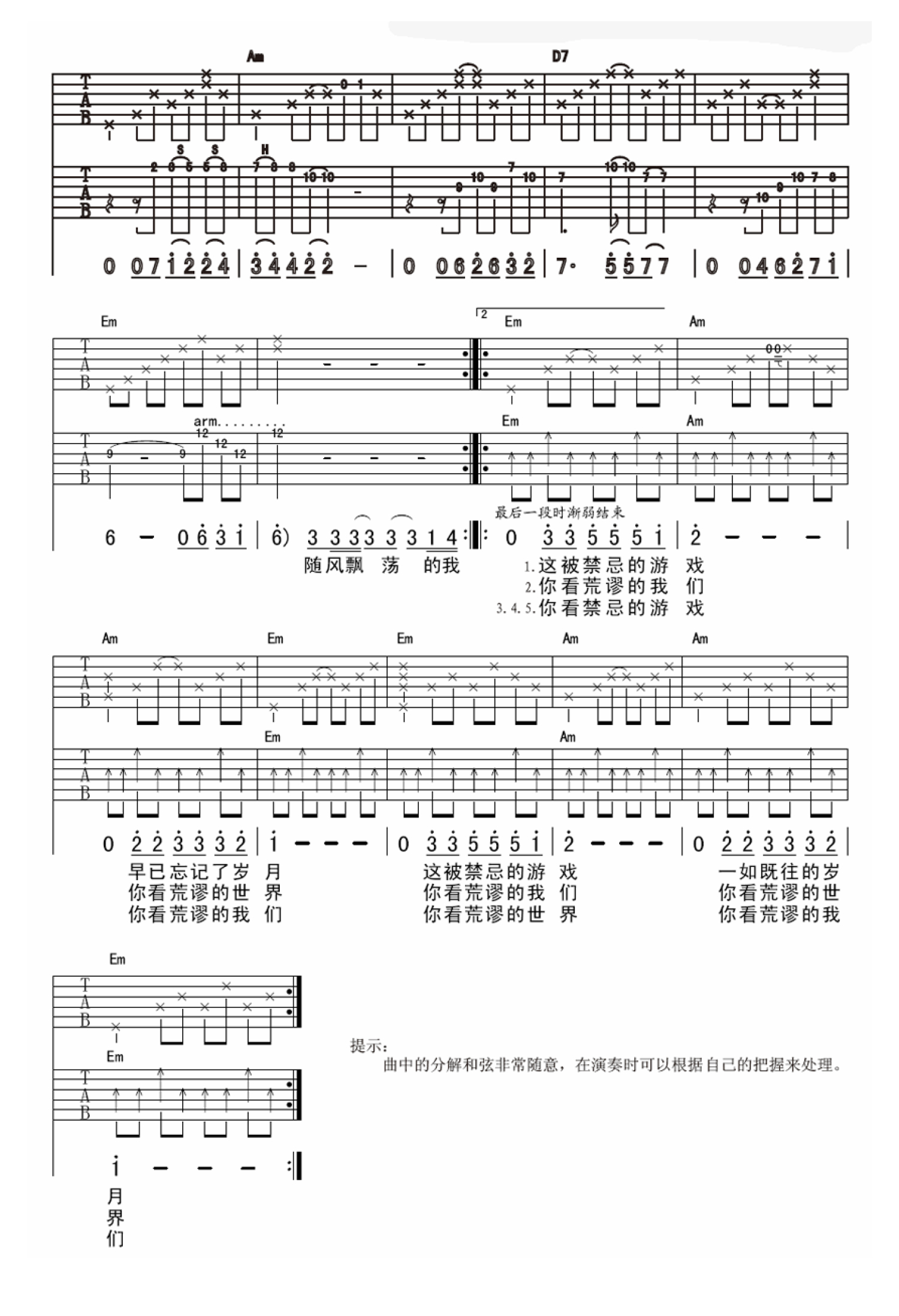 曲谱介绍: 李志 被禁忌的游戏吉他谱