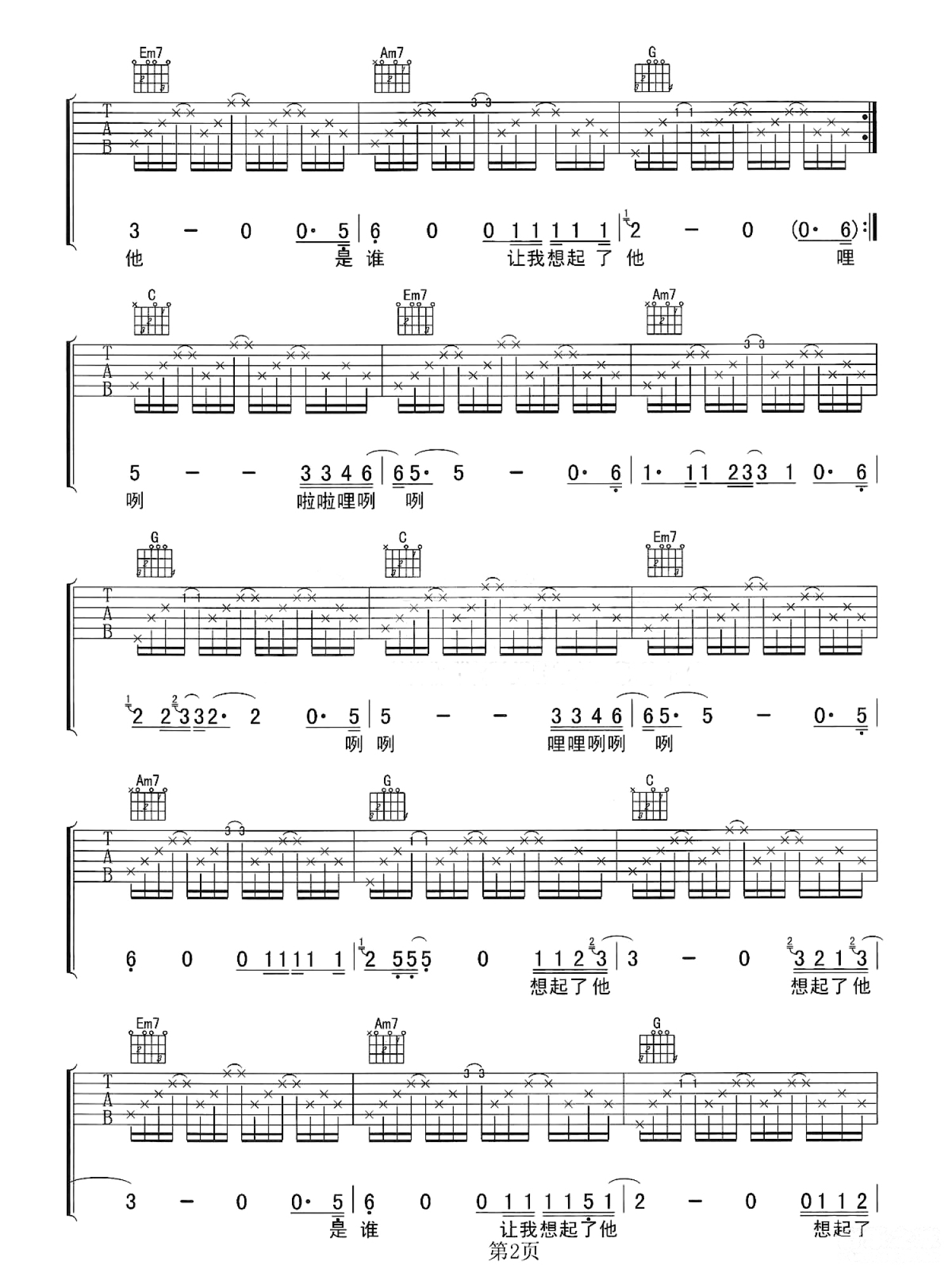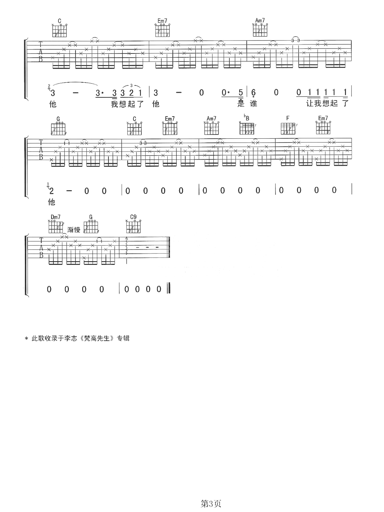 曲谱介绍: C调原版 李志《想起了他》吉他弹唱六线谱