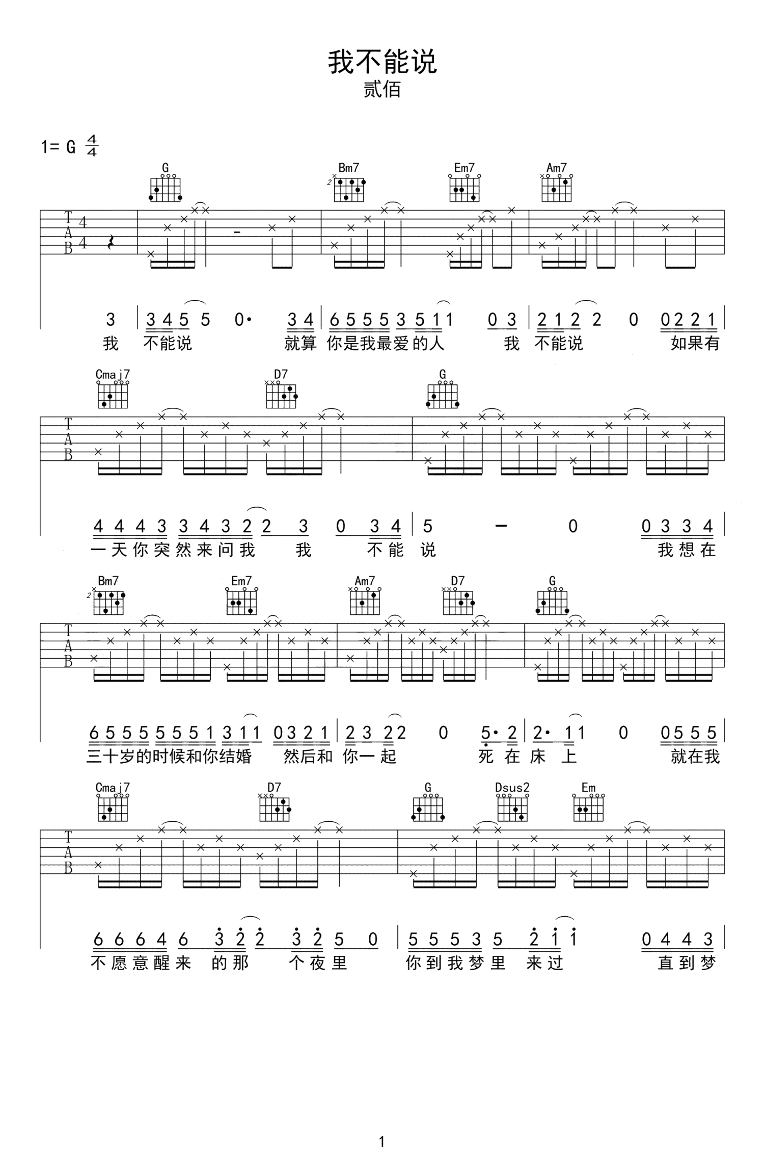 我不能说吉他谱 - 贰佰 - G调吉他弹唱谱