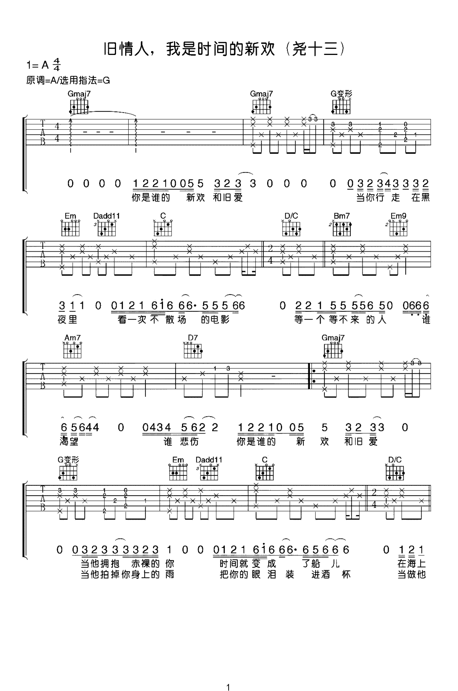 曲谱介绍: 旧情人,我是时间的新欢吉他谱,尧十三的经典代表歌曲,原调A,选用G调指法编配,CAPO夹二品。这是尧十三的代表作品,也是新专辑中比较受欢迎的一首!老师编配的这个乐谱比较合理,演奏难度已经尽可能降低,依然觉得难的同学可能自身能力要加强了,再简化原版的味道就没了!注意间奏部分和弹唱部分细微的变化!难度:6级