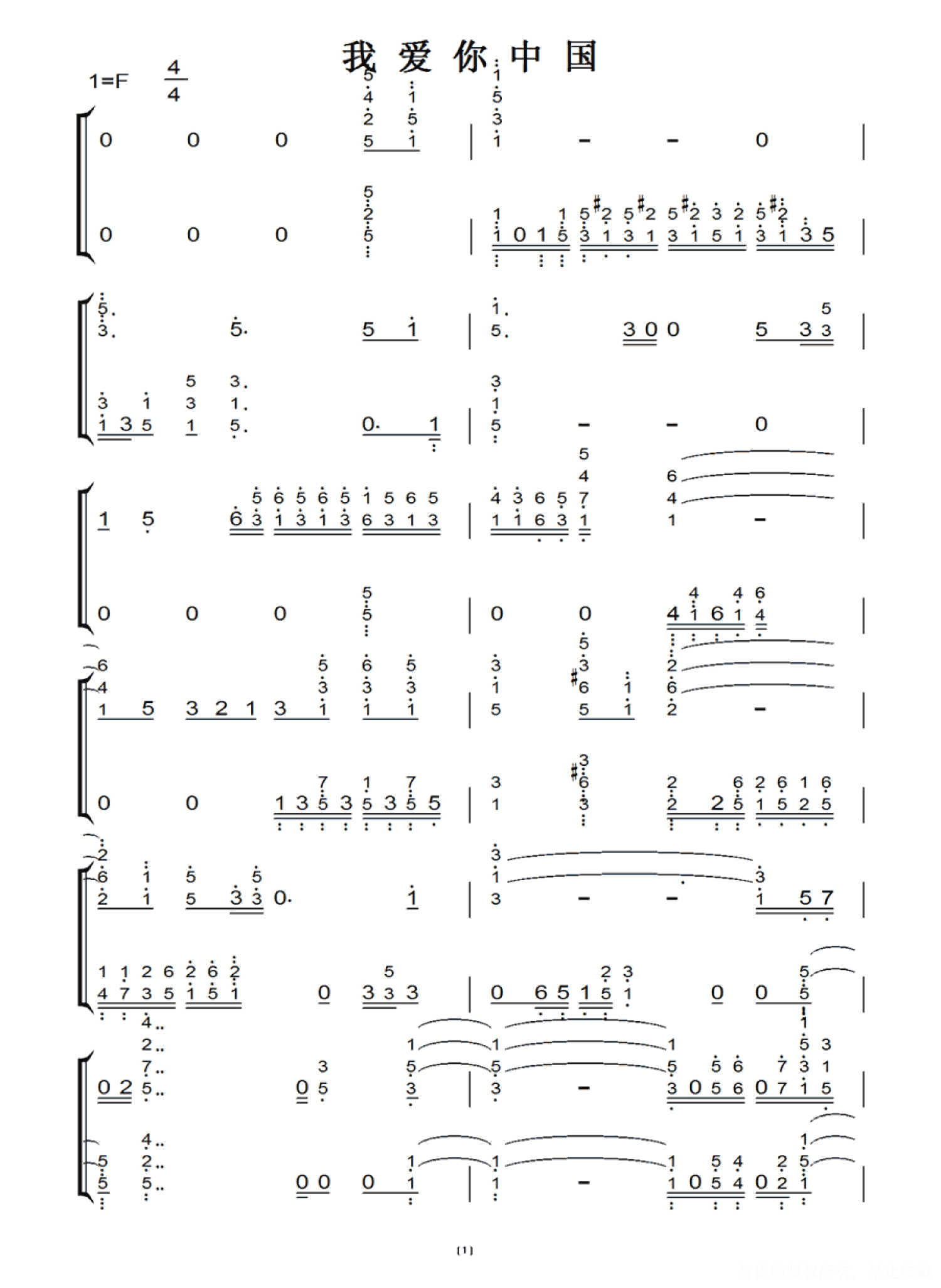 曲谱介绍: 经典爱国主义歌曲《我爱你中国》双手简谱版钢琴谱,原版高清简谱。这首歌由郑秋枫作曲、瞿琮作词、叶佩英原唱,是电影《海外赤子》的插曲,获奖无数,入选联合国教科文组织(亚洲)歌曲集。 趣闻:郑秋枫为《我爱你中国》谱曲只用了一两个小时,但准备的时间很长,他花了近一个月的时间在海南岛兴隆农场体验生活,为的是感受归侨真实的生活,寻找灵感。瞿琮当年为《我爱你中国》这首歌作词,获得了10元钱稿酬,叶佩英接受邀请演唱这首歌,从而放弃了考托福。 《我爱你中国》这首歌曲把海外游子眷念祖国的无限深情抒发得淋漓尽致,每当唱起这首歌,都能让人体验到一派喷涌而出的激情,让每一个炎黄子孙心中都荡漾着对祖国的崇高之爱。