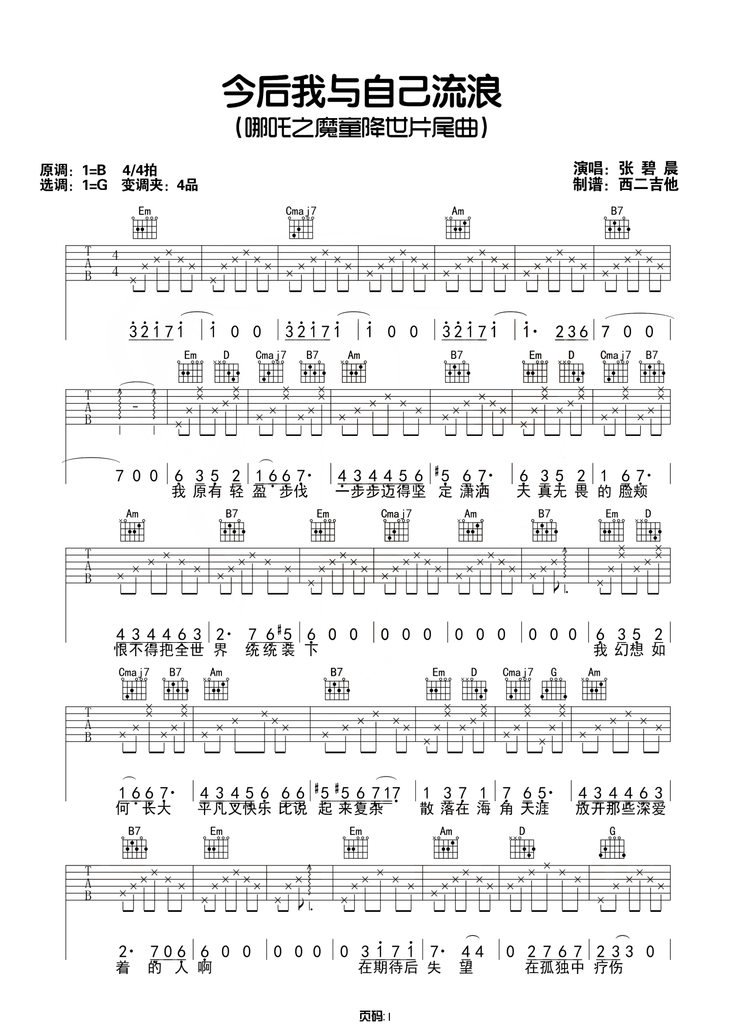 曲谱介绍: 《今后我与自己流浪》是由王子作词、作曲,张碧晨演唱的一首歌,是动画电影《哪吒之魔童降世》的片尾曲。最近热播的动画电影《哪吒之魔童降世》,票房也是打破多项国内动画的记录。这部改编的新作,一改以往哪吒形象,将我们原本认为人正苗红的英雄人物形象打破,重新定义其为魔丸转世,不认命的哪吒生而为魔那又如何,导演饺子给我们呈现出一个逆天而行斗争到底的成长经历故事。电影片尾曲《今后我与自己流浪》是由王子作词、作曲,张碧晨演唱。张碧晨曾作为《中国好声音》第三季冠军在国内出道,她性感慵懒的声线又具有个人风格的唱腔在音乐作品上更具多元性和可能性,而在创作方面,她特立独行的坚持和大胆无畏的创新更发挥了张碧晨内在无穷的潜力。充满细腻情绪的歌声、扎实的现场唱功以及精彩的舞台表现,无不展现出她的大气成熟。