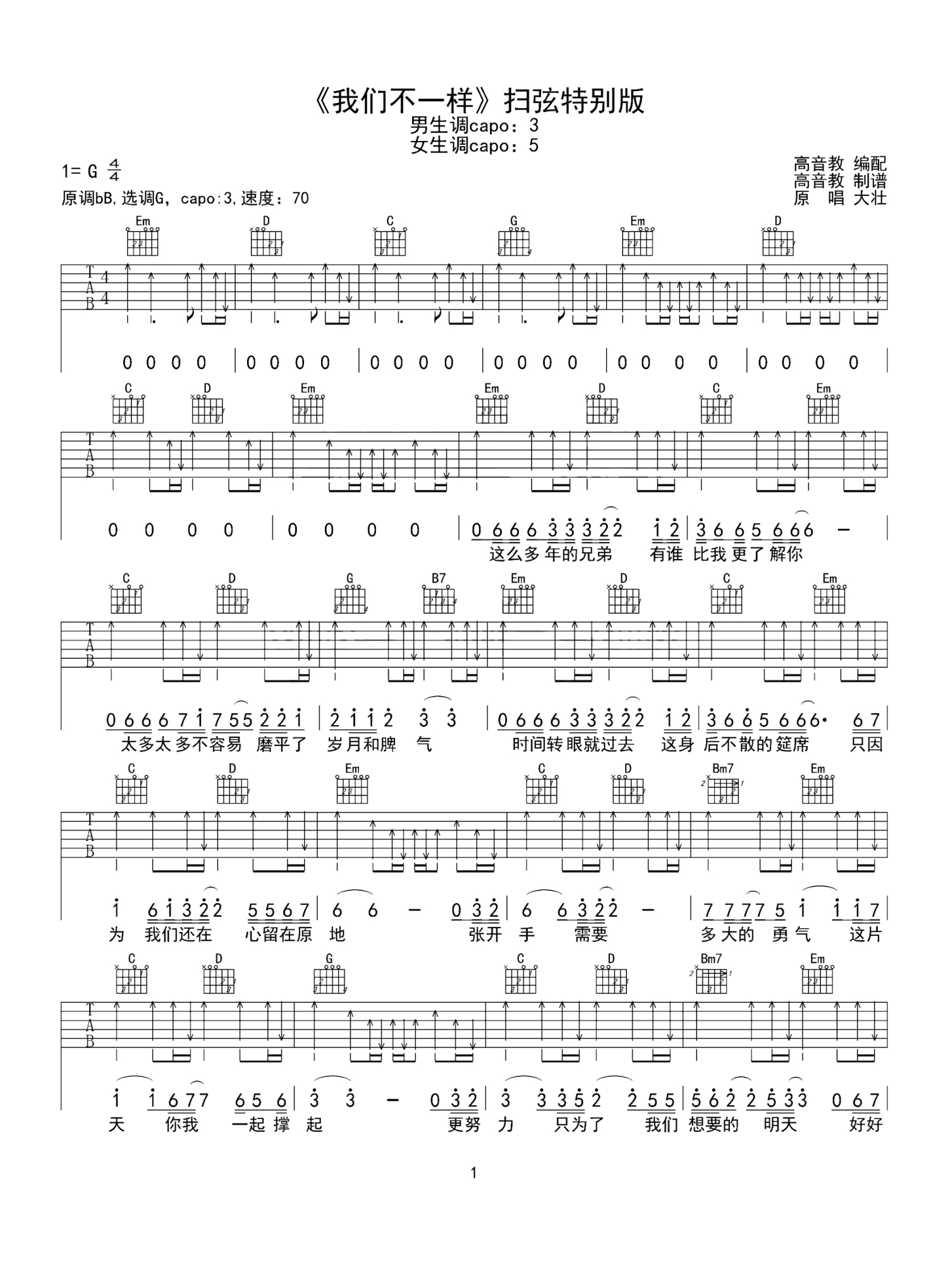 曲谱介绍: 《我们不一样》是高进填词、作曲,张亮编曲,大壮演唱的歌曲,单曲于2017年6月6日正式发行。 《我们不一样》是高进为大壮量身定制的一首歌。大壮过去的经历集中体现在这首歌里,这首歌其实表达的是“即便我们不一样,但我们依然是兄弟”的情感。 《我们不一样》旋律朗朗上口,歌曲脍炙人口,大壮浑厚的嗓音充满爆发力,有辨识度,演绎出了歌曲中励志奋发的小人物精神。虽然歌词比较简单,但饱满且充满正能量,接地气。面对普罗大众,每个人都有“不一样”的经历,歌词“我们不一样,每个人都有不同的际遇”唱出了很多听众的心声 [5]  ,仿佛融入了许多感同身受与人生阅历,引发听众共鸣。