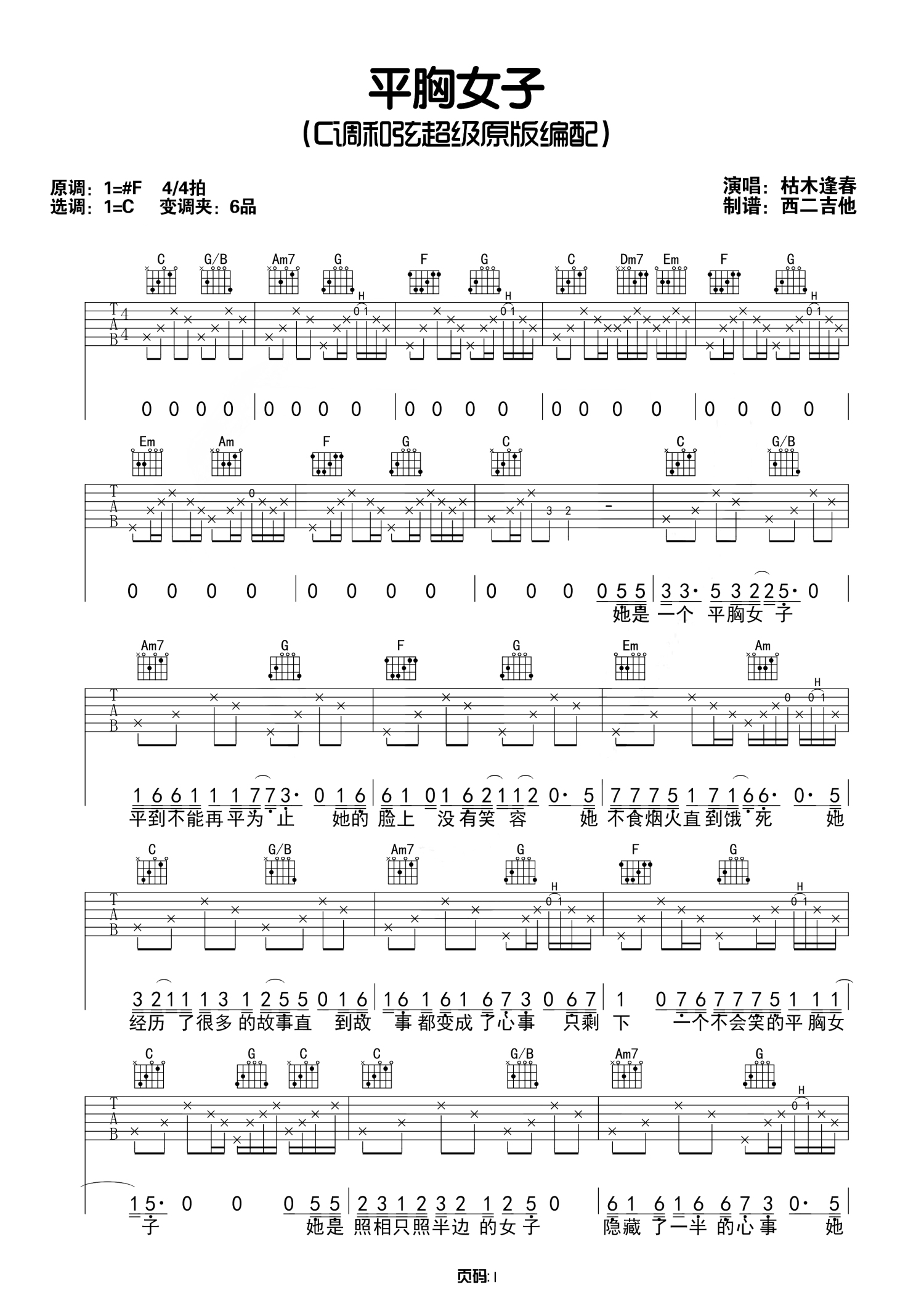 平胸女子吉他谱 - 枯木逢春 - C调吉他弹唱谱