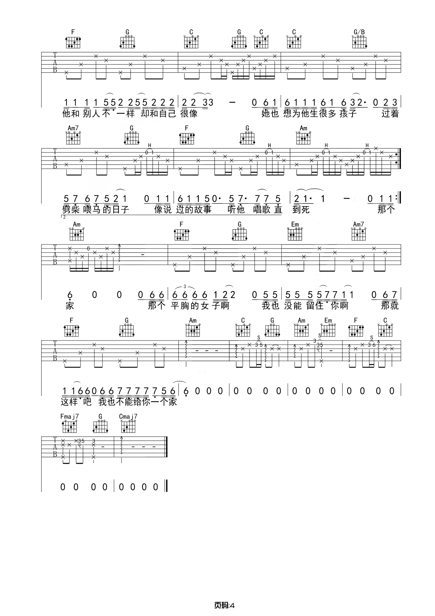 曲谱介绍: 作曲:枯木逢春作词:枯木逢春编曲:唐正楠录音师:刘柳录音棚:PlayHouseStudio成都监制:317发行:叁七SEVEN她是一个平胸女子平到不能再平为止她的脸上没有笑容她不食烟火直到饿死她经历了很多的故事直到故事都变成了心事只剩下一个不会笑的平胸女子她是照相只照半边的女子隐藏了一半的心事她也曾说过她的过往在四楼阳台的日子你厌恶他喝酒爱钱又意外让你这么喜欢在他的身上你信过一辈子的谎言你说爱情就是你情我愿只要喜欢就能找见毕竟死皮赖脸也不算好看那个平胸的女子啊你现在过的好吗一个人的时候会不会想起我啊那个平胸的女子啊还会有人摸你的头发总有一个人来为你披上婚纱我都还记得啊你说过的每句话要去遥远的地方有一个温暖的家可是平胸的女子啊我也没能留住你啊那就这样吧我也不能给你一个家她也是个风流的女子却爱上一个长不大的孩子她说他和别人不一样却和自己很像她也想为他生很多孩子过着劈柴喂马的日子像说过的故事听他唱歌直到死那个平胸的女子啊你现在过的好吗一个人的时候会不会想起我啊那个平胸的女子啊还会有人摸你的头发总有一个人来为你披上婚纱我都还记得啊你说过的每句话要去遥远的地方有一个温暖的家可是平胸的女子啊我也没能留住你啊那就这样吧我也不能给你一个家可是平胸的女子啊我也没能留住你啊那就这样吧我也不能给你一个家
