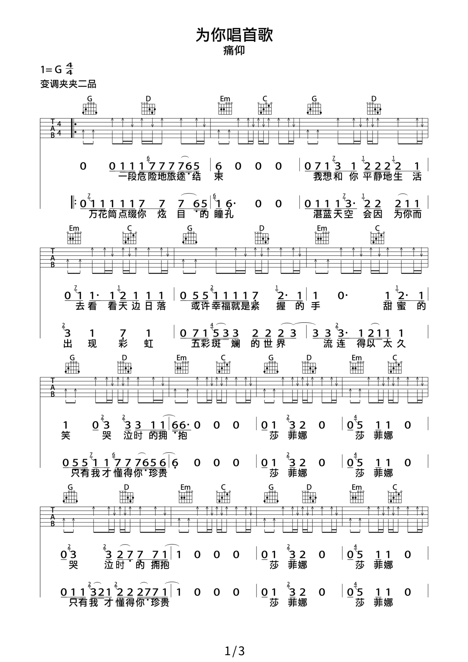 曲谱介绍: 痛仰乐队《为你唱首歌》G调吉他谱