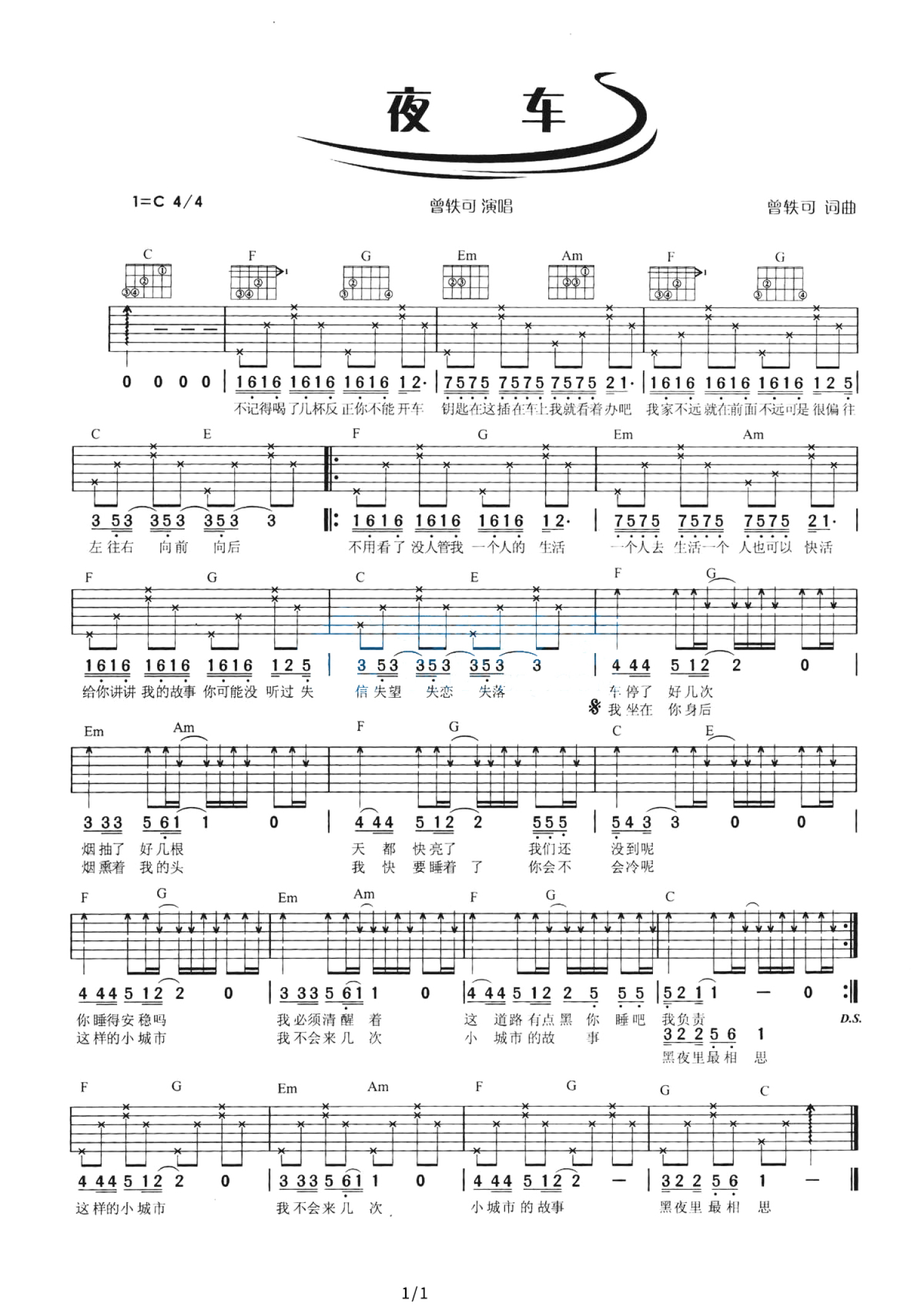 曲谱介绍: C调版 曾轶可《夜车》吉他弹唱六线谱