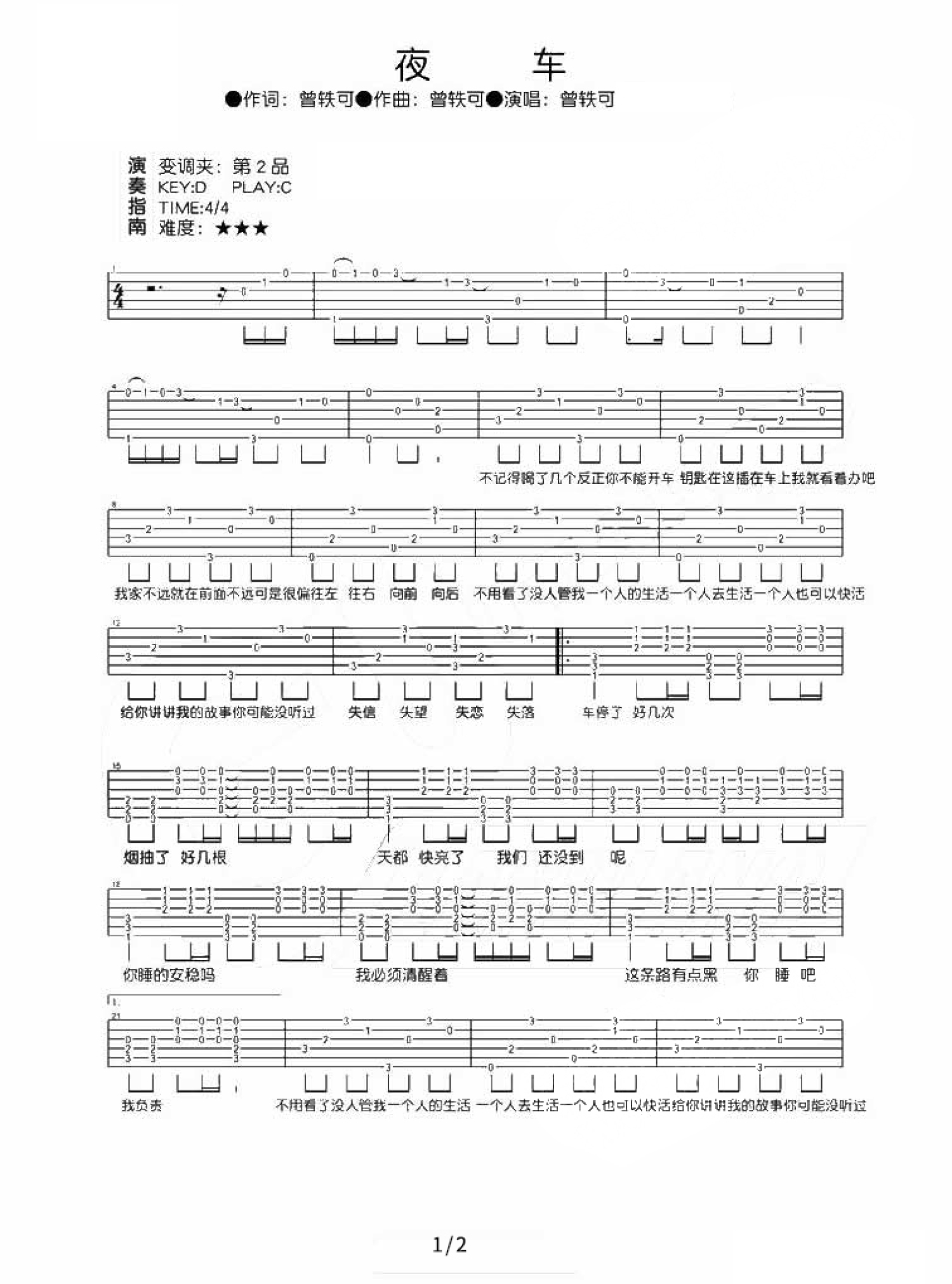 曲谱介绍: 曾轶可-夜车吉他六线谱图片  >变调夹夹第二品,原调D,选调C,弹唱难度三颗星。这是一首为电影《恋爱通告》创作的片尾曲,曾轶可将点滴的青春记忆与甜蜜的绵绵往事浅声吟唱。简单的三言两语,几句看似任性的耍脾气吟唱,却恰到好处的把藏匿於生活各处的小片段拆解开来,一语道尽那些洋溢崦恋那啻旱愕巍L著曾轶可孩子气的嗓音唱著,轻扣上的心扉就被她这股莫名的力量给闯入,无声的掀起了搁置心e,最害怕想起的甜美记忆,逼著你掀开那块无人知晓的小小领土,就算想要避免失落,也难挡曾轶可用歌声邀你再次入梦的记忆拖啊首首简单却让人记忆深刻的旋律