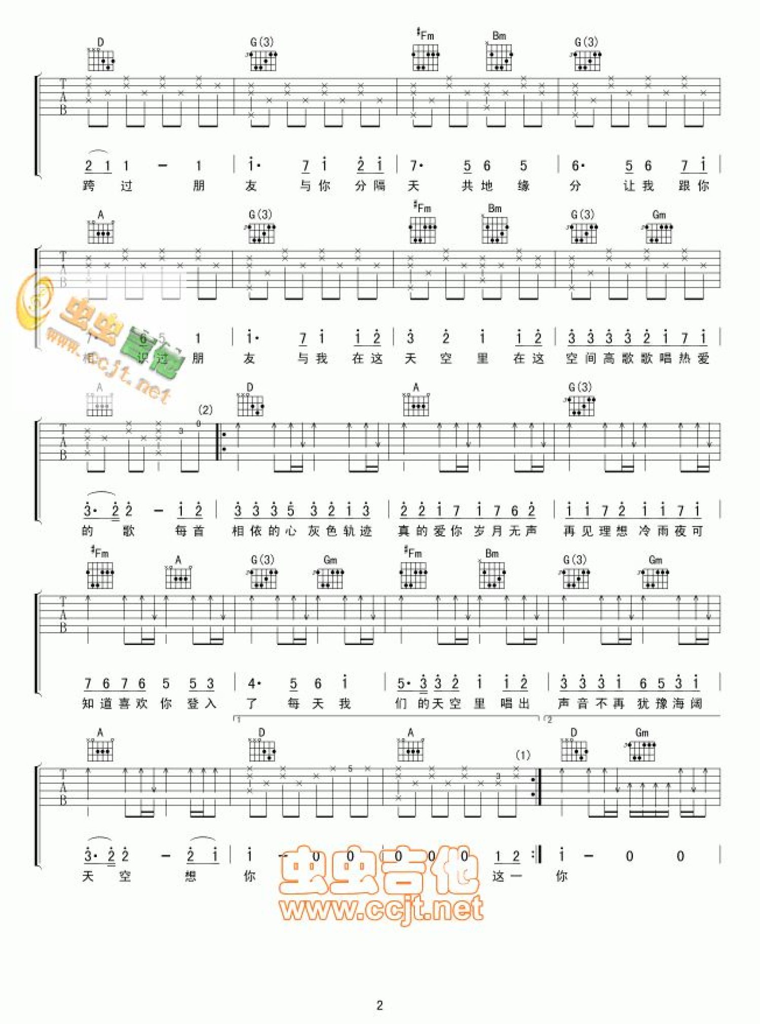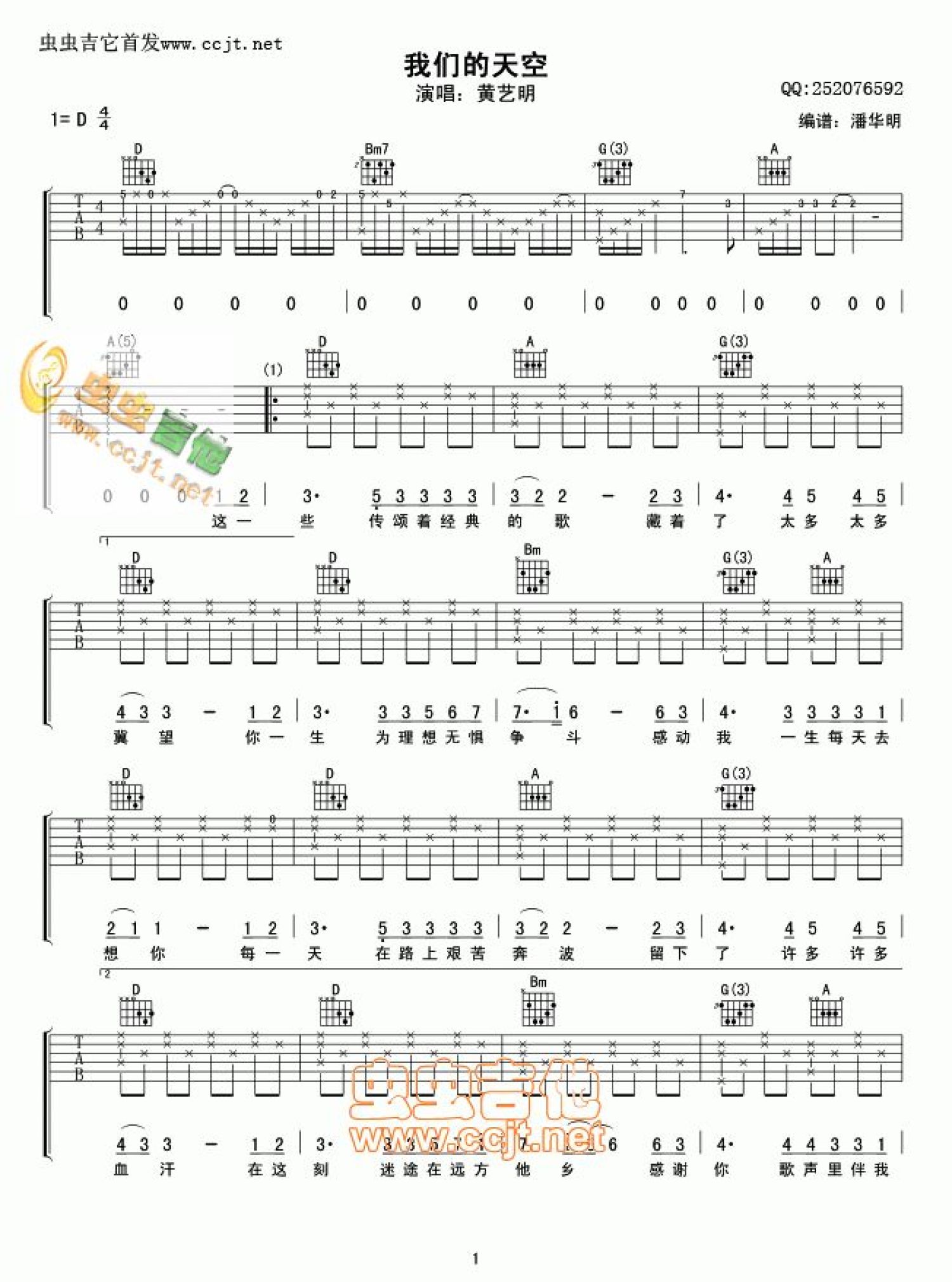 曲谱介绍: 黄艺明《我们的天空》吉他谱_D调吉他弹唱谱