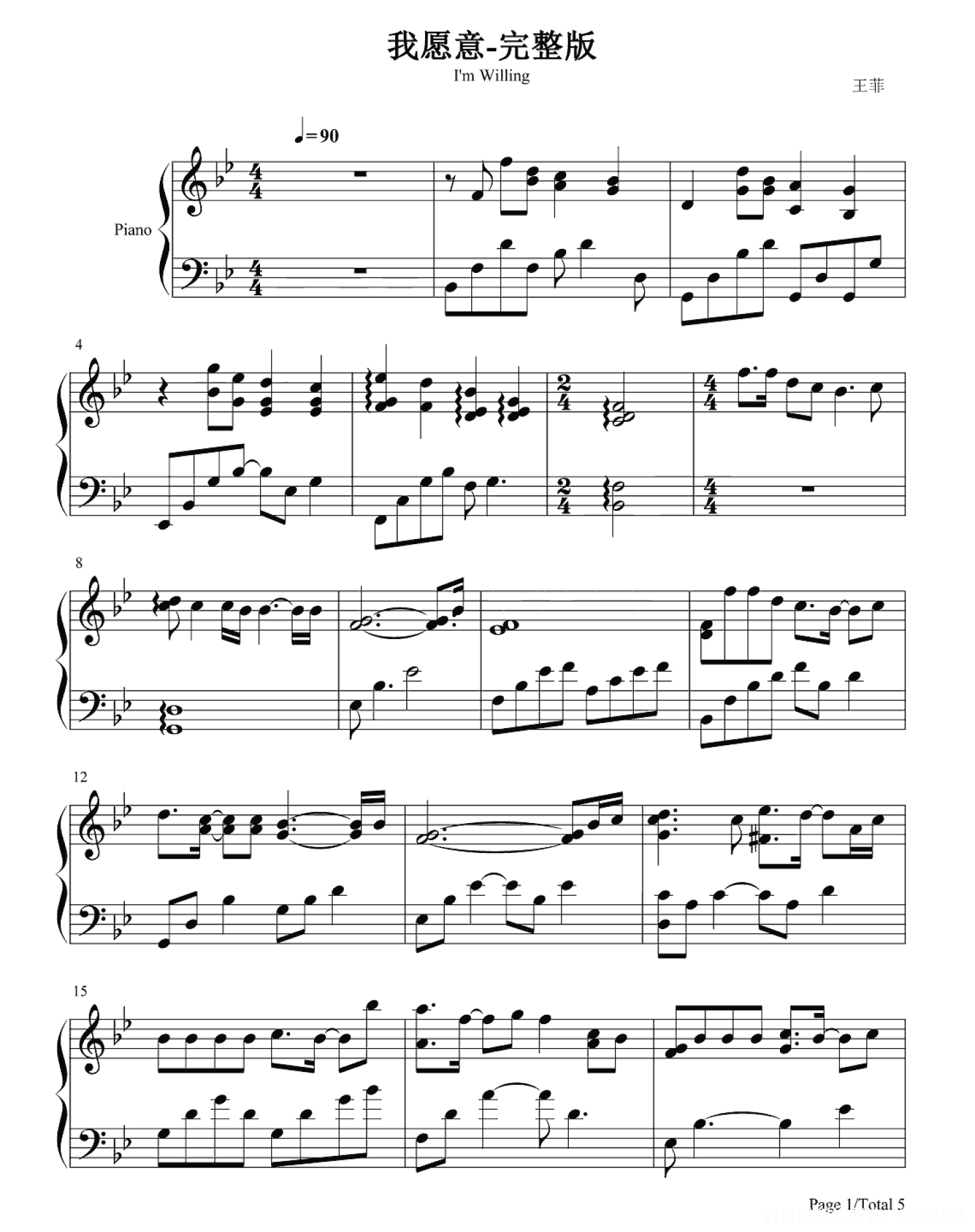 我愿意钢琴谱 - 王菲