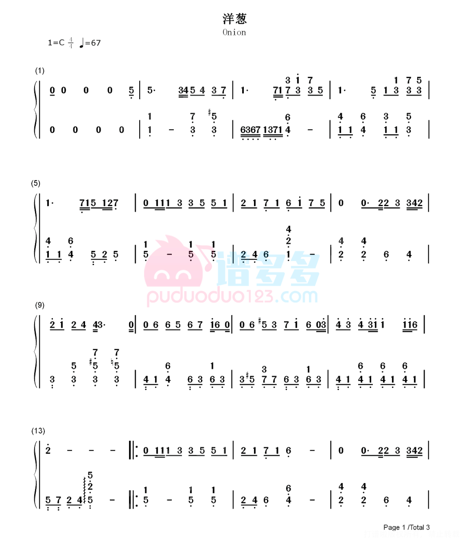 曲谱介绍: 本曲谱是由杨宗纬演唱《洋葱》的钢琴谱,五线谱+双手简谱,完整版共6张PNG图高清图片谱。《洋葱》是杨宗纬专辑《鸽子》中的歌曲,非常好听,《中国好声音》平安演唱曲目,希望大家喜欢。