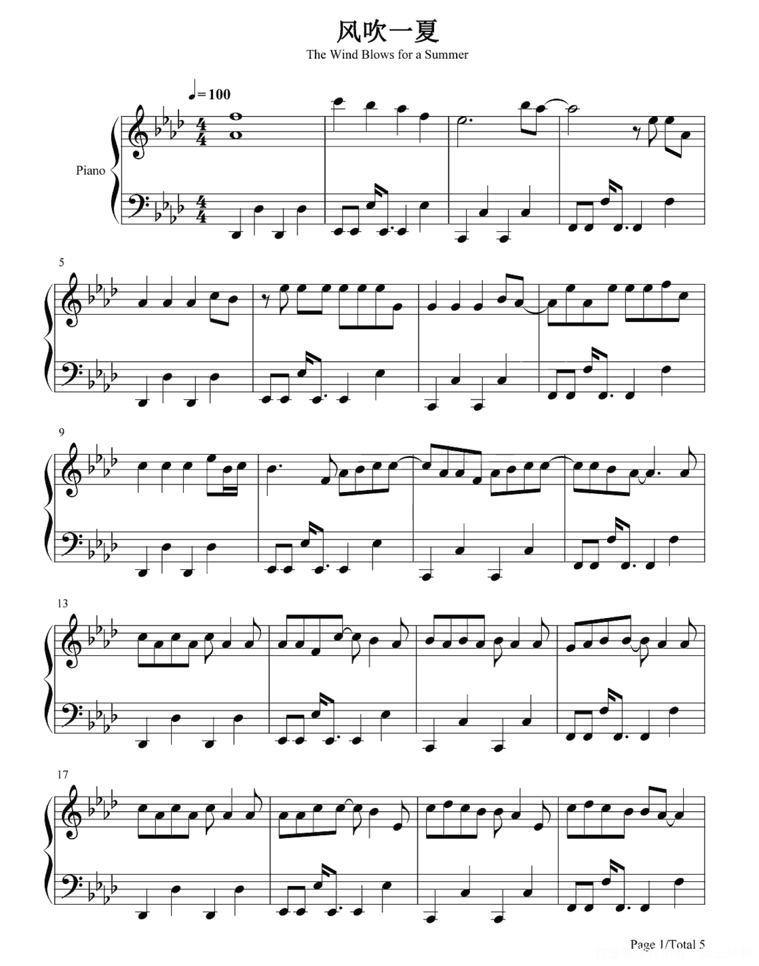 风吹一夏钢琴谱 - DP龙猪/Swei水/Rays陈袁