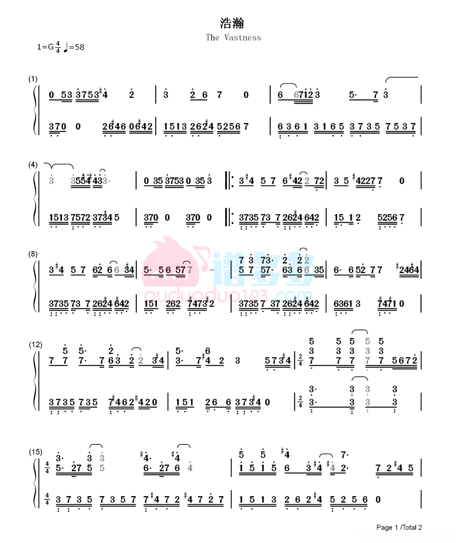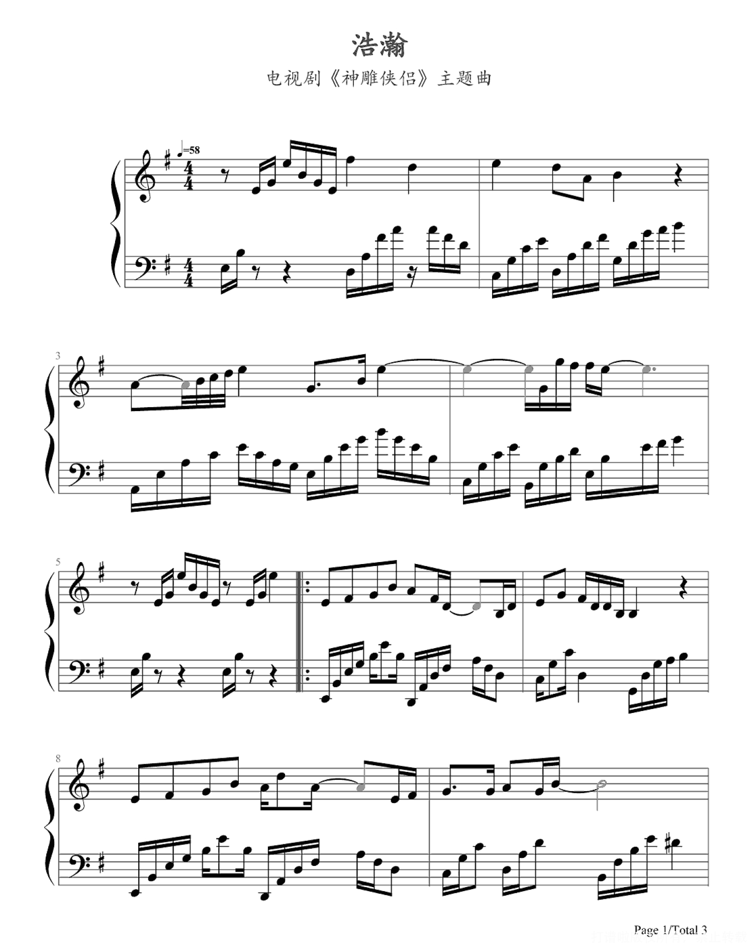 曲谱介绍: 本曲谱是《浩瀚》的钢琴谱,五线谱+双手简谱,完整版共5张PNG图高清图片谱。歌曲是由于正作词,谭旋作曲,张杰演唱。该曲为于正电视剧《神雕侠侣》的主题曲。《浩瀚》歌词中充斥着“好汉不提当年勇,只想问你懂不懂”等直白词句,网友纷纷表示“这个词太美我不敢看”。 歌词中“为你心动,为你吟颂,一曲高歌诉尽情衷。 来势汹涌,去时想通,人生不过一场好梦”更是直接地表露心声,写出了人在江湖的身不由己以及对过往快意恩仇的潇洒释然。实力歌手张杰用他霸气的嗓音、宽广的音域引领我们进入了一个既有腥风血雨,却又充满儿女情长的武侠世界——潇洒坦荡的侠义里,实有荡气回肠的情感爆发。