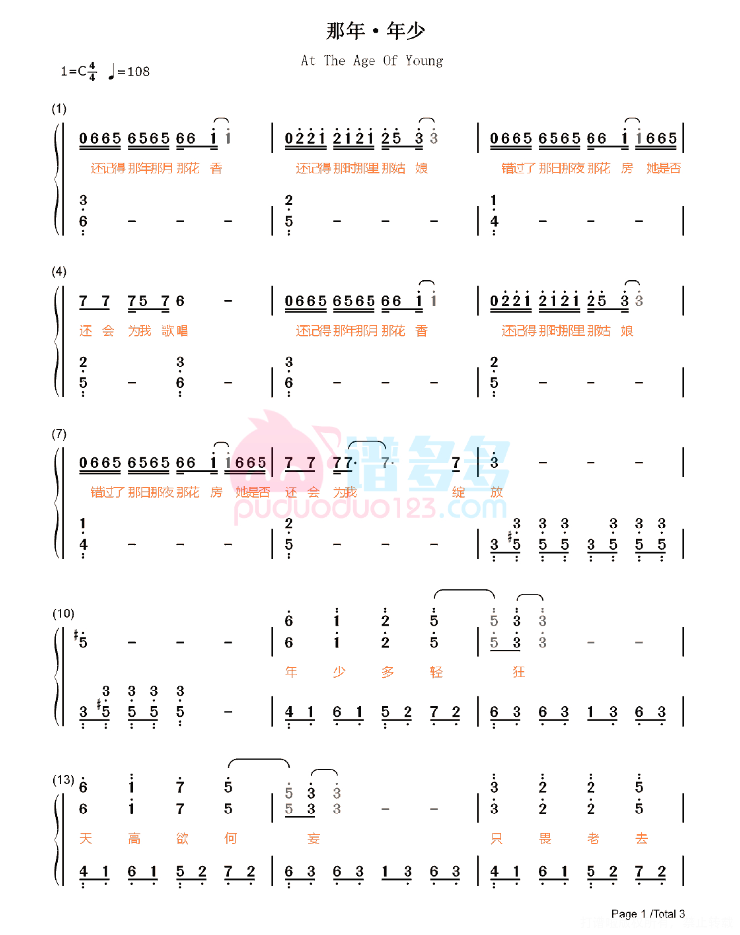 曲谱介绍: 本曲谱是由宋宇宁作词、作曲并演唱《那年•年少》的钢琴谱,五线谱+双手简谱,完整版共6张PNG图高清图片谱。抖音“还记得那年那月那花香 还记得那时那里那姑娘”出自歌曲《那年•年少》。这是宋宇宁在《好声音》第九季的节目的参赛作品,并且还获得了当时现场观众的大力支持。 作为好声音第一位进入决赛的原创歌手,宋宇宁以《那年•年少》的震撼舞台表现征服全场,一举闯入五强行列。“年少多轻狂,天高欲何妄。”歌曲淋漓尽致传递着少年那股顽强自信、永不言败的骄傲。 宋宇宁人歌合一的完美演绎,获得导师李健极高评价:“完全绽放了自己,像歌词一样。”酷狗歌曲评论区的网友各种花式夸奖:“简直发现了一个宝藏、戏腔高音绝绝子、神仙颜值拥有神仙声音、好听到爆炸”。