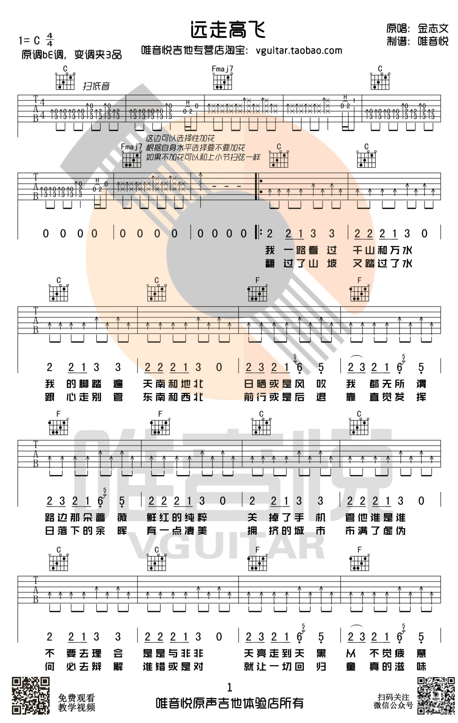 曲谱介绍: 远走高飞吉他谱,金志文演唱,原调bE调,变调夹夹三品,C调指法,本首歌和弦架构比较好记谱,就是扫弦低音部分要多加控制。一首年度洗脑神曲,曲风偏向于公路、乡村、轻摇滚,风格明快跳跃、轻松雅致,仿佛能通过看到旅途中的风景。除了独唱版以外,另有金志文、徐佳莹的男女声合唱版本。
