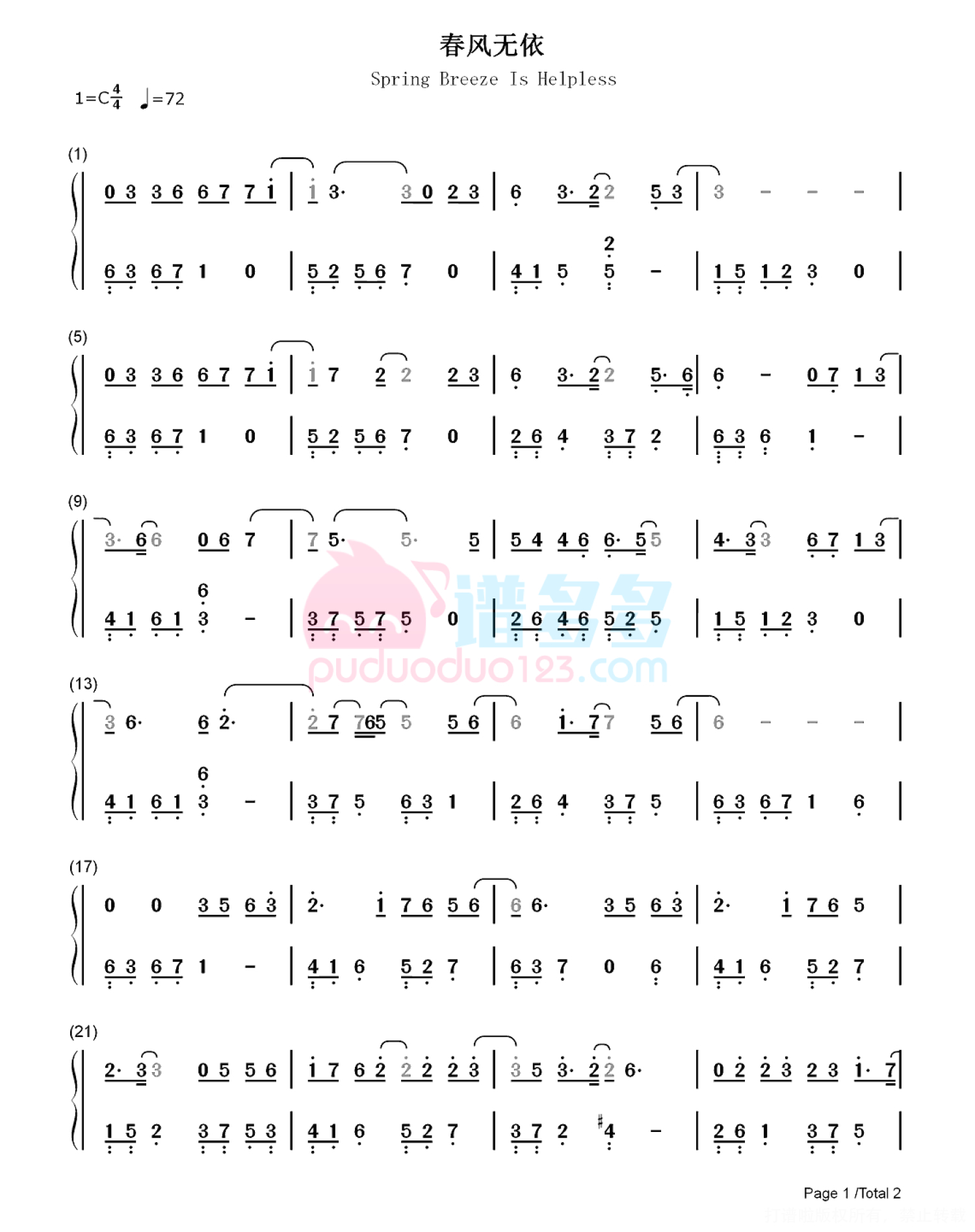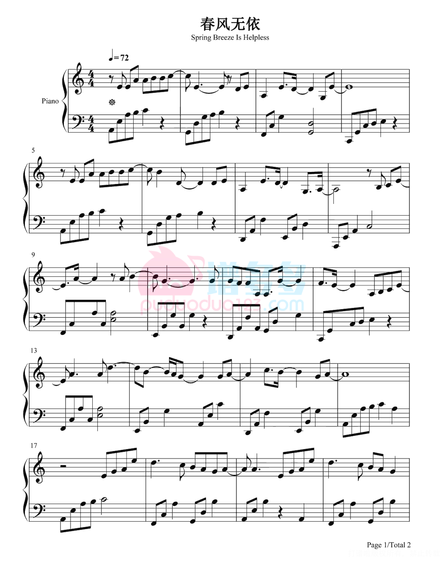 曲谱介绍: 本曲谱是《春风无依》的钢琴谱,五线谱+双后简谱,完整版共4张PNG图高清图片谱。歌曲由李俊宜、浅紫作词,姜帆作曲,司南演唱。该歌曲是古装爱情剧《雁归西窗月》的插曲。 《雁归西窗月》该剧讲述了霸道郡王赵孝谦与率真少女谢小满的乌龙甜怼恋,两人从开始的欢喜冤家到逐渐相知相守,携手历经坎坷,冲破重重阻碍,最终收获了一段浪漫的爱情故事。