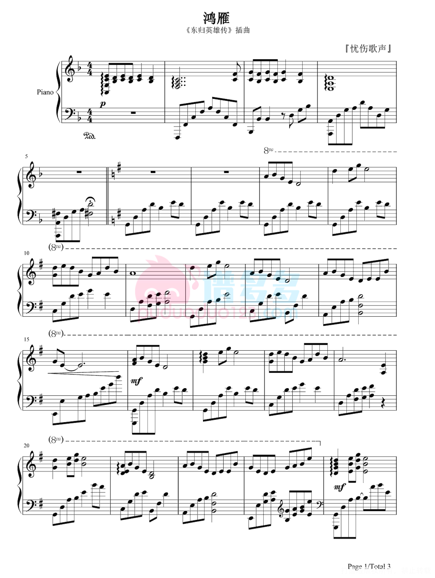 曲谱介绍: 本曲谱是《鸿雁》的钢琴谱,五线谱共3张PNG图高清图片谱。歌曲由额尔古纳乐队演唱,是电视剧《东归英雄传》的插曲,歌曲浑厚悠远,深具蒙古族音乐特色。 《 他们的歌声里有你的乡愁,有你的成长,于是家乡就成了每个人心底最柔软最美好的缱绻。同时,这也是一个寄情于草原的男人自语。一个人,一杯酒,独对苍天,想一想曾经的过往,用力的遥望未来,那里是不是真的有彩虹挂在天堂。悠远蜿蜒,直抵内心。