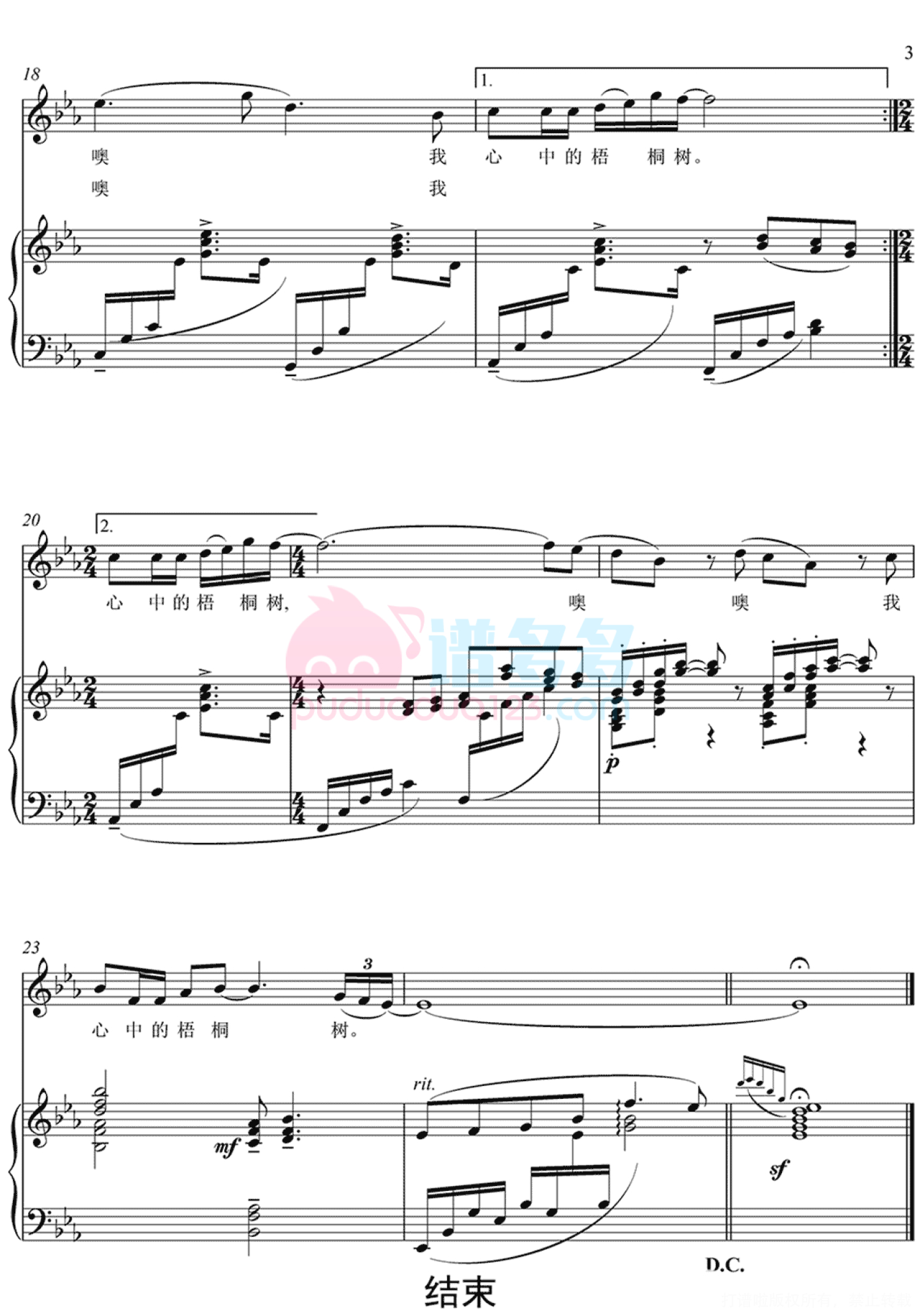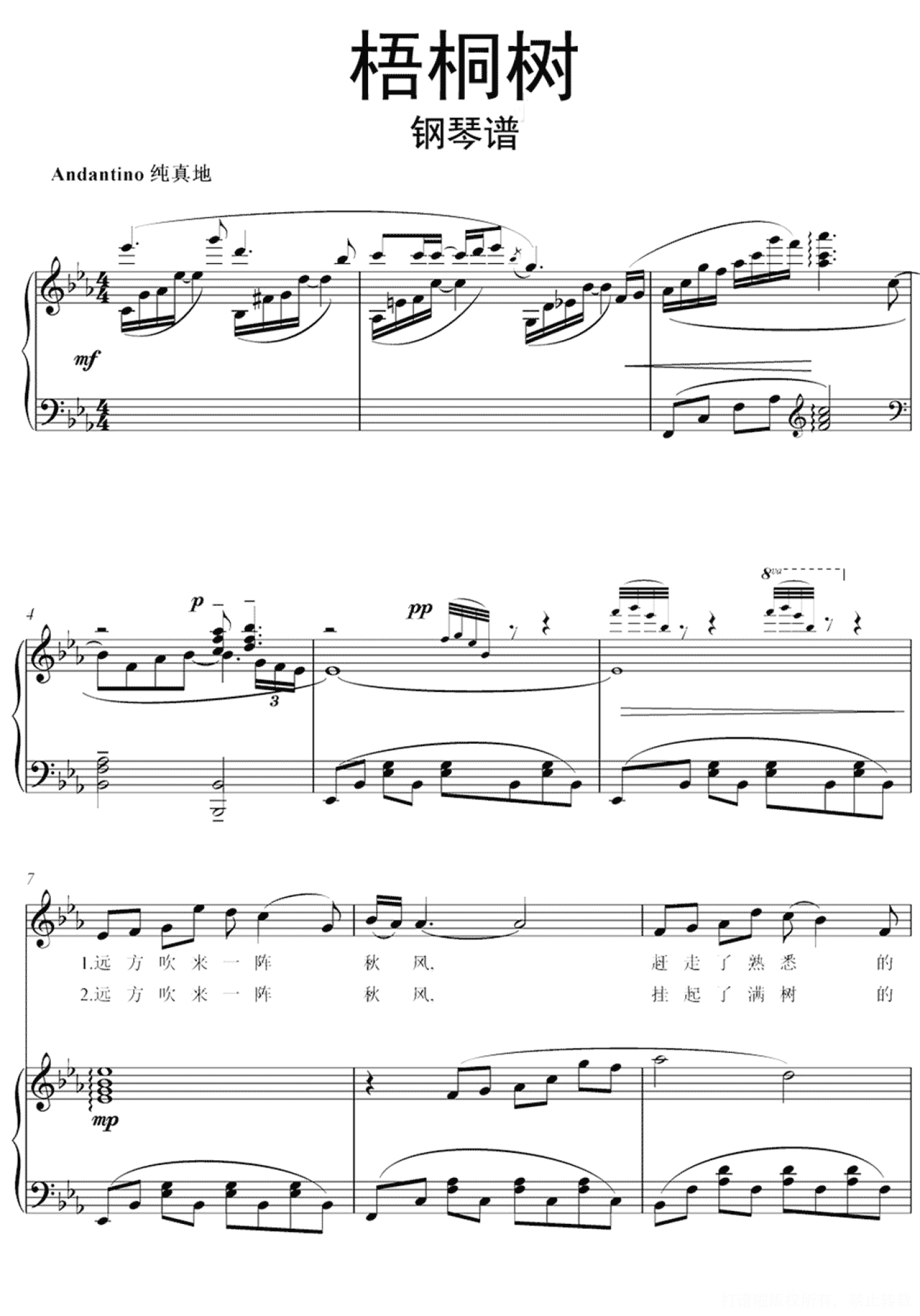 曲谱介绍: 陈燕《梧桐树》钢琴谱,由谱友精心编配制谱,完整版共3张PNG格式图片五线谱。歌曲由陈道斌作词,栾凯作曲。除了《梧桐树》高清版钢琴谱,打谱啦还收录了更多热门歌曲不同类型或格式的曲谱,欢迎您浏览及分享。