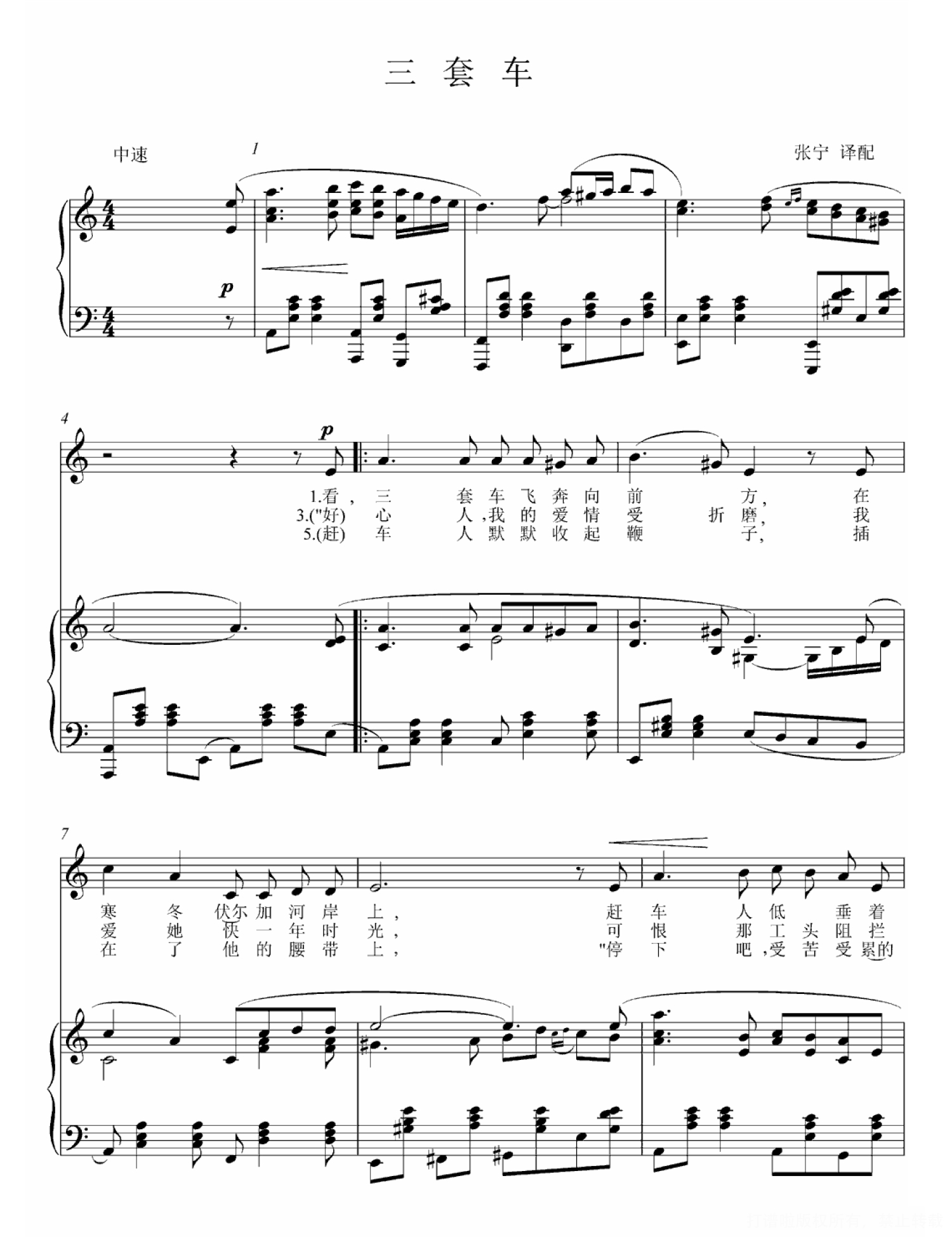 曲谱介绍: 本曲谱是俄罗斯民歌《三套车》钢琴谱,C调版高清正谱,由张宁译配。《三套车》这首歌曲主要表现马车夫深受欺凌的悲惨生活,旋律比较忧伤,给人苍凉的感觉,但也很美,有着诗一般的味道。 《三套车》最早的版本由于某种原因,歌词翻译与原文有明显不合之处,如:原文有六段,而中文译本只有三段;原文是夺走“心上人尼娜”,而并非“老马”,后来,张宁先生又重新进行迻译,既忠实于原文,又适于演唱,富有诗意。 男中音歌唱演员廖昌永在他的《俄罗斯经典歌曲》专辑中,演唱了这首《三套车》中文版歌曲。