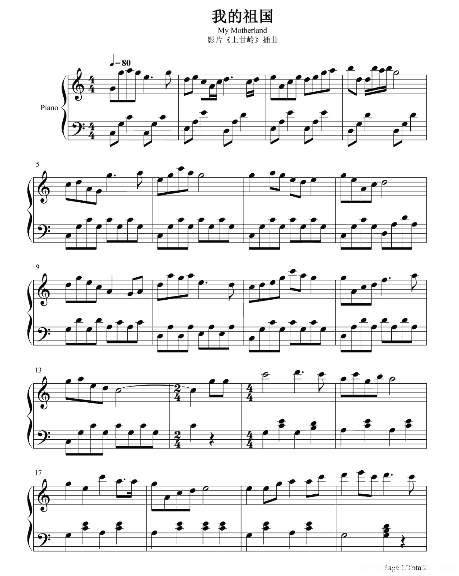 曲谱介绍: 该曲谱是高清版《我的祖国》钢琴谱,由谱友精心编配制谱并分享。完整版《我的祖国》钢琴谱,共2张PNG格式图片五线谱。歌曲是由乔羽作词,刘炽作曲,郭兰英演唱的一首爱国主义歌曲。是电影《上甘岭》的主题歌。 这是一首优秀的抒情歌曲,深切地表达了浓烈的爱国主义思想,歌曲前一部分以抒情的女高音形式,一种波涌而来的思乡之情,洋溢在甜美的歌声中,使人仿佛看到祖国江河帆影漂移、田野稻浪飘香的美丽景色。后一部分用混声合唱形式,与前段形成鲜明的对比,唱出了“这是美丽的祖国”的主题,激情澎湃,气势磅礴。