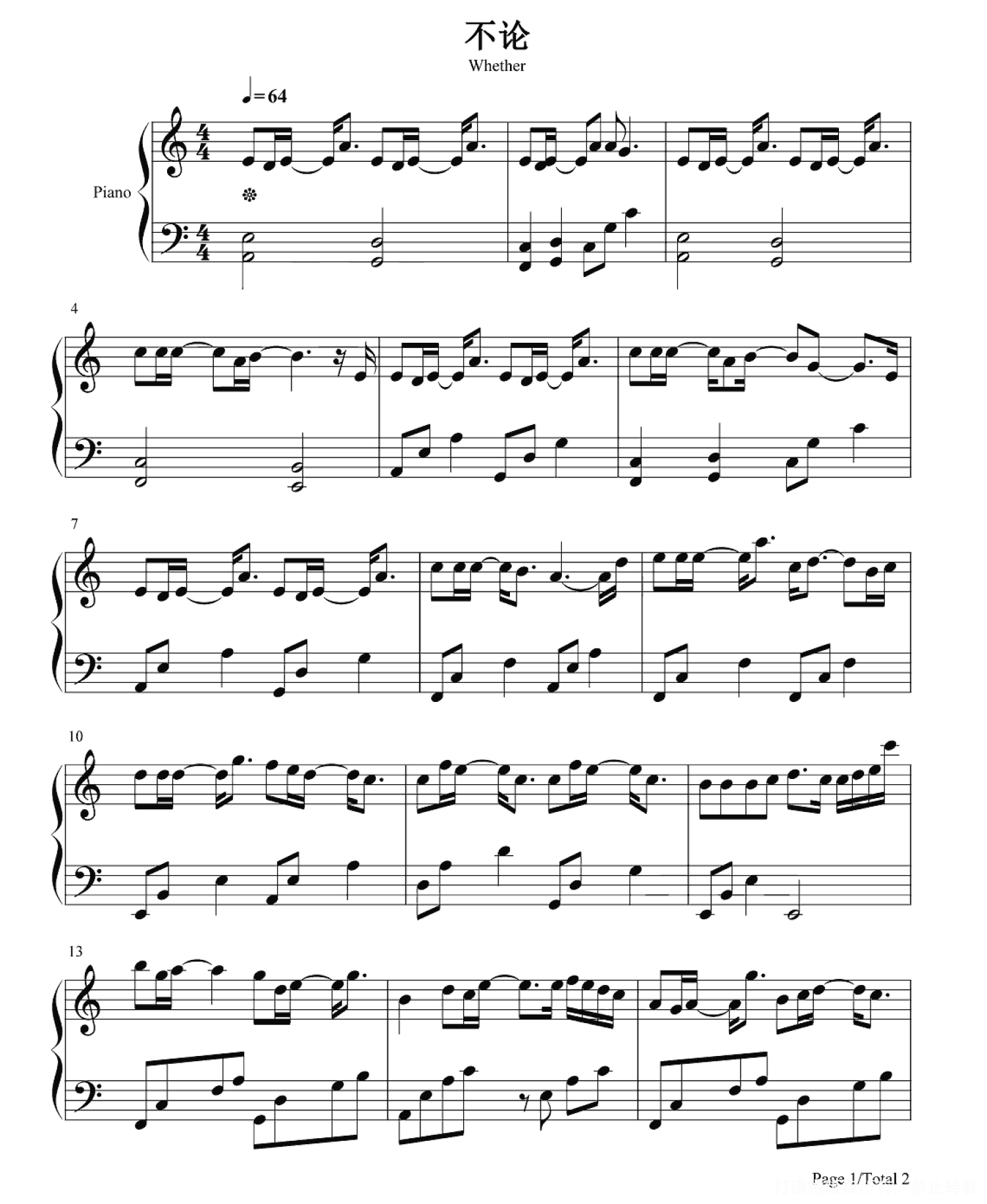 曲谱介绍: 该曲谱是高清版《不论》钢琴谱,由谱友精心编配制谱并分享,共2张PNG格式图片五线谱。歌曲是由江辉作词,朱海威作曲,阿YueYue演唱。此曲也是电视剧《周生如故》漼时宜人物推广曲。另外打谱啦还提供了更多热门歌曲不同类型或格式的曲谱,欢迎您浏览及分享。 剧中周生辰和漼时宜的虐恋,非为虐而虐,更近于悲剧里不可抵抗的宿命。在宿命面前缴械投降,那不叫悲剧那叫苦情;悲剧之所以激发观众的崇高感,正在于人物对宿命的拼命抵抗,然而最终还是失败了。这固然衬托了宿命的强大和无常,但人性的光辉、爱情之唯美纯粹,也因此得到凸显。
