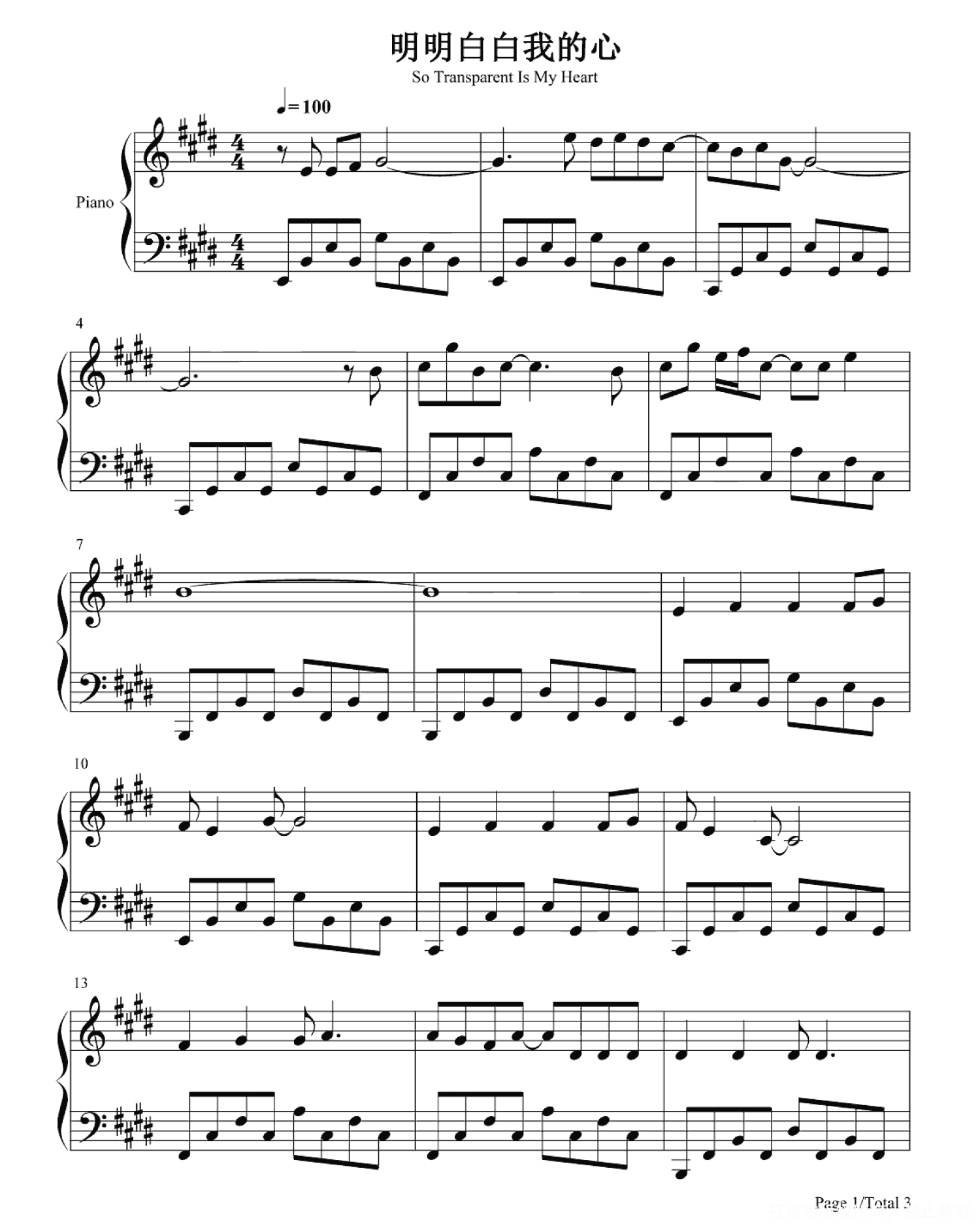 曲谱介绍: 成龙《明明白白我的心》钢琴谱,由谱友精心编配制谱,完整版共3张PNG格式图片五线谱。歌曲独具风韵,婉转悠扬。在上世纪九十年代特别风行,几乎是卡拉OK的必唱曲目。歌曲反映了红男绿女的真实情感,唱出了压在心灵深处的情感独白。 此曲由李宗盛作词作曲,成龙和陈淑桦演唱。然而15年后由国内著名音乐制作人赵佳霖和成龙大哥共同改编,跟随成龙新电影《绝地逃亡》重燃歌坛。重编后的《明明白白我的心2016》动感十足,节奏明快,洗脑程度堪比“小苹果”。成龙大哥多元化的演唱、明快的节奏构成一曲朗朗上口又有趣味的歌曲。