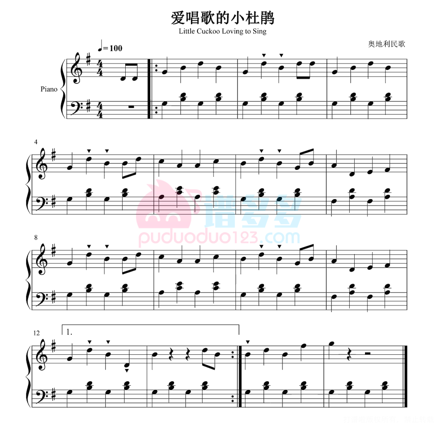 曲谱介绍: 该版本的《爱唱歌的小杜鹃》钢琴谱是高清完整版五线谱,共1张PNG格式图片谱。这是一首奥地利民歌,它结构短小简单,旋律优美流畅,情绪欢快活泼,非常适合孩子们学唱。 奥地利民歌《爱唱歌的小杜鹃》钢琴五线谱 歌曲中加入的“咕咕”叫声使整首歌曲充满了童趣,能使学生很快进入情境,感受鸟儿可爱的音乐形象,从而增强对音乐的喜爱。