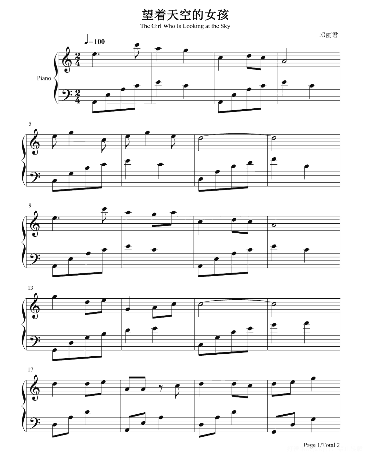 望着天空的女孩钢琴谱 - 邓丽君