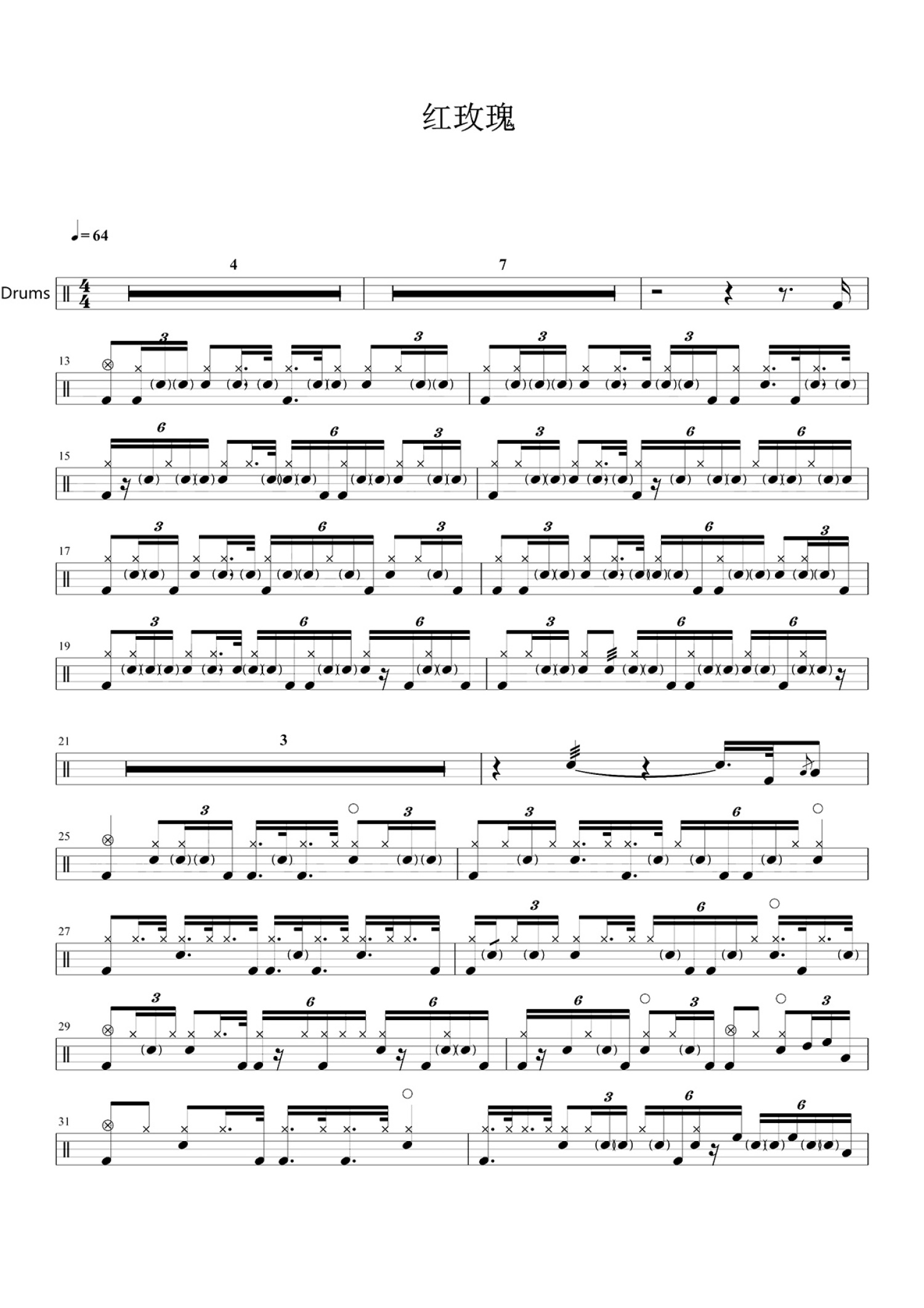 红玫瑰鼓谱 - 陈奕迅 - 架子鼓谱