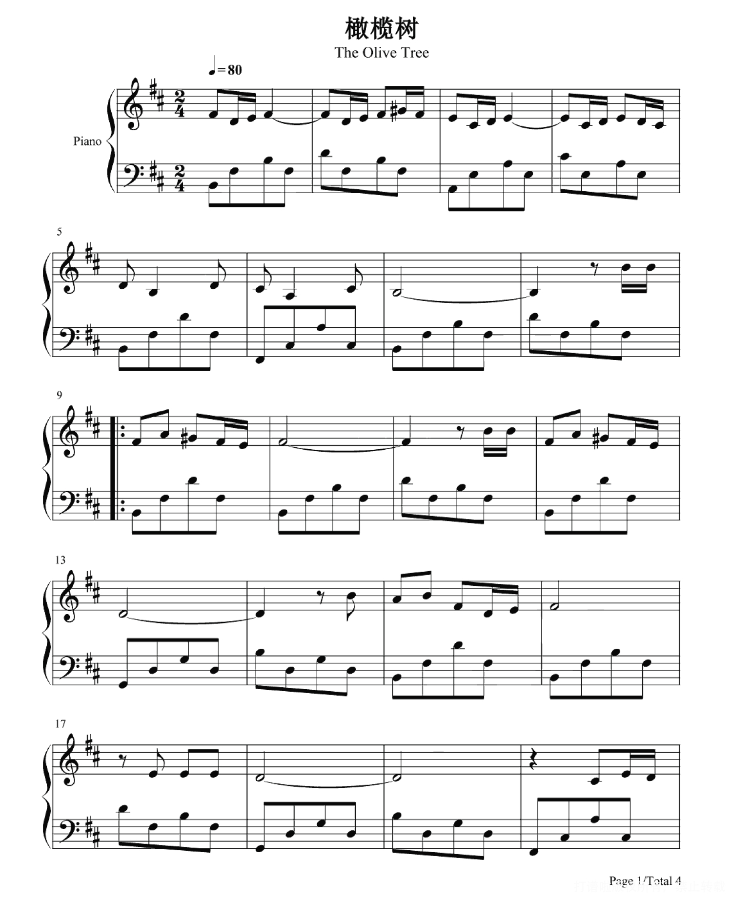 曲谱介绍: 齐豫《橄榄树》钢琴谱,由谱友精心编配制谱,完整版共4张PNG格式图片五线谱。除了《橄榄树》高清版钢琴谱,打谱啦还收录了齐豫更多热门歌曲不同类型或格式的曲谱,欢迎您浏览及分享。