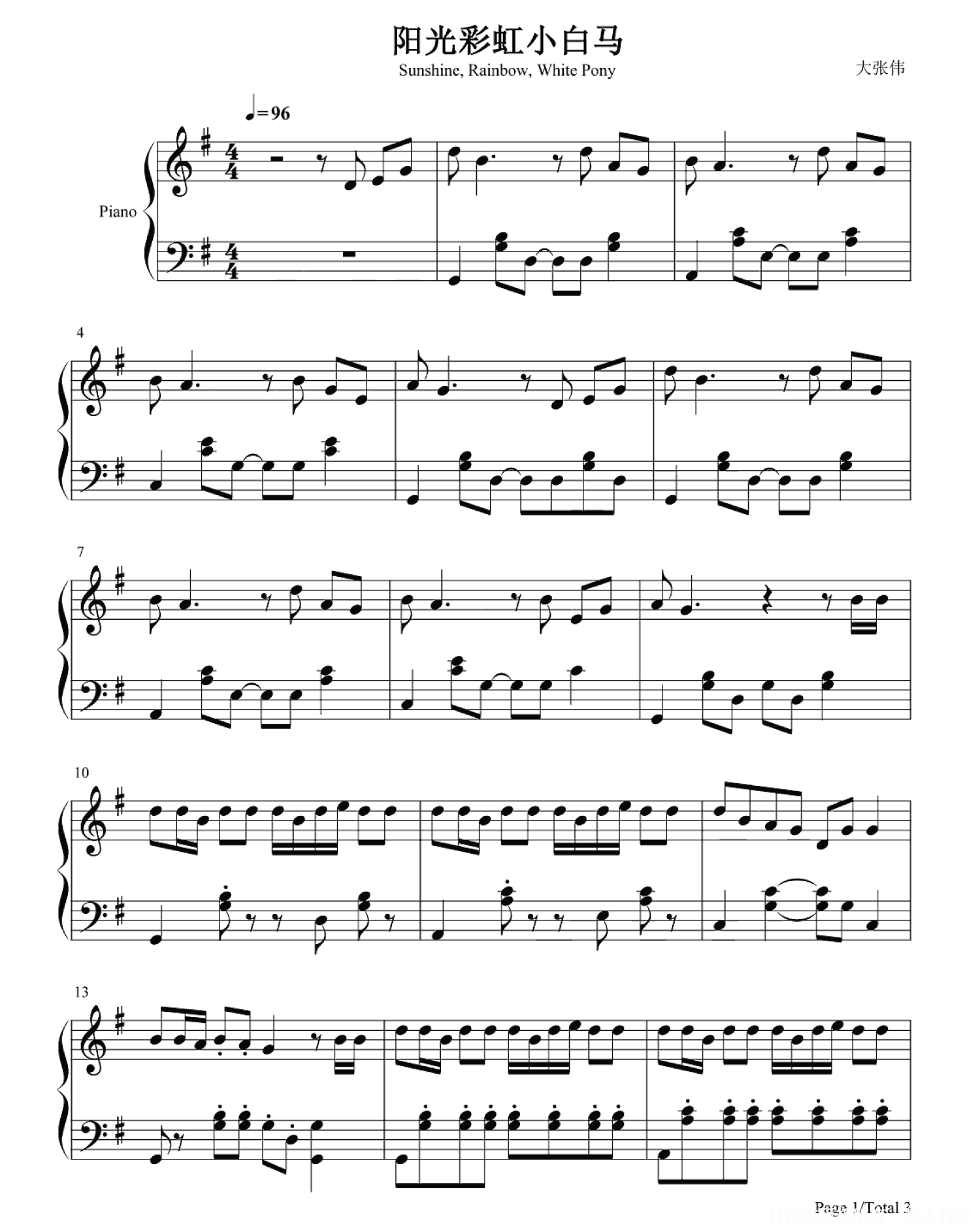 曲谱介绍: 打谱啦为您提供《阳光彩虹小白马》的高清版钢琴谱,由谱友精心编配制谱并分享,共3张PNG格式图片五线谱。歌曲是由大张伟作词、作曲并演唱的歌曲。此曲以简单的旋律、洗脑的歌词而迅速走红。 《阳光彩虹小白马》是一首非常有彩虹范儿的歌曲,向大家传递的是快乐和正能量,正是这样走心的创作,让所有的听众从俏皮的歌曲中,能感受到实实在在的温暖。