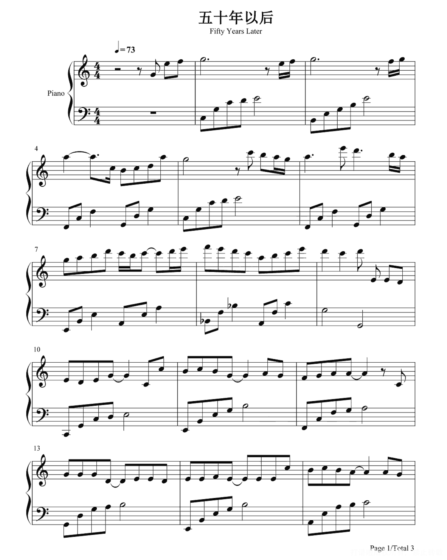曲谱介绍: 海来阿木《五十年以后》钢琴谱,由谱友精心编配制谱,完整版共3张PNG格式图片五线谱。除了《五十年以后》高清版钢琴谱,打谱啦还为大家提供了海来阿木更多热门歌曲的简谱、吉他谱等高清曲谱,欢迎查询。 在歌曲《五十年以后》中,海来阿木娓娓唱来,用第一人称的视角,讲述着自己人生长河中的爱情印记,从刚开始的恋情,直到五十年以后白头偕老的深情,海来阿木在歌曲中用大跨度的时间和空间转换,冲击着听者的神经,极具画面感地诠释出世间最真实真挚的完美爱情。